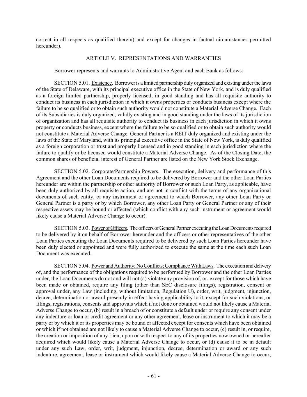 - 61 - correct in all respects as qualified therein) and except for changes in factual circumstances permitted hereunder). ARTICLE V. REPRESENTATIONS AND WARRANTIES Borrower represents and warrants to Administrative Agent and each Bank as follows: SECTION 5.01. Existence. Borrower is a limited partnership duly organized and existing under the laws of the State of Delaware, with its principal executive office in the State of New York, and is duly qualified as a foreign limited partnership, properly licensed, in good standing and has all requisite authority to conduct its business in each jurisdiction in which it owns properties or conducts business except where the failure to be so qualified or to obtain such authority would not constitute a Material Adverse Change. Each of its Subsidiaries is duly organized, validly existing and in good standing under the laws of its jurisdiction of organization and has all requisite authority to conduct its business in each jurisdiction in which it owns property or conducts business, except where the failure to be so qualified or to obtain such authority would not constitute a Material Adverse Change. General Partner is a REIT duly organized and existing under the laws of the State of Maryland, with its principal executive office in the State of New York, is duly qualified as a foreign corporation or trust and properly licensed and in good standing in each jurisdiction where the failure to qualify or be licensed would constitute a Material Adverse Change. As of the Closing Date, the common shares of beneficial interest of General Partner are listed on the New York Stock Exchange. SECTION 5.02. Corporate/Partnership Powers. The execution, delivery and performance of this Agreement and the other Loan Documents required to be delivered by Borrower and the other Loan Parties hereunder are within the partnership or other authority of Borrower or such Loan Party, as applicable, have been duly authorized by all requisite action, and are not in conflict with the terms of any organizational documents of such entity, or any instrument or agreement to which Borrower, any other Loan Party or General Partner is a party or by which Borrower, any other Loan Party or General Partner or any of their respective assets may be bound or affected (which conflict with any such instrument or agreement would likely cause a Material Adverse Change to occur). SECTION 5.03. Power of Officers. The officers of General Partner executing the Loan Documents required to be delivered by it on behalf of Borrower hereunder and the officers or other representatives of the other Loan Parties executing the Loan Documents required to be delivered by such Loan Parties hereunder have been duly elected or appointed and were fully authorized to execute the same at the time each such Loan Document was executed. SECTION 5.04. Power and Authority; No Conflicts; Compliance With Laws. The execution and delivery of, and the performance of the obligations required to be performed by Borrower and the other Loan Parties under, the Loan Documents do not and will not (a) violate any provision of, or, except for those which have been made or obtained, require any filing (other than SEC disclosure filings), registration, consent or approval under, any Law (including, without limitation, Regulation U), order, writ, judgment, injunction, decree, determination or award presently in effect having applicability to it, except for such violations, or filings, registrations, consents and approvals which if not done or obtained would not likely cause a Material Adverse Change to occur, (b) result in a breach of or constitute a default under or require any consent under any indenture or loan or credit agreement or any other agreement, lease or instrument to which it may be a party or by which it or its properties may be bound or affected except for consents which have been obtained or which if not obtained are not likely to cause a Material Adverse Change to occur, (c) result in, or require, the creation or imposition of any Lien, upon or with respect to any of its properties now owned or hereafter acquired which would likely cause a Material Adverse Change to occur, or (d) cause it to be in default under any such Law, order, writ, judgment, injunction, decree, determination or award or any such indenture, agreement, lease or instrument which would likely cause a Material Adverse Change to occur;