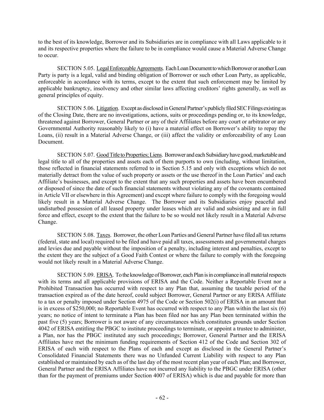 - 62 - to the best of its knowledge, Borrower and its Subsidiaries are in compliance with all Laws applicable to it and its respective properties where the failure to be in compliance would cause a Material Adverse Change to occur. SECTION 5.05. Legal Enforceable Agreements. Each Loan Document to which Borrower or another Loan Party is party is a legal, valid and binding obligation of Borrower or such other Loan Party, as applicable, enforceable in accordance with its terms, except to the extent that such enforcement may be limited by applicable bankruptcy, insolvency and other similar laws affecting creditors’ rights generally, as well as general principles of equity. SECTION 5.06. Litigation. Except as disclosed in General Partner’s publicly filed SEC Filings existing as of the Closing Date, there are no investigations, actions, suits or proceedings pending or, to its knowledge, threatened against Borrower, General Partner or any of their Affiliates before any court or arbitrator or any Governmental Authority reasonably likely to (i) have a material effect on Borrower’s ability to repay the Loans, (ii) result in a Material Adverse Change, or (iii) affect the validity or enforceability of any Loan Document. SECTION 5.07. Good Title to Properties; Liens. Borrower and each Subsidiary have good, marketable and legal title to all of the properties and assets each of them purports to own (including, without limitation, those reflected in financial statements referred to in Section 5.15 and only with exceptions which do not materially detract from the value of such property or assets or the use thereof in the Loan Parties’ and each Affiliate’s businesses, and except to the extent that any such properties and assets have been encumbered or disposed of since the date of such financial statements without violating any of the covenants contained in Article VII or elsewhere in this Agreement) and except where failure to comply with the foregoing would likely result in a Material Adverse Change. The Borrower and its Subsidiaries enjoy peaceful and undisturbed possession of all leased property under leases which are valid and subsisting and are in full force and effect, except to the extent that the failure to be so would not likely result in a Material Adverse Change. SECTION 5.08. Taxes. Borrower, the other Loan Parties and General Partner have filed all tax returns (federal, state and local) required to be filed and have paid all taxes, assessments and governmental charges and levies due and payable without the imposition of a penalty, including interest and penalties, except to the extent they are the subject of a Good Faith Contest or where the failure to comply with the foregoing would not likely result in a Material Adverse Change. SECTION 5.09. ERISA. To the knowledge of Borrower, each Plan is in compliance in all material respects with its terms and all applicable provisions of ERISA and the Code. Neither a Reportable Event nor a Prohibited Transaction has occurred with respect to any Plan that, assuming the taxable period of the transaction expired as of the date hereof, could subject Borrower, General Partner or any ERISA Affiliate to a tax or penalty imposed under Section 4975 of the Code or Section 502(i) of ERISA in an amount that is in excess of $250,000; no Reportable Event has occurred with respect to any Plan within the last six (6) years; no notice of intent to terminate a Plan has been filed nor has any Plan been terminated within the past five (5) years; Borrower is not aware of any circumstances which constitutes grounds under Section 4042 of ERISA entitling the PBGC to institute proceedings to terminate, or appoint a trustee to administer, a Plan, nor has the PBGC instituted any such proceedings; Borrower, General Partner and the ERISA Affiliates have met the minimum funding requirements of Section 412 of the Code and Section 302 of ERISA of each with respect to the Plans of each and except as disclosed in the General Partner’s Consolidated Financial Statements there was no Unfunded Current Liability with respect to any Plan established or maintained by each as of the last day of the most recent plan year of each Plan; and Borrower, General Partner and the ERISA Affiliates have not incurred any liability to the PBGC under ERISA (other than for the payment of premiums under Section 4007 of ERISA) which is due and payable for more than
