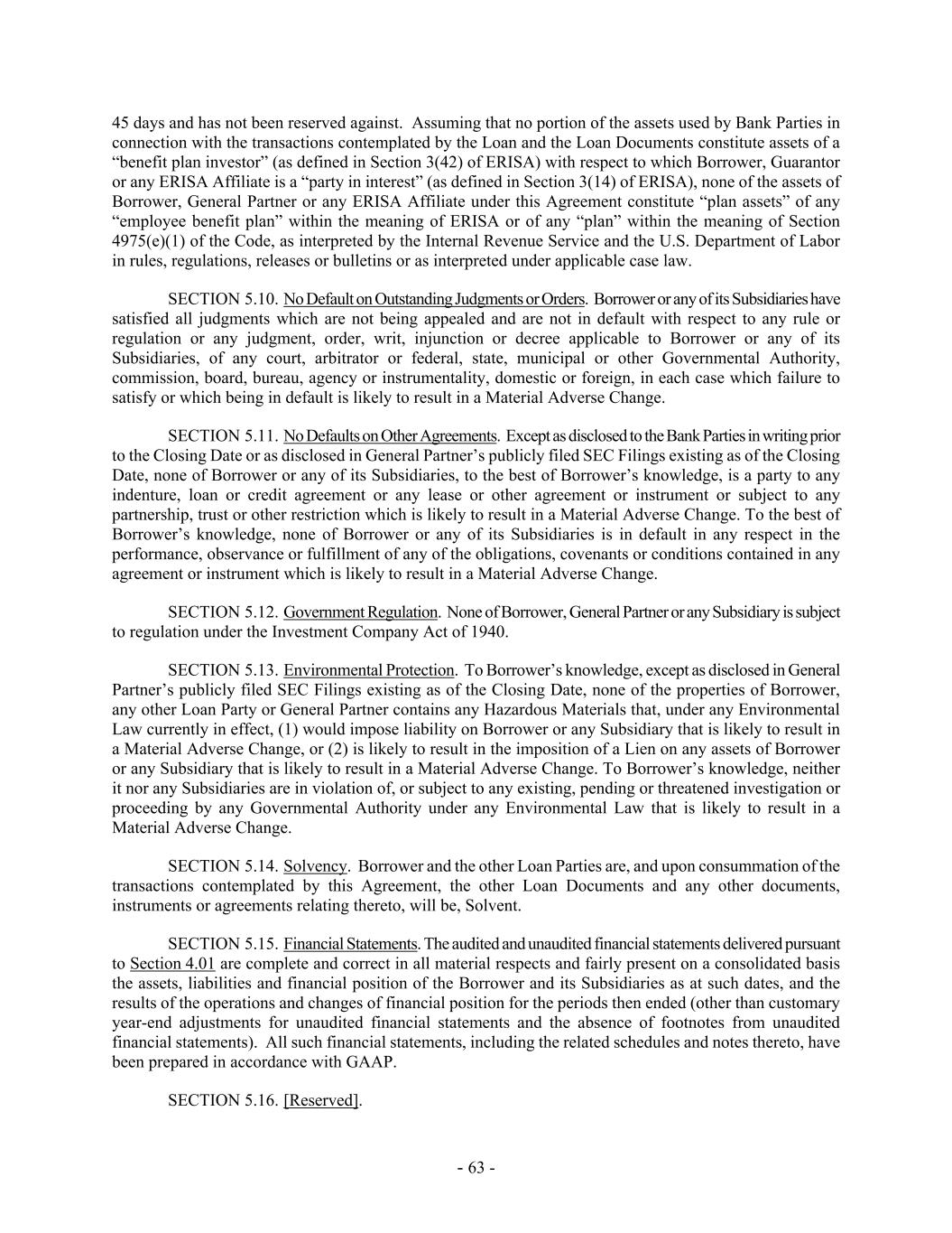 - 63 - 45 days and has not been reserved against. Assuming that no portion of the assets used by Bank Parties in connection with the transactions contemplated by the Loan and the Loan Documents constitute assets of a “benefit plan investor” (as defined in Section 3(42) of ERISA) with respect to which Borrower, Guarantor or any ERISA Affiliate is a “party in interest” (as defined in Section 3(14) of ERISA), none of the assets of Borrower, General Partner or any ERISA Affiliate under this Agreement constitute “plan assets” of any “employee benefit plan” within the meaning of ERISA or of any “plan” within the meaning of Section 4975(e)(1) of the Code, as interpreted by the Internal Revenue Service and the U.S. Department of Labor in rules, regulations, releases or bulletins or as interpreted under applicable case law. SECTION 5.10. No Default on Outstanding Judgments or Orders. Borrower or any of its Subsidiaries have satisfied all judgments which are not being appealed and are not in default with respect to any rule or regulation or any judgment, order, writ, injunction or decree applicable to Borrower or any of its Subsidiaries, of any court, arbitrator or federal, state, municipal or other Governmental Authority, commission, board, bureau, agency or instrumentality, domestic or foreign, in each case which failure to satisfy or which being in default is likely to result in a Material Adverse Change. SECTION 5.11. No Defaults on Other Agreements. Except as disclosed to the Bank Parties in writing prior to the Closing Date or as disclosed in General Partner’s publicly filed SEC Filings existing as of the Closing Date, none of Borrower or any of its Subsidiaries, to the best of Borrower’s knowledge, is a party to any indenture, loan or credit agreement or any lease or other agreement or instrument or subject to any partnership, trust or other restriction which is likely to result in a Material Adverse Change. To the best of Borrower’s knowledge, none of Borrower or any of its Subsidiaries is in default in any respect in the performance, observance or fulfillment of any of the obligations, covenants or conditions contained in any agreement or instrument which is likely to result in a Material Adverse Change. SECTION 5.12. Government Regulation. None of Borrower, General Partner or any Subsidiary is subject to regulation under the Investment Company Act of 1940. SECTION 5.13. Environmental Protection. To Borrower’s knowledge, except as disclosed in General Partner’s publicly filed SEC Filings existing as of the Closing Date, none of the properties of Borrower, any other Loan Party or General Partner contains any Hazardous Materials that, under any Environmental Law currently in effect, (1) would impose liability on Borrower or any Subsidiary that is likely to result in a Material Adverse Change, or (2) is likely to result in the imposition of a Lien on any assets of Borrower or any Subsidiary that is likely to result in a Material Adverse Change. To Borrower’s knowledge, neither it nor any Subsidiaries are in violation of, or subject to any existing, pending or threatened investigation or proceeding by any Governmental Authority under any Environmental Law that is likely to result in a Material Adverse Change. SECTION 5.14. Solvency. Borrower and the other Loan Parties are, and upon consummation of the transactions contemplated by this Agreement, the other Loan Documents and any other documents, instruments or agreements relating thereto, will be, Solvent. SECTION 5.15. Financial Statements. The audited and unaudited financial statements delivered pursuant to Section 4.01 are complete and correct in all material respects and fairly present on a consolidated basis the assets, liabilities and financial position of the Borrower and its Subsidiaries as at such dates, and the results of the operations and changes of financial position for the periods then ended (other than customary year-end adjustments for unaudited financial statements and the absence of footnotes from unaudited financial statements). All such financial statements, including the related schedules and notes thereto, have been prepared in accordance with GAAP. SECTION 5.16. [Reserved].
