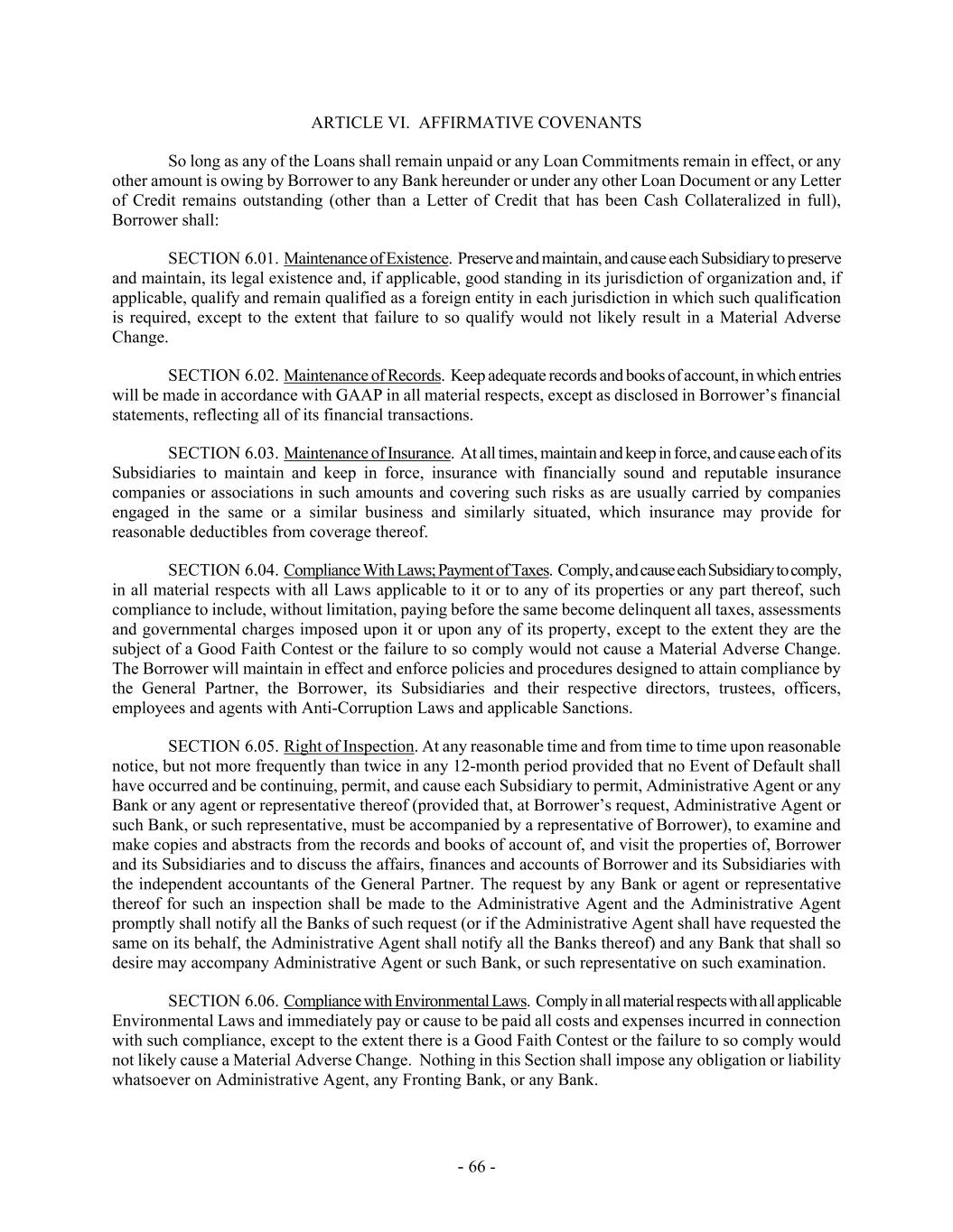 - 66 - ARTICLE VI. AFFIRMATIVE COVENANTS So long as any of the Loans shall remain unpaid or any Loan Commitments remain in effect, or any other amount is owing by Borrower to any Bank hereunder or under any other Loan Document or any Letter of Credit remains outstanding (other than a Letter of Credit that has been Cash Collateralized in full), Borrower shall: SECTION 6.01. Maintenance of Existence. Preserve and maintain, and cause each Subsidiary to preserve and maintain, its legal existence and, if applicable, good standing in its jurisdiction of organization and, if applicable, qualify and remain qualified as a foreign entity in each jurisdiction in which such qualification is required, except to the extent that failure to so qualify would not likely result in a Material Adverse Change. SECTION 6.02. Maintenance of Records. Keep adequate records and books of account, in which entries will be made in accordance with GAAP in all material respects, except as disclosed in Borrower’s financial statements, reflecting all of its financial transactions. SECTION 6.03. Maintenance of Insurance. At all times, maintain and keep in force, and cause each of its Subsidiaries to maintain and keep in force, insurance with financially sound and reputable insurance companies or associations in such amounts and covering such risks as are usually carried by companies engaged in the same or a similar business and similarly situated, which insurance may provide for reasonable deductibles from coverage thereof. SECTION 6.04. Compliance With Laws; Payment of Taxes. Comply, and cause each Subsidiary to comply, in all material respects with all Laws applicable to it or to any of its properties or any part thereof, such compliance to include, without limitation, paying before the same become delinquent all taxes, assessments and governmental charges imposed upon it or upon any of its property, except to the extent they are the subject of a Good Faith Contest or the failure to so comply would not cause a Material Adverse Change. The Borrower will maintain in effect and enforce policies and procedures designed to attain compliance by the General Partner, the Borrower, its Subsidiaries and their respective directors, trustees, officers, employees and agents with Anti-Corruption Laws and applicable Sanctions. SECTION 6.05. Right of Inspection. At any reasonable time and from time to time upon reasonable notice, but not more frequently than twice in any 12-month period provided that no Event of Default shall have occurred and be continuing, permit, and cause each Subsidiary to permit, Administrative Agent or any Bank or any agent or representative thereof (provided that, at Borrower’s request, Administrative Agent or such Bank, or such representative, must be accompanied by a representative of Borrower), to examine and make copies and abstracts from the records and books of account of, and visit the properties of, Borrower and its Subsidiaries and to discuss the affairs, finances and accounts of Borrower and its Subsidiaries with the independent accountants of the General Partner. The request by any Bank or agent or representative thereof for such an inspection shall be made to the Administrative Agent and the Administrative Agent promptly shall notify all the Banks of such request (or if the Administrative Agent shall have requested the same on its behalf, the Administrative Agent shall notify all the Banks thereof) and any Bank that shall so desire may accompany Administrative Agent or such Bank, or such representative on such examination. SECTION 6.06. Compliance with Environmental Laws. Comply in all material respects with all applicable Environmental Laws and immediately pay or cause to be paid all costs and expenses incurred in connection with such compliance, except to the extent there is a Good Faith Contest or the failure to so comply would not likely cause a Material Adverse Change. Nothing in this Section shall impose any obligation or liability whatsoever on Administrative Agent, any Fronting Bank, or any Bank.
