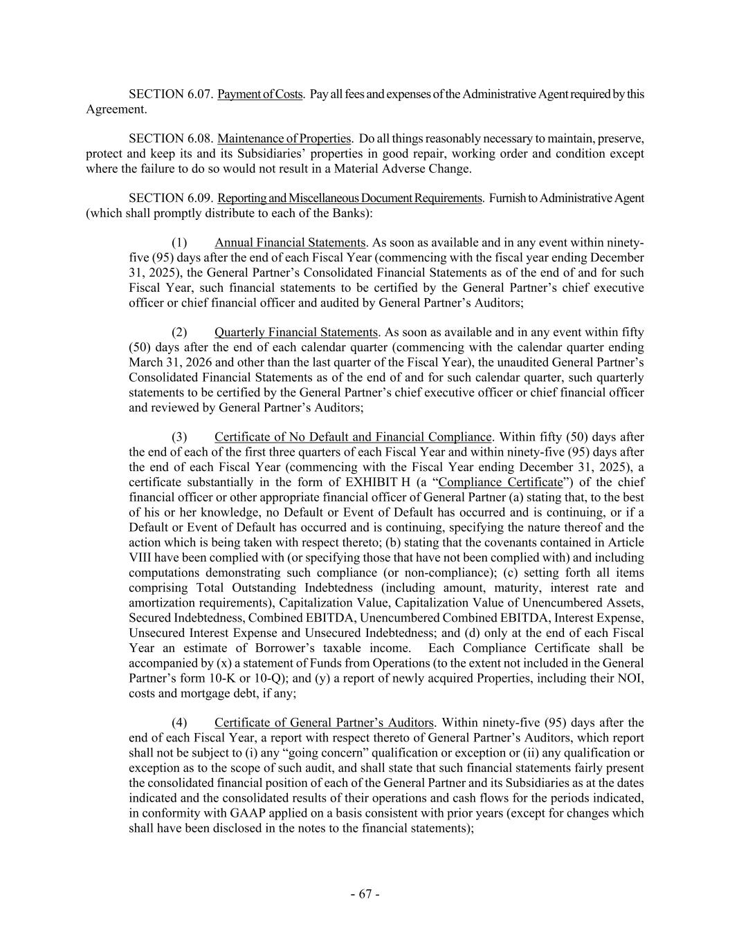 - 67 - SECTION 6.07. Payment of Costs. Pay all fees and expenses of the Administrative Agent required by this Agreement. SECTION 6.08. Maintenance of Properties. Do all things reasonably necessary to maintain, preserve, protect and keep its and its Subsidiaries’ properties in good repair, working order and condition except where the failure to do so would not result in a Material Adverse Change. SECTION 6.09. Reporting and Miscellaneous Document Requirements. Furnish to Administrative Agent (which shall promptly distribute to each of the Banks): (1) Annual Financial Statements. As soon as available and in any event within ninety- five (95) days after the end of each Fiscal Year (commencing with the fiscal year ending December 31, 2025), the General Partner’s Consolidated Financial Statements as of the end of and for such Fiscal Year, such financial statements to be certified by the General Partner’s chief executive officer or chief financial officer and audited by General Partner’s Auditors; (2) Quarterly Financial Statements. As soon as available and in any event within fifty (50) days after the end of each calendar quarter (commencing with the calendar quarter ending March 31, 2026 and other than the last quarter of the Fiscal Year), the unaudited General Partner’s Consolidated Financial Statements as of the end of and for such calendar quarter, such quarterly statements to be certified by the General Partner’s chief executive officer or chief financial officer and reviewed by General Partner’s Auditors; (3) Certificate of No Default and Financial Compliance. Within fifty (50) days after the end of each of the first three quarters of each Fiscal Year and within ninety-five (95) days after the end of each Fiscal Year (commencing with the Fiscal Year ending December 31, 2025), a certificate substantially in the form of EXHIBIT H (a “Compliance Certificate”) of the chief financial officer or other appropriate financial officer of General Partner (a) stating that, to the best of his or her knowledge, no Default or Event of Default has occurred and is continuing, or if a Default or Event of Default has occurred and is continuing, specifying the nature thereof and the action which is being taken with respect thereto; (b) stating that the covenants contained in Article VIII have been complied with (or specifying those that have not been complied with) and including computations demonstrating such compliance (or non-compliance); (c) setting forth all items comprising Total Outstanding Indebtedness (including amount, maturity, interest rate and amortization requirements), Capitalization Value, Capitalization Value of Unencumbered Assets, Secured Indebtedness, Combined EBITDA, Unencumbered Combined EBITDA, Interest Expense, Unsecured Interest Expense and Unsecured Indebtedness; and (d) only at the end of each Fiscal Year an estimate of Borrower’s taxable income. Each Compliance Certificate shall be accompanied by (x) a statement of Funds from Operations (to the extent not included in the General Partner’s form 10-K or 10-Q); and (y) a report of newly acquired Properties, including their NOI, costs and mortgage debt, if any; (4) Certificate of General Partner’s Auditors. Within ninety-five (95) days after the end of each Fiscal Year, a report with respect thereto of General Partner’s Auditors, which report shall not be subject to (i) any “going concern” qualification or exception or (ii) any qualification or exception as to the scope of such audit, and shall state that such financial statements fairly present the consolidated financial position of each of the General Partner and its Subsidiaries as at the dates indicated and the consolidated results of their operations and cash flows for the periods indicated, in conformity with GAAP applied on a basis consistent with prior years (except for changes which shall have been disclosed in the notes to the financial statements);