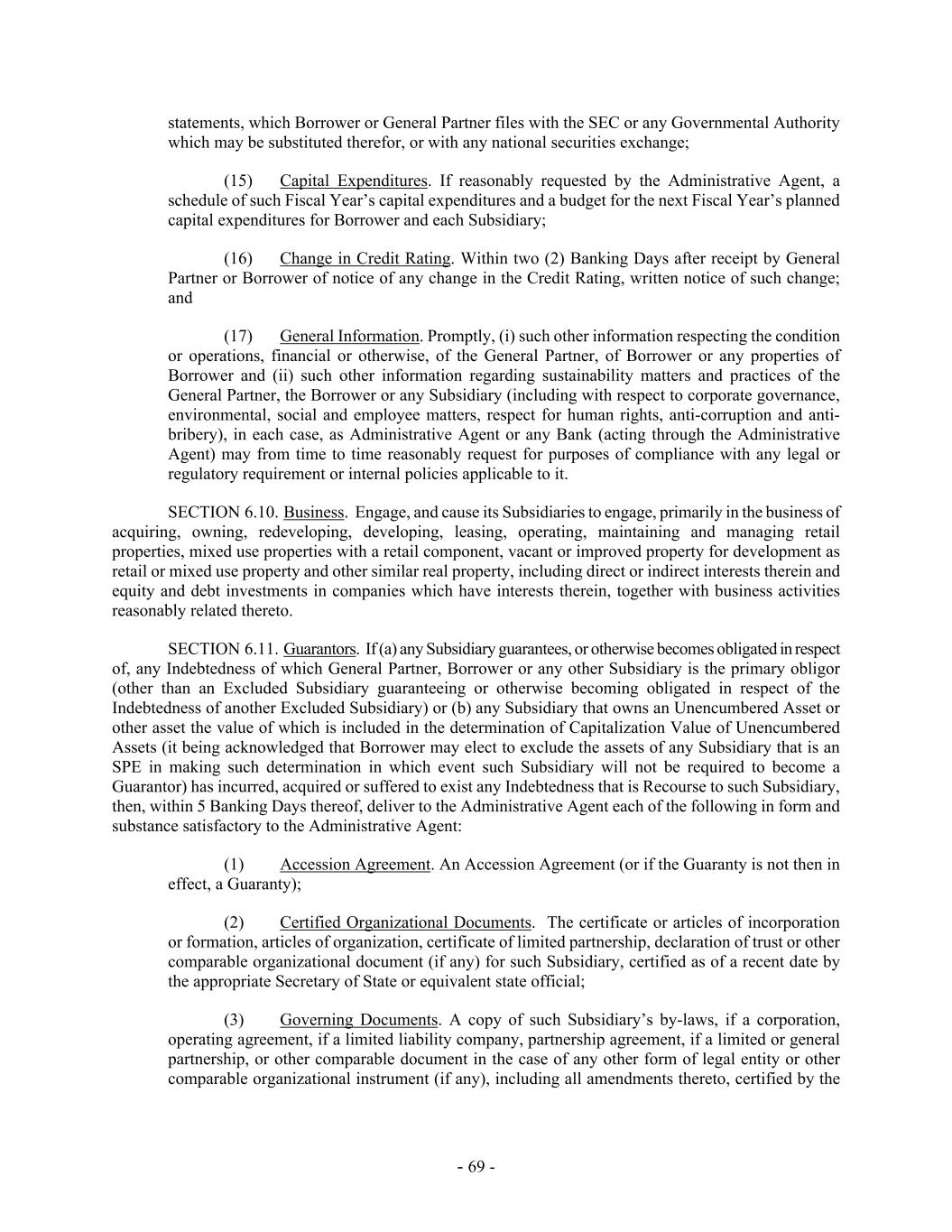 - 69 - statements, which Borrower or General Partner files with the SEC or any Governmental Authority which may be substituted therefor, or with any national securities exchange; (15) Capital Expenditures. If reasonably requested by the Administrative Agent, a schedule of such Fiscal Year’s capital expenditures and a budget for the next Fiscal Year’s planned capital expenditures for Borrower and each Subsidiary; (16) Change in Credit Rating. Within two (2) Banking Days after receipt by General Partner or Borrower of notice of any change in the Credit Rating, written notice of such change; and (17) General Information. Promptly, (i) such other information respecting the condition or operations, financial or otherwise, of the General Partner, of Borrower or any properties of Borrower and (ii) such other information regarding sustainability matters and practices of the General Partner, the Borrower or any Subsidiary (including with respect to corporate governance, environmental, social and employee matters, respect for human rights, anti-corruption and anti- bribery), in each case, as Administrative Agent or any Bank (acting through the Administrative Agent) may from time to time reasonably request for purposes of compliance with any legal or regulatory requirement or internal policies applicable to it. SECTION 6.10. Business. Engage, and cause its Subsidiaries to engage, primarily in the business of acquiring, owning, redeveloping, developing, leasing, operating, maintaining and managing retail properties, mixed use properties with a retail component, vacant or improved property for development as retail or mixed use property and other similar real property, including direct or indirect interests therein and equity and debt investments in companies which have interests therein, together with business activities reasonably related thereto. SECTION 6.11. Guarantors. If (a) any Subsidiary guarantees, or otherwise becomes obligated in respect of, any Indebtedness of which General Partner, Borrower or any other Subsidiary is the primary obligor (other than an Excluded Subsidiary guaranteeing or otherwise becoming obligated in respect of the Indebtedness of another Excluded Subsidiary) or (b) any Subsidiary that owns an Unencumbered Asset or other asset the value of which is included in the determination of Capitalization Value of Unencumbered Assets (it being acknowledged that Borrower may elect to exclude the assets of any Subsidiary that is an SPE in making such determination in which event such Subsidiary will not be required to become a Guarantor) has incurred, acquired or suffered to exist any Indebtedness that is Recourse to such Subsidiary, then, within 5 Banking Days thereof, deliver to the Administrative Agent each of the following in form and substance satisfactory to the Administrative Agent: (1) Accession Agreement. An Accession Agreement (or if the Guaranty is not then in effect, a Guaranty); (2) Certified Organizational Documents. The certificate or articles of incorporation or formation, articles of organization, certificate of limited partnership, declaration of trust or other comparable organizational document (if any) for such Subsidiary, certified as of a recent date by the appropriate Secretary of State or equivalent state official; (3) Governing Documents. A copy of such Subsidiary’s by-laws, if a corporation, operating agreement, if a limited liability company, partnership agreement, if a limited or general partnership, or other comparable document in the case of any other form of legal entity or other comparable organizational instrument (if any), including all amendments thereto, certified by the