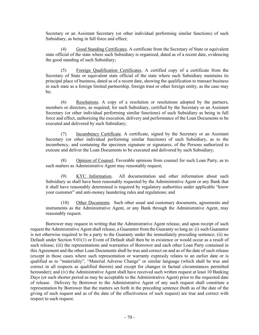 - 70 - Secretary or an Assistant Secretary (or other individual performing similar functions) of such Subsidiary, as being in full force and effect; (4) Good Standing Certificates. A certificate from the Secretary of State or equivalent state official of the state where such Subsidiary is organized, dated as of a recent date, evidencing the good standing of such Subsidiary; (5) Foreign Qualification Certificates. A certified copy of a certificate from the Secretary of State or equivalent state official of the state where such Subsidiary maintains its principal place of business, dated as of a recent date, showing the qualification to transact business in such state as a foreign limited partnership, foreign trust or other foreign entity, as the case may be; (6) Resolutions. A copy of a resolution or resolutions adopted by the partners, members or directors, as required, for such Subsidiary, certified by the Secretary or an Assistant Secretary (or other individual performing similar functions) of such Subsidiary as being in full force and effect, authorizing the execution, delivery and performance of the Loan Documents to be executed and delivered by such Subsidiary; (7) Incumbency Certificate. A certificate, signed by the Secretary or an Assistant Secretary (or other individual performing similar functions) of such Subsidiary, as to the incumbency, and containing the specimen signature or signatures, of the Persons authorized to execute and deliver the Loan Documents to be executed and delivered by such Subsidiary; (8) Opinion of Counsel. Favorable opinions from counsel for such Loan Party, as to such matters as Administrative Agent may reasonably request; (9) KYC Information. All documentation and other information about such Subsidiary as shall have been reasonably requested by the Administrative Agent or any Bank that it shall have reasonably determined is required by regulatory authorities under applicable “know your customer” and anti-money laundering rules and regulations; and (10) Other Documents. Such other usual and customary documents, agreements and instruments as the Administrative Agent, or any Bank through the Administrative Agent, may reasonably request. Borrower may request in writing that the Administrative Agent release, and upon receipt of such request the Administrative Agent shall release, a Guarantor from the Guaranty so long as: (i) such Guarantor is not otherwise required to be a party to the Guaranty under the immediately preceding sentence; (ii) no Default under Section 9.01(1) or Event of Default shall then be in existence or would occur as a result of such release; (iii) the representations and warranties of Borrower and each other Loan Party contained in this Agreement and the other Loan Documents shall be true and correct on and as of the date of such release (except in those cases where such representation or warranty expressly relates to an earlier date or is qualified as to “materiality”, “Material Adverse Change” or similar language (which shall be true and correct in all respects as qualified therein) and except for changes in factual circumstances permitted hereunder); and (iv) the Administrative Agent shall have received such written request at least 10 Banking Days (or such shorter period as may be acceptable to the Administrative Agent) prior to the requested date of release. Delivery by Borrower to the Administrative Agent of any such request shall constitute a representation by Borrower that the matters set forth in the preceding sentence (both as of the date of the giving of such request and as of the date of the effectiveness of such request) are true and correct with respect to such request.