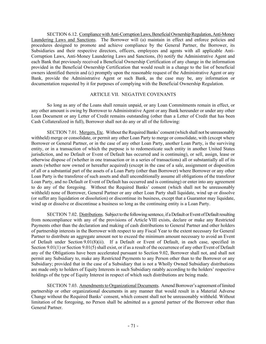 - 71 - SECTION 6.12. Compliance with Anti-Corruption Laws, Beneficial Ownership Regulation, Anti-Money Laundering Laws and Sanctions. The Borrower will (a) maintain in effect and enforce policies and procedures designed to promote and achieve compliance by the General Partner, the Borrower, its Subsidiaries and their respective directors, officers, employees and agents with all applicable Anti- Corruption Laws, Anti-Money Laundering Laws and Sanctions, (b) notify the Administrative Agent and each Bank that previously received a Beneficial Ownership Certification of any change in the information provided in the Beneficial Ownership Certification that would result in a change to the list of beneficial owners identified therein and (c) promptly upon the reasonable request of the Administrative Agent or any Bank, provide the Administrative Agent or such Bank, as the case may be, any information or documentation requested by it for purposes of complying with the Beneficial Ownership Regulation. ARTICLE VII. NEGATIVE COVENANTS So long as any of the Loans shall remain unpaid, or any Loan Commitments remain in effect, or any other amount is owing by Borrower to Administrative Agent or any Bank hereunder or under any other Loan Document or any Letter of Credit remains outstanding (other than a Letter of Credit that has been Cash Collateralized in full), Borrower shall not do any or all of the following: SECTION 7.01. Mergers, Etc. Without the Required Banks’ consent (which shall not be unreasonably withheld) merge or consolidate, or permit any other Loan Party to merge or consolidate, with (except where Borrower or General Partner, or in the case of any other Loan Party, another Loan Party, is the surviving entity, or in a transaction of which the purpose is to redomesticate such entity in another United States jurisdiction, and no Default or Event of Default has occurred and is continuing), or sell, assign, lease or otherwise dispose of (whether in one transaction or in a series of transactions) all or substantially all of its assets (whether now owned or hereafter acquired) (except in the case of a sale, assignment or disposition of all or a substantial part of the assets of a Loan Party (other than Borrower) where Borrower or any other Loan Party is the transferee of such assets and shall unconditionally assume all obligations of the transferor Loan Party, and no Default or Event of Default has occurred and is continuing) or enter into any agreement to do any of the foregoing. Without the Required Banks’ consent (which shall not be unreasonably withheld) none of Borrower, General Partner or any other Loan Party shall liquidate, wind up or dissolve (or suffer any liquidation or dissolution) or discontinue its business, except that a Guarantor may liquidate, wind up or dissolve or discontinue a business so long as the continuing entity is a Loan Party. SECTION 7.02. Distributions. Subject to the following sentence, if a Default or Event of Default resulting from noncompliance with any of the provisions of Article VIII exists, declare or make any Restricted Payments other than the declaration and making of cash distributions to General Partner and other holders of partnership interests in the Borrower with respect to any Fiscal Year to the extent necessary for General Partner to distribute an aggregate amount not to exceed the minimum amount necessary to avoid an Event of Default under Section 9.01(8)(ii). If a Default or Event of Default, in each case, specified in Section 9.01(1) or Section 9.01(5) shall exist, or if as a result of the occurrence of any other Event of Default any of the Obligations have been accelerated pursuant to Section 9.02, Borrower shall not, and shall not permit any Subsidiary to, make any Restricted Payments to any Person other than to the Borrower or any Subsidiary; provided that in the case of a Subsidiary that is not a Wholly Owned Subsidiary distributions are made only to holders of Equity Interests in such Subsidiary ratably according to the holders’ respective holdings of the type of Equity Interest in respect of which such distributions are being made. SECTION 7.03. Amendments to Organizational Documents. Amend Borrower’s agreement of limited partnership or other organizational documents in any manner that would result in a Material Adverse Change without the Required Banks’ consent, which consent shall not be unreasonably withheld. Without limitation of the foregoing, no Person shall be admitted as a general partner of the Borrower other than General Partner.