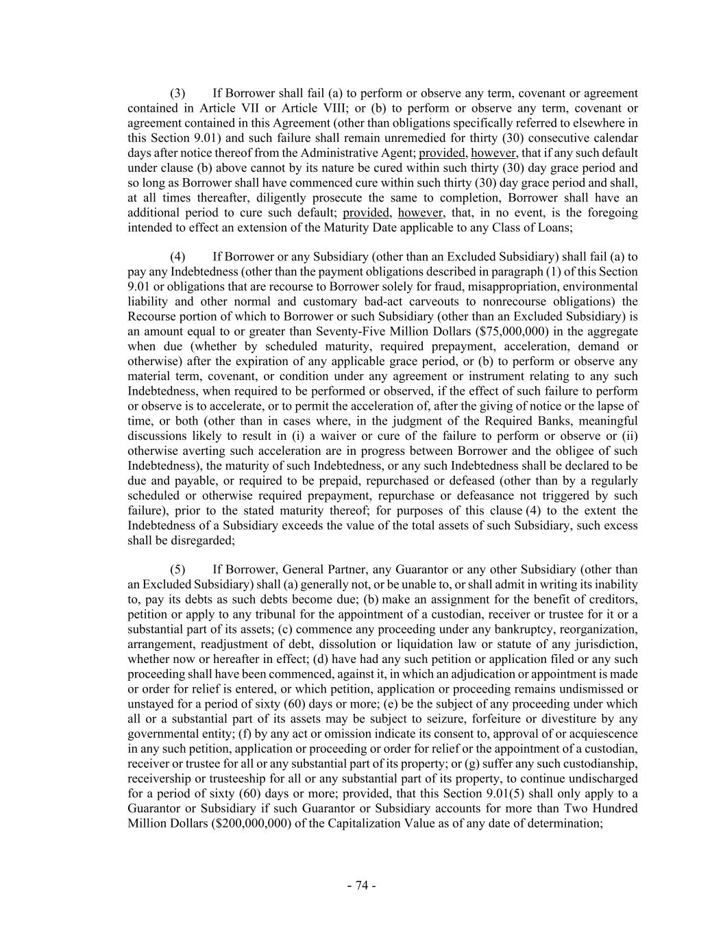- 74 - (3) If Borrower shall fail (a) to perform or observe any term, covenant or agreement contained in Article VII or Article VIII; or (b) to perform or observe any term, covenant or agreement contained in this Agreement (other than obligations specifically referred to elsewhere in this Section 9.01) and such failure shall remain unremedied for thirty (30) consecutive calendar days after notice thereof from the Administrative Agent; provided, however, that if any such default under clause (b) above cannot by its nature be cured within such thirty (30) day grace period and so long as Borrower shall have commenced cure within such thirty (30) day grace period and shall, at all times thereafter, diligently prosecute the same to completion, Borrower shall have an additional period to cure such default; provided, however, that, in no event, is the foregoing intended to effect an extension of the Maturity Date applicable to any Class of Loans; (4) If Borrower or any Subsidiary (other than an Excluded Subsidiary) shall fail (a) to pay any Indebtedness (other than the payment obligations described in paragraph (1) of this Section 9.01 or obligations that are recourse to Borrower solely for fraud, misappropriation, environmental liability and other normal and customary bad-act carveouts to nonrecourse obligations) the Recourse portion of which to Borrower or such Subsidiary (other than an Excluded Subsidiary) is an amount equal to or greater than Seventy-Five Million Dollars ($75,000,000) in the aggregate when due (whether by scheduled maturity, required prepayment, acceleration, demand or otherwise) after the expiration of any applicable grace period, or (b) to perform or observe any material term, covenant, or condition under any agreement or instrument relating to any such Indebtedness, when required to be performed or observed, if the effect of such failure to perform or observe is to accelerate, or to permit the acceleration of, after the giving of notice or the lapse of time, or both (other than in cases where, in the judgment of the Required Banks, meaningful discussions likely to result in (i) a waiver or cure of the failure to perform or observe or (ii) otherwise averting such acceleration are in progress between Borrower and the obligee of such Indebtedness), the maturity of such Indebtedness, or any such Indebtedness shall be declared to be due and payable, or required to be prepaid, repurchased or defeased (other than by a regularly scheduled or otherwise required prepayment, repurchase or defeasance not triggered by such failure), prior to the stated maturity thereof; for purposes of this clause (4) to the extent the Indebtedness of a Subsidiary exceeds the value of the total assets of such Subsidiary, such excess shall be disregarded; (5) If Borrower, General Partner, any Guarantor or any other Subsidiary (other than an Excluded Subsidiary) shall (a) generally not, or be unable to, or shall admit in writing its inability to, pay its debts as such debts become due; (b) make an assignment for the benefit of creditors, petition or apply to any tribunal for the appointment of a custodian, receiver or trustee for it or a substantial part of its assets; (c) commence any proceeding under any bankruptcy, reorganization, arrangement, readjustment of debt, dissolution or liquidation law or statute of any jurisdiction, whether now or hereafter in effect; (d) have had any such petition or application filed or any such proceeding shall have been commenced, against it, in which an adjudication or appointment is made or order for relief is entered, or which petition, application or proceeding remains undismissed or unstayed for a period of sixty (60) days or more; (e) be the subject of any proceeding under which all or a substantial part of its assets may be subject to seizure, forfeiture or divestiture by any governmental entity; (f) by any act or omission indicate its consent to, approval of or acquiescence in any such petition, application or proceeding or order for relief or the appointment of a custodian, receiver or trustee for all or any substantial part of its property; or (g) suffer any such custodianship, receivership or trusteeship for all or any substantial part of its property, to continue undischarged for a period of sixty (60) days or more; provided, that this Section 9.01(5) shall only apply to a Guarantor or Subsidiary if such Guarantor or Subsidiary accounts for more than Two Hundred Million Dollars ($200,000,000) of the Capitalization Value as of any date of determination;