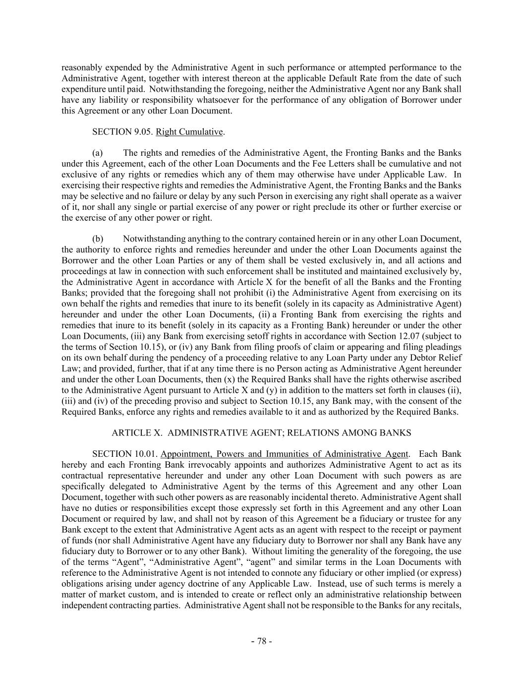 - 78 - reasonably expended by the Administrative Agent in such performance or attempted performance to the Administrative Agent, together with interest thereon at the applicable Default Rate from the date of such expenditure until paid. Notwithstanding the foregoing, neither the Administrative Agent nor any Bank shall have any liability or responsibility whatsoever for the performance of any obligation of Borrower under this Agreement or any other Loan Document. SECTION 9.05. Right Cumulative. (a) The rights and remedies of the Administrative Agent, the Fronting Banks and the Banks under this Agreement, each of the other Loan Documents and the Fee Letters shall be cumulative and not exclusive of any rights or remedies which any of them may otherwise have under Applicable Law. In exercising their respective rights and remedies the Administrative Agent, the Fronting Banks and the Banks may be selective and no failure or delay by any such Person in exercising any right shall operate as a waiver of it, nor shall any single or partial exercise of any power or right preclude its other or further exercise or the exercise of any other power or right. (b) Notwithstanding anything to the contrary contained herein or in any other Loan Document, the authority to enforce rights and remedies hereunder and under the other Loan Documents against the Borrower and the other Loan Parties or any of them shall be vested exclusively in, and all actions and proceedings at law in connection with such enforcement shall be instituted and maintained exclusively by, the Administrative Agent in accordance with Article X for the benefit of all the Banks and the Fronting Banks; provided that the foregoing shall not prohibit (i) the Administrative Agent from exercising on its own behalf the rights and remedies that inure to its benefit (solely in its capacity as Administrative Agent) hereunder and under the other Loan Documents, (ii) a Fronting Bank from exercising the rights and remedies that inure to its benefit (solely in its capacity as a Fronting Bank) hereunder or under the other Loan Documents, (iii) any Bank from exercising setoff rights in accordance with Section 12.07 (subject to the terms of Section 10.15), or (iv) any Bank from filing proofs of claim or appearing and filing pleadings on its own behalf during the pendency of a proceeding relative to any Loan Party under any Debtor Relief Law; and provided, further, that if at any time there is no Person acting as Administrative Agent hereunder and under the other Loan Documents, then (x) the Required Banks shall have the rights otherwise ascribed to the Administrative Agent pursuant to Article X and (y) in addition to the matters set forth in clauses (ii), (iii) and (iv) of the preceding proviso and subject to Section 10.15, any Bank may, with the consent of the Required Banks, enforce any rights and remedies available to it and as authorized by the Required Banks. ARTICLE X. ADMINISTRATIVE AGENT; RELATIONS AMONG BANKS SECTION 10.01. Appointment, Powers and Immunities of Administrative Agent. Each Bank hereby and each Fronting Bank irrevocably appoints and authorizes Administrative Agent to act as its contractual representative hereunder and under any other Loan Document with such powers as are specifically delegated to Administrative Agent by the terms of this Agreement and any other Loan Document, together with such other powers as are reasonably incidental thereto. Administrative Agent shall have no duties or responsibilities except those expressly set forth in this Agreement and any other Loan Document or required by law, and shall not by reason of this Agreement be a fiduciary or trustee for any Bank except to the extent that Administrative Agent acts as an agent with respect to the receipt or payment of funds (nor shall Administrative Agent have any fiduciary duty to Borrower nor shall any Bank have any fiduciary duty to Borrower or to any other Bank). Without limiting the generality of the foregoing, the use of the terms “Agent”, “Administrative Agent”, “agent” and similar terms in the Loan Documents with reference to the Administrative Agent is not intended to connote any fiduciary or other implied (or express) obligations arising under agency doctrine of any Applicable Law. Instead, use of such terms is merely a matter of market custom, and is intended to create or reflect only an administrative relationship between independent contracting parties. Administrative Agent shall not be responsible to the Banks for any recitals,