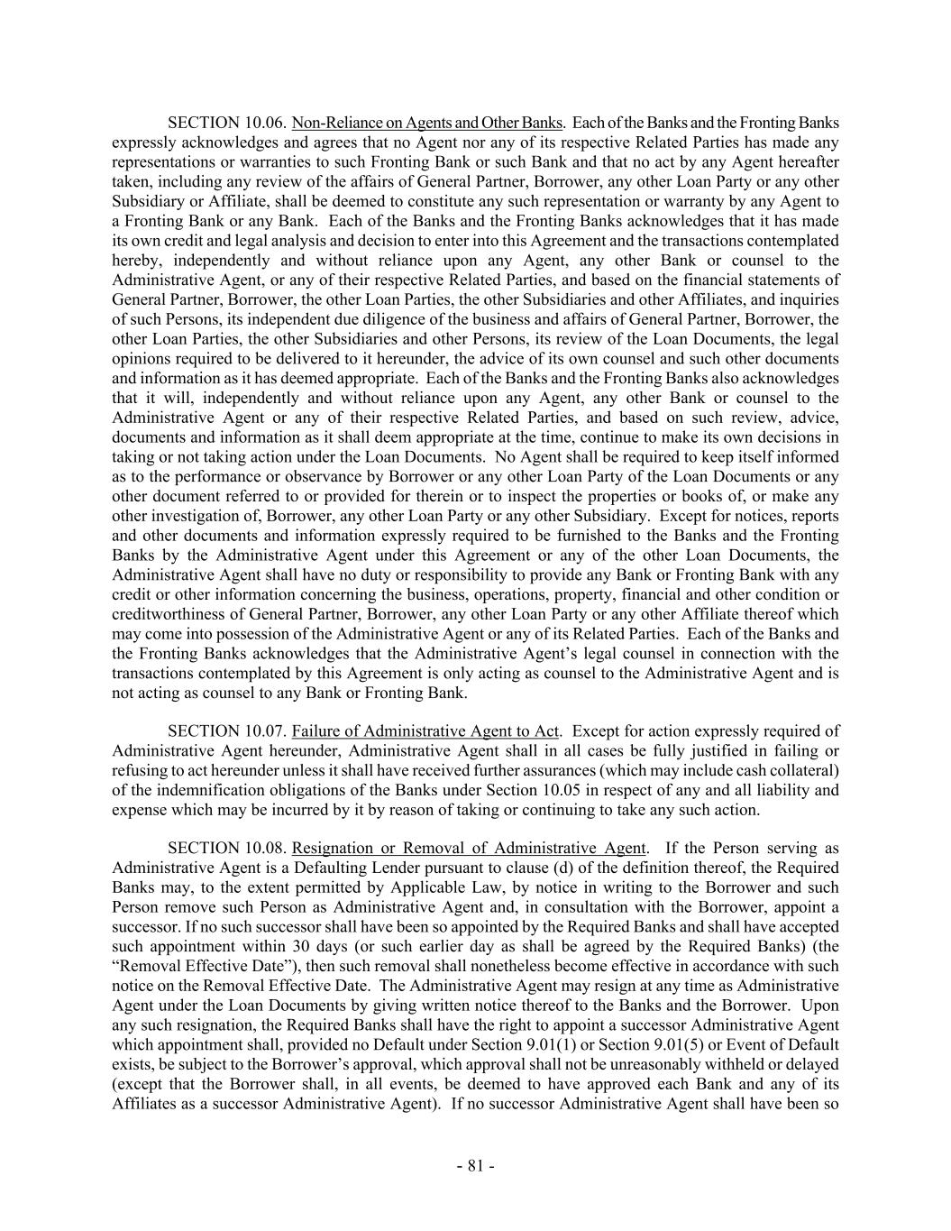 - 81 - SECTION 10.06. Non-Reliance on Agents and Other Banks. Each of the Banks and the Fronting Banks expressly acknowledges and agrees that no Agent nor any of its respective Related Parties has made any representations or warranties to such Fronting Bank or such Bank and that no act by any Agent hereafter taken, including any review of the affairs of General Partner, Borrower, any other Loan Party or any other Subsidiary or Affiliate, shall be deemed to constitute any such representation or warranty by any Agent to a Fronting Bank or any Bank. Each of the Banks and the Fronting Banks acknowledges that it has made its own credit and legal analysis and decision to enter into this Agreement and the transactions contemplated hereby, independently and without reliance upon any Agent, any other Bank or counsel to the Administrative Agent, or any of their respective Related Parties, and based on the financial statements of General Partner, Borrower, the other Loan Parties, the other Subsidiaries and other Affiliates, and inquiries of such Persons, its independent due diligence of the business and affairs of General Partner, Borrower, the other Loan Parties, the other Subsidiaries and other Persons, its review of the Loan Documents, the legal opinions required to be delivered to it hereunder, the advice of its own counsel and such other documents and information as it has deemed appropriate. Each of the Banks and the Fronting Banks also acknowledges that it will, independently and without reliance upon any Agent, any other Bank or counsel to the Administrative Agent or any of their respective Related Parties, and based on such review, advice, documents and information as it shall deem appropriate at the time, continue to make its own decisions in taking or not taking action under the Loan Documents. No Agent shall be required to keep itself informed as to the performance or observance by Borrower or any other Loan Party of the Loan Documents or any other document referred to or provided for therein or to inspect the properties or books of, or make any other investigation of, Borrower, any other Loan Party or any other Subsidiary. Except for notices, reports and other documents and information expressly required to be furnished to the Banks and the Fronting Banks by the Administrative Agent under this Agreement or any of the other Loan Documents, the Administrative Agent shall have no duty or responsibility to provide any Bank or Fronting Bank with any credit or other information concerning the business, operations, property, financial and other condition or creditworthiness of General Partner, Borrower, any other Loan Party or any other Affiliate thereof which may come into possession of the Administrative Agent or any of its Related Parties. Each of the Banks and the Fronting Banks acknowledges that the Administrative Agent’s legal counsel in connection with the transactions contemplated by this Agreement is only acting as counsel to the Administrative Agent and is not acting as counsel to any Bank or Fronting Bank. SECTION 10.07. Failure of Administrative Agent to Act. Except for action expressly required of Administrative Agent hereunder, Administrative Agent shall in all cases be fully justified in failing or refusing to act hereunder unless it shall have received further assurances (which may include cash collateral) of the indemnification obligations of the Banks under Section 10.05 in respect of any and all liability and expense which may be incurred by it by reason of taking or continuing to take any such action. SECTION 10.08. Resignation or Removal of Administrative Agent. If the Person serving as Administrative Agent is a Defaulting Lender pursuant to clause (d) of the definition thereof, the Required Banks may, to the extent permitted by Applicable Law, by notice in writing to the Borrower and such Person remove such Person as Administrative Agent and, in consultation with the Borrower, appoint a successor. If no such successor shall have been so appointed by the Required Banks and shall have accepted such appointment within 30 days (or such earlier day as shall be agreed by the Required Banks) (the “Removal Effective Date”), then such removal shall nonetheless become effective in accordance with such notice on the Removal Effective Date. The Administrative Agent may resign at any time as Administrative Agent under the Loan Documents by giving written notice thereof to the Banks and the Borrower. Upon any such resignation, the Required Banks shall have the right to appoint a successor Administrative Agent which appointment shall, provided no Default under Section 9.01(1) or Section 9.01(5) or Event of Default exists, be subject to the Borrower’s approval, which approval shall not be unreasonably withheld or delayed (except that the Borrower shall, in all events, be deemed to have approved each Bank and any of its Affiliates as a successor Administrative Agent). If no successor Administrative Agent shall have been so