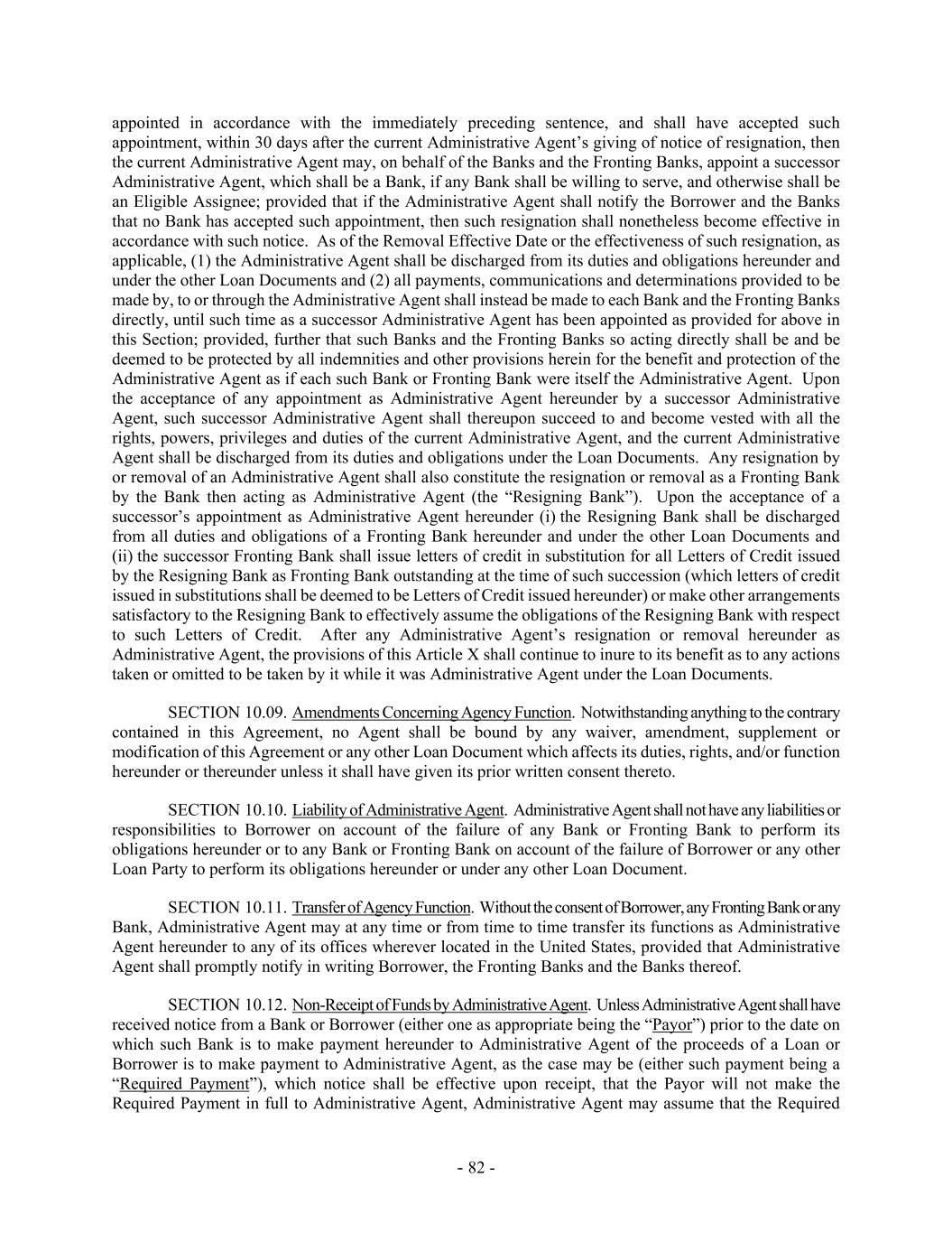 - 82 - appointed in accordance with the immediately preceding sentence, and shall have accepted such appointment, within 30 days after the current Administrative Agent’s giving of notice of resignation, then the current Administrative Agent may, on behalf of the Banks and the Fronting Banks, appoint a successor Administrative Agent, which shall be a Bank, if any Bank shall be willing to serve, and otherwise shall be an Eligible Assignee; provided that if the Administrative Agent shall notify the Borrower and the Banks that no Bank has accepted such appointment, then such resignation shall nonetheless become effective in accordance with such notice. As of the Removal Effective Date or the effectiveness of such resignation, as applicable, (1) the Administrative Agent shall be discharged from its duties and obligations hereunder and under the other Loan Documents and (2) all payments, communications and determinations provided to be made by, to or through the Administrative Agent shall instead be made to each Bank and the Fronting Banks directly, until such time as a successor Administrative Agent has been appointed as provided for above in this Section; provided, further that such Banks and the Fronting Banks so acting directly shall be and be deemed to be protected by all indemnities and other provisions herein for the benefit and protection of the Administrative Agent as if each such Bank or Fronting Bank were itself the Administrative Agent. Upon the acceptance of any appointment as Administrative Agent hereunder by a successor Administrative Agent, such successor Administrative Agent shall thereupon succeed to and become vested with all the rights, powers, privileges and duties of the current Administrative Agent, and the current Administrative Agent shall be discharged from its duties and obligations under the Loan Documents. Any resignation by or removal of an Administrative Agent shall also constitute the resignation or removal as a Fronting Bank by the Bank then acting as Administrative Agent (the “Resigning Bank”). Upon the acceptance of a successor’s appointment as Administrative Agent hereunder (i) the Resigning Bank shall be discharged from all duties and obligations of a Fronting Bank hereunder and under the other Loan Documents and (ii) the successor Fronting Bank shall issue letters of credit in substitution for all Letters of Credit issued by the Resigning Bank as Fronting Bank outstanding at the time of such succession (which letters of credit issued in substitutions shall be deemed to be Letters of Credit issued hereunder) or make other arrangements satisfactory to the Resigning Bank to effectively assume the obligations of the Resigning Bank with respect to such Letters of Credit. After any Administrative Agent’s resignation or removal hereunder as Administrative Agent, the provisions of this Article X shall continue to inure to its benefit as to any actions taken or omitted to be taken by it while it was Administrative Agent under the Loan Documents. SECTION 10.09. Amendments Concerning Agency Function. Notwithstanding anything to the contrary contained in this Agreement, no Agent shall be bound by any waiver, amendment, supplement or modification of this Agreement or any other Loan Document which affects its duties, rights, and/or function hereunder or thereunder unless it shall have given its prior written consent thereto. SECTION 10.10. Liability of Administrative Agent. Administrative Agent shall not have any liabilities or responsibilities to Borrower on account of the failure of any Bank or Fronting Bank to perform its obligations hereunder or to any Bank or Fronting Bank on account of the failure of Borrower or any other Loan Party to perform its obligations hereunder or under any other Loan Document. SECTION 10.11. Transfer of Agency Function. Without the consent of Borrower, any Fronting Bank or any Bank, Administrative Agent may at any time or from time to time transfer its functions as Administrative Agent hereunder to any of its offices wherever located in the United States, provided that Administrative Agent shall promptly notify in writing Borrower, the Fronting Banks and the Banks thereof. SECTION 10.12. Non-Receipt of Funds by Administrative Agent. Unless Administrative Agent shall have received notice from a Bank or Borrower (either one as appropriate being the “Payor”) prior to the date on which such Bank is to make payment hereunder to Administrative Agent of the proceeds of a Loan or Borrower is to make payment to Administrative Agent, as the case may be (either such payment being a “Required Payment”), which notice shall be effective upon receipt, that the Payor will not make the Required Payment in full to Administrative Agent, Administrative Agent may assume that the Required