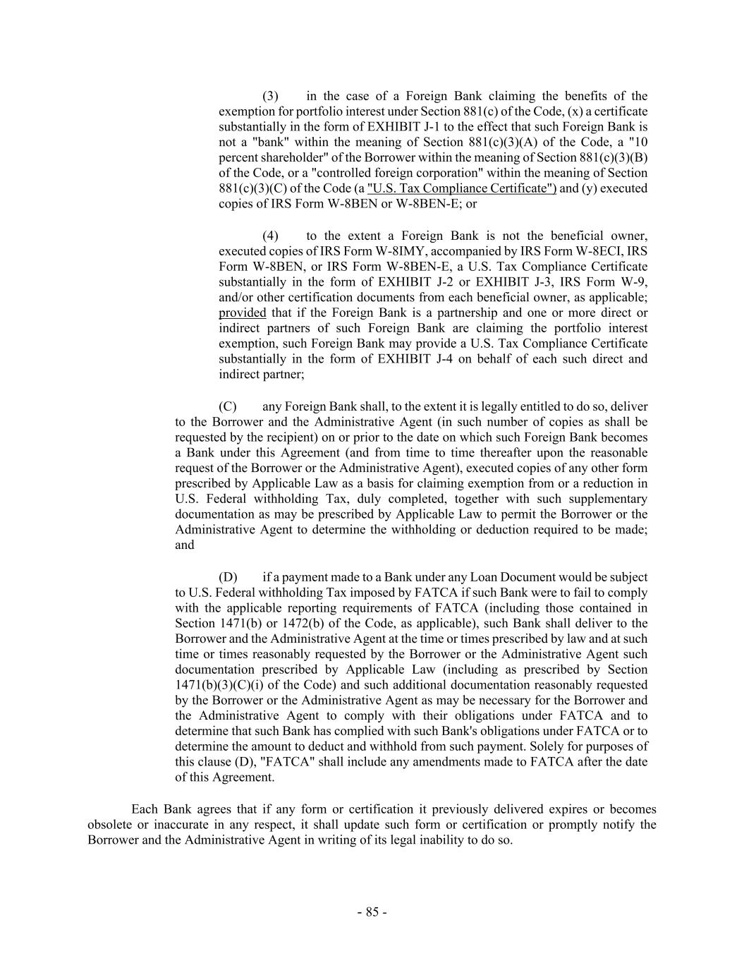 - 85 - (3) in the case of a Foreign Bank claiming the benefits of the exemption for portfolio interest under Section 881(c) of the Code, (x) a certificate substantially in the form of EXHIBIT J-1 to the effect that such Foreign Bank is not a "bank" within the meaning of Section 881(c)(3)(A) of the Code, a "10 percent shareholder" of the Borrower within the meaning of Section 881(c)(3)(B) of the Code, or a "controlled foreign corporation" within the meaning of Section 881(c)(3)(C) of the Code (a "U.S. Tax Compliance Certificate") and (y) executed copies of IRS Form W-8BEN or W-8BEN-E; or (4) to the extent a Foreign Bank is not the beneficial owner, executed copies of IRS Form W-8IMY, accompanied by IRS Form W-8ECI, IRS Form W-8BEN, or IRS Form W-8BEN-E, a U.S. Tax Compliance Certificate substantially in the form of EXHIBIT J-2 or EXHIBIT J-3, IRS Form W-9, and/or other certification documents from each beneficial owner, as applicable; provided that if the Foreign Bank is a partnership and one or more direct or indirect partners of such Foreign Bank are claiming the portfolio interest exemption, such Foreign Bank may provide a U.S. Tax Compliance Certificate substantially in the form of EXHIBIT J-4 on behalf of each such direct and indirect partner; (C) any Foreign Bank shall, to the extent it is legally entitled to do so, deliver to the Borrower and the Administrative Agent (in such number of copies as shall be requested by the recipient) on or prior to the date on which such Foreign Bank becomes a Bank under this Agreement (and from time to time thereafter upon the reasonable request of the Borrower or the Administrative Agent), executed copies of any other form prescribed by Applicable Law as a basis for claiming exemption from or a reduction in U.S. Federal withholding Tax, duly completed, together with such supplementary documentation as may be prescribed by Applicable Law to permit the Borrower or the Administrative Agent to determine the withholding or deduction required to be made; and (D) if a payment made to a Bank under any Loan Document would be subject to U.S. Federal withholding Tax imposed by FATCA if such Bank were to fail to comply with the applicable reporting requirements of FATCA (including those contained in Section 1471(b) or 1472(b) of the Code, as applicable), such Bank shall deliver to the Borrower and the Administrative Agent at the time or times prescribed by law and at such time or times reasonably requested by the Borrower or the Administrative Agent such documentation prescribed by Applicable Law (including as prescribed by Section 1471(b)(3)(C)(i) of the Code) and such additional documentation reasonably requested by the Borrower or the Administrative Agent as may be necessary for the Borrower and the Administrative Agent to comply with their obligations under FATCA and to determine that such Bank has complied with such Bank's obligations under FATCA or to determine the amount to deduct and withhold from such payment. Solely for purposes of this clause (D), "FATCA" shall include any amendments made to FATCA after the date of this Agreement. Each Bank agrees that if any form or certification it previously delivered expires or becomes obsolete or inaccurate in any respect, it shall update such form or certification or promptly notify the Borrower and the Administrative Agent in writing of its legal inability to do so.
