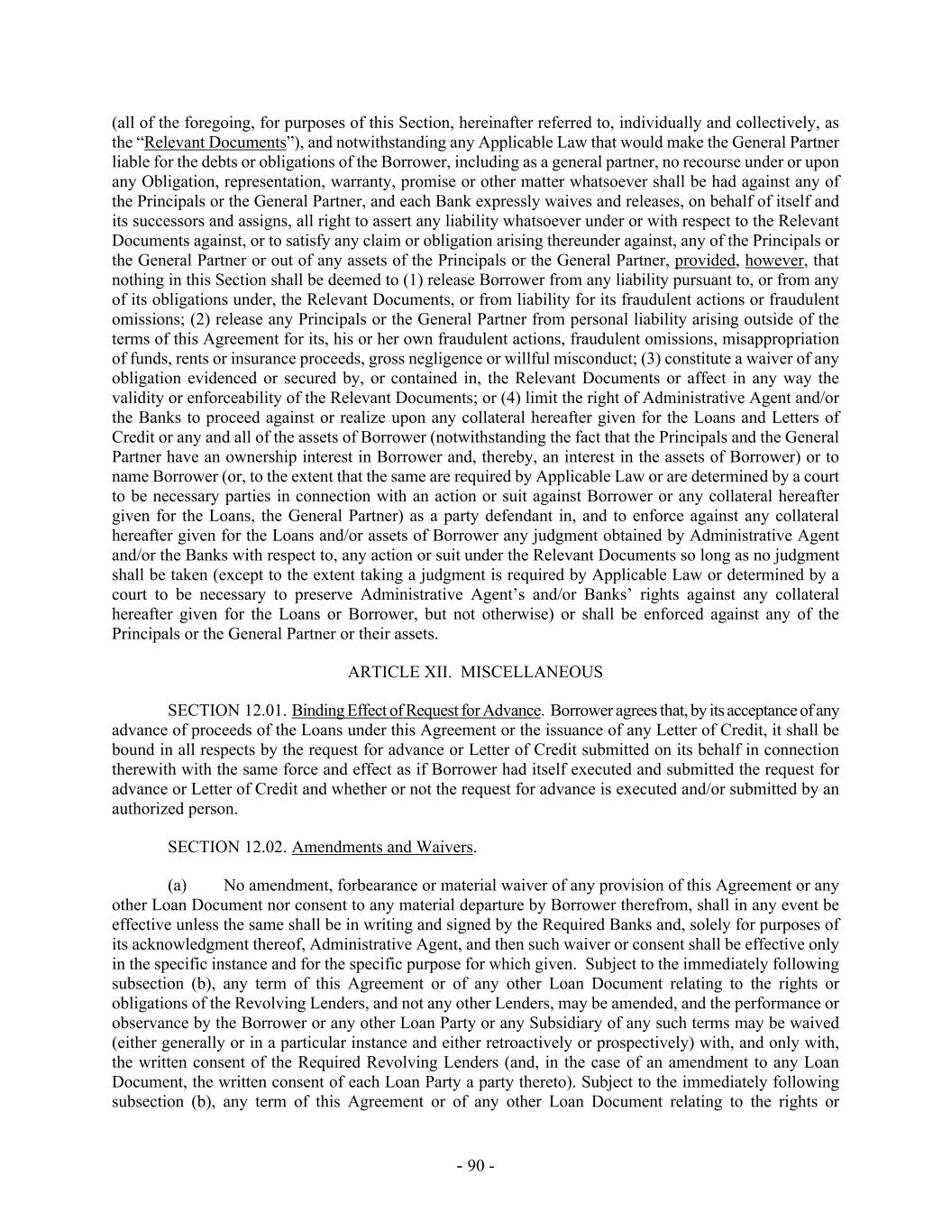 - 90 - (all of the foregoing, for purposes of this Section, hereinafter referred to, individually and collectively, as the “Relevant Documents”), and notwithstanding any Applicable Law that would make the General Partner liable for the debts or obligations of the Borrower, including as a general partner, no recourse under or upon any Obligation, representation, warranty, promise or other matter whatsoever shall be had against any of the Principals or the General Partner, and each Bank expressly waives and releases, on behalf of itself and its successors and assigns, all right to assert any liability whatsoever under or with respect to the Relevant Documents against, or to satisfy any claim or obligation arising thereunder against, any of the Principals or the General Partner or out of any assets of the Principals or the General Partner, provided, however, that nothing in this Section shall be deemed to (1) release Borrower from any liability pursuant to, or from any of its obligations under, the Relevant Documents, or from liability for its fraudulent actions or fraudulent omissions; (2) release any Principals or the General Partner from personal liability arising outside of the terms of this Agreement for its, his or her own fraudulent actions, fraudulent omissions, misappropriation of funds, rents or insurance proceeds, gross negligence or willful misconduct; (3) constitute a waiver of any obligation evidenced or secured by, or contained in, the Relevant Documents or affect in any way the validity or enforceability of the Relevant Documents; or (4) limit the right of Administrative Agent and/or the Banks to proceed against or realize upon any collateral hereafter given for the Loans and Letters of Credit or any and all of the assets of Borrower (notwithstanding the fact that the Principals and the General Partner have an ownership interest in Borrower and, thereby, an interest in the assets of Borrower) or to name Borrower (or, to the extent that the same are required by Applicable Law or are determined by a court to be necessary parties in connection with an action or suit against Borrower or any collateral hereafter given for the Loans, the General Partner) as a party defendant in, and to enforce against any collateral hereafter given for the Loans and/or assets of Borrower any judgment obtained by Administrative Agent and/or the Banks with respect to, any action or suit under the Relevant Documents so long as no judgment shall be taken (except to the extent taking a judgment is required by Applicable Law or determined by a court to be necessary to preserve Administrative Agent’s and/or Banks’ rights against any collateral hereafter given for the Loans or Borrower, but not otherwise) or shall be enforced against any of the Principals or the General Partner or their assets. ARTICLE XII. MISCELLANEOUS SECTION 12.01. Binding Effect of Request for Advance. Borrower agrees that, by its acceptance of any advance of proceeds of the Loans under this Agreement or the issuance of any Letter of Credit, it shall be bound in all respects by the request for advance or Letter of Credit submitted on its behalf in connection therewith with the same force and effect as if Borrower had itself executed and submitted the request for advance or Letter of Credit and whether or not the request for advance is executed and/or submitted by an authorized person. SECTION 12.02. Amendments and Waivers. (a) No amendment, forbearance or material waiver of any provision of this Agreement or any other Loan Document nor consent to any material departure by Borrower therefrom, shall in any event be effective unless the same shall be in writing and signed by the Required Banks and, solely for purposes of its acknowledgment thereof, Administrative Agent, and then such waiver or consent shall be effective only in the specific instance and for the specific purpose for which given. Subject to the immediately following subsection (b), any term of this Agreement or of any other Loan Document relating to the rights or obligations of the Revolving Lenders, and not any other Lenders, may be amended, and the performance or observance by the Borrower or any other Loan Party or any Subsidiary of any such terms may be waived (either generally or in a particular instance and either retroactively or prospectively) with, and only with, the written consent of the Required Revolving Lenders (and, in the case of an amendment to any Loan Document, the written consent of each Loan Party a party thereto). Subject to the immediately following subsection (b), any term of this Agreement or of any other Loan Document relating to the rights or