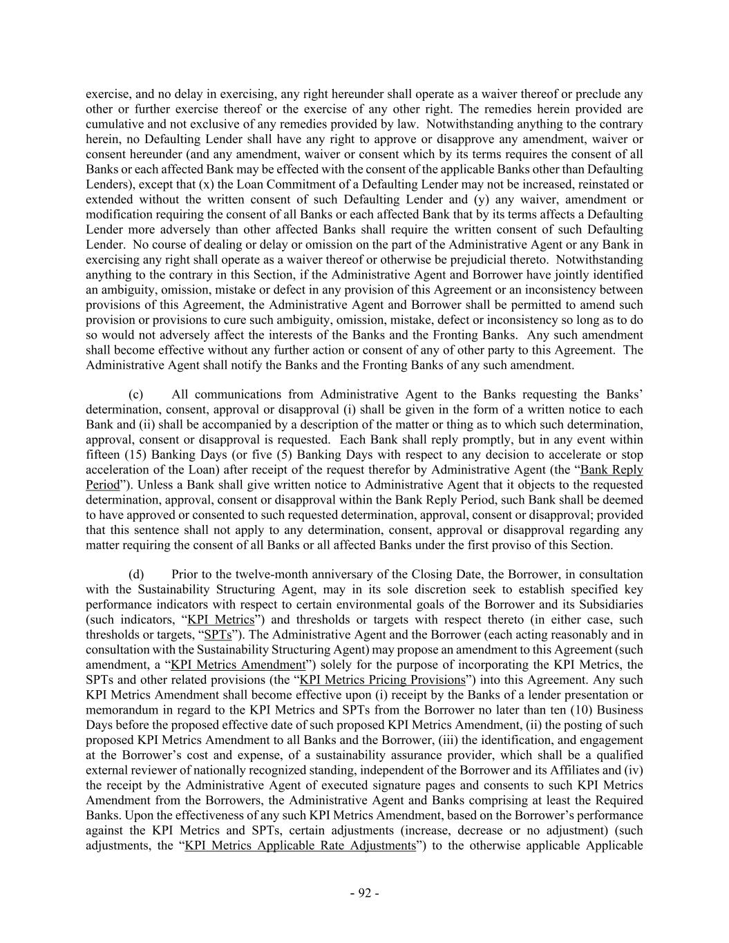 - 92 - exercise, and no delay in exercising, any right hereunder shall operate as a waiver thereof or preclude any other or further exercise thereof or the exercise of any other right. The remedies herein provided are cumulative and not exclusive of any remedies provided by law. Notwithstanding anything to the contrary herein, no Defaulting Lender shall have any right to approve or disapprove any amendment, waiver or consent hereunder (and any amendment, waiver or consent which by its terms requires the consent of all Banks or each affected Bank may be effected with the consent of the applicable Banks other than Defaulting Lenders), except that (x) the Loan Commitment of a Defaulting Lender may not be increased, reinstated or extended without the written consent of such Defaulting Lender and (y) any waiver, amendment or modification requiring the consent of all Banks or each affected Bank that by its terms affects a Defaulting Lender more adversely than other affected Banks shall require the written consent of such Defaulting Lender. No course of dealing or delay or omission on the part of the Administrative Agent or any Bank in exercising any right shall operate as a waiver thereof or otherwise be prejudicial thereto. Notwithstanding anything to the contrary in this Section, if the Administrative Agent and Borrower have jointly identified an ambiguity, omission, mistake or defect in any provision of this Agreement or an inconsistency between provisions of this Agreement, the Administrative Agent and Borrower shall be permitted to amend such provision or provisions to cure such ambiguity, omission, mistake, defect or inconsistency so long as to do so would not adversely affect the interests of the Banks and the Fronting Banks. Any such amendment shall become effective without any further action or consent of any of other party to this Agreement. The Administrative Agent shall notify the Banks and the Fronting Banks of any such amendment. (c) All communications from Administrative Agent to the Banks requesting the Banks’ determination, consent, approval or disapproval (i) shall be given in the form of a written notice to each Bank and (ii) shall be accompanied by a description of the matter or thing as to which such determination, approval, consent or disapproval is requested. Each Bank shall reply promptly, but in any event within fifteen (15) Banking Days (or five (5) Banking Days with respect to any decision to accelerate or stop acceleration of the Loan) after receipt of the request therefor by Administrative Agent (the “Bank Reply Period”). Unless a Bank shall give written notice to Administrative Agent that it objects to the requested determination, approval, consent or disapproval within the Bank Reply Period, such Bank shall be deemed to have approved or consented to such requested determination, approval, consent or disapproval; provided that this sentence shall not apply to any determination, consent, approval or disapproval regarding any matter requiring the consent of all Banks or all affected Banks under the first proviso of this Section. (d) Prior to the twelve-month anniversary of the Closing Date, the Borrower, in consultation with the Sustainability Structuring Agent, may in its sole discretion seek to establish specified key performance indicators with respect to certain environmental goals of the Borrower and its Subsidiaries (such indicators, “KPI Metrics”) and thresholds or targets with respect thereto (in either case, such thresholds or targets, “SPTs”). The Administrative Agent and the Borrower (each acting reasonably and in consultation with the Sustainability Structuring Agent) may propose an amendment to this Agreement (such amendment, a “KPI Metrics Amendment”) solely for the purpose of incorporating the KPI Metrics, the SPTs and other related provisions (the “KPI Metrics Pricing Provisions”) into this Agreement. Any such KPI Metrics Amendment shall become effective upon (i) receipt by the Banks of a lender presentation or memorandum in regard to the KPI Metrics and SPTs from the Borrower no later than ten (10) Business Days before the proposed effective date of such proposed KPI Metrics Amendment, (ii) the posting of such proposed KPI Metrics Amendment to all Banks and the Borrower, (iii) the identification, and engagement at the Borrower’s cost and expense, of a sustainability assurance provider, which shall be a qualified external reviewer of nationally recognized standing, independent of the Borrower and its Affiliates and (iv) the receipt by the Administrative Agent of executed signature pages and consents to such KPI Metrics Amendment from the Borrowers, the Administrative Agent and Banks comprising at least the Required Banks. Upon the effectiveness of any such KPI Metrics Amendment, based on the Borrower’s performance against the KPI Metrics and SPTs, certain adjustments (increase, decrease or no adjustment) (such adjustments, the “KPI Metrics Applicable Rate Adjustments”) to the otherwise applicable Applicable