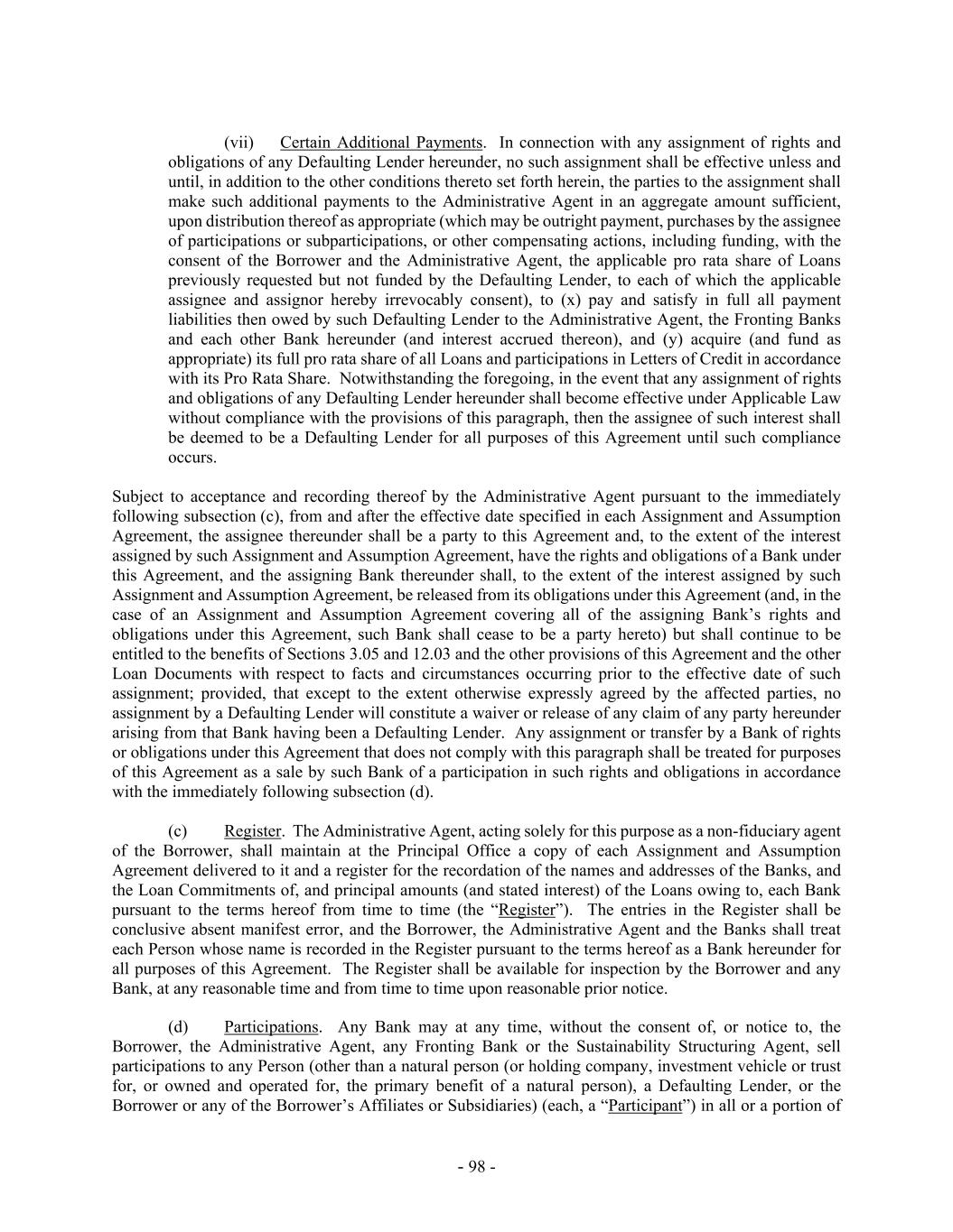 - 98 - (vii) Certain Additional Payments. In connection with any assignment of rights and obligations of any Defaulting Lender hereunder, no such assignment shall be effective unless and until, in addition to the other conditions thereto set forth herein, the parties to the assignment shall make such additional payments to the Administrative Agent in an aggregate amount sufficient, upon distribution thereof as appropriate (which may be outright payment, purchases by the assignee of participations or subparticipations, or other compensating actions, including funding, with the consent of the Borrower and the Administrative Agent, the applicable pro rata share of Loans previously requested but not funded by the Defaulting Lender, to each of which the applicable assignee and assignor hereby irrevocably consent), to (x) pay and satisfy in full all payment liabilities then owed by such Defaulting Lender to the Administrative Agent, the Fronting Banks and each other Bank hereunder (and interest accrued thereon), and (y) acquire (and fund as appropriate) its full pro rata share of all Loans and participations in Letters of Credit in accordance with its Pro Rata Share. Notwithstanding the foregoing, in the event that any assignment of rights and obligations of any Defaulting Lender hereunder shall become effective under Applicable Law without compliance with the provisions of this paragraph, then the assignee of such interest shall be deemed to be a Defaulting Lender for all purposes of this Agreement until such compliance occurs. Subject to acceptance and recording thereof by the Administrative Agent pursuant to the immediately following subsection (c), from and after the effective date specified in each Assignment and Assumption Agreement, the assignee thereunder shall be a party to this Agreement and, to the extent of the interest assigned by such Assignment and Assumption Agreement, have the rights and obligations of a Bank under this Agreement, and the assigning Bank thereunder shall, to the extent of the interest assigned by such Assignment and Assumption Agreement, be released from its obligations under this Agreement (and, in the case of an Assignment and Assumption Agreement covering all of the assigning Bank’s rights and obligations under this Agreement, such Bank shall cease to be a party hereto) but shall continue to be entitled to the benefits of Sections 3.05 and 12.03 and the other provisions of this Agreement and the other Loan Documents with respect to facts and circumstances occurring prior to the effective date of such assignment; provided, that except to the extent otherwise expressly agreed by the affected parties, no assignment by a Defaulting Lender will constitute a waiver or release of any claim of any party hereunder arising from that Bank having been a Defaulting Lender. Any assignment or transfer by a Bank of rights or obligations under this Agreement that does not comply with this paragraph shall be treated for purposes of this Agreement as a sale by such Bank of a participation in such rights and obligations in accordance with the immediately following subsection (d). (c) Register. The Administrative Agent, acting solely for this purpose as a non-fiduciary agent of the Borrower, shall maintain at the Principal Office a copy of each Assignment and Assumption Agreement delivered to it and a register for the recordation of the names and addresses of the Banks, and the Loan Commitments of, and principal amounts (and stated interest) of the Loans owing to, each Bank pursuant to the terms hereof from time to time (the “Register”). The entries in the Register shall be conclusive absent manifest error, and the Borrower, the Administrative Agent and the Banks shall treat each Person whose name is recorded in the Register pursuant to the terms hereof as a Bank hereunder for all purposes of this Agreement. The Register shall be available for inspection by the Borrower and any Bank, at any reasonable time and from time to time upon reasonable prior notice. (d) Participations. Any Bank may at any time, without the consent of, or notice to, the Borrower, the Administrative Agent, any Fronting Bank or the Sustainability Structuring Agent, sell participations to any Person (other than a natural person (or holding company, investment vehicle or trust for, or owned and operated for, the primary benefit of a natural person), a Defaulting Lender, or the Borrower or any of the Borrower’s Affiliates or Subsidiaries) (each, a “Participant”) in all or a portion of