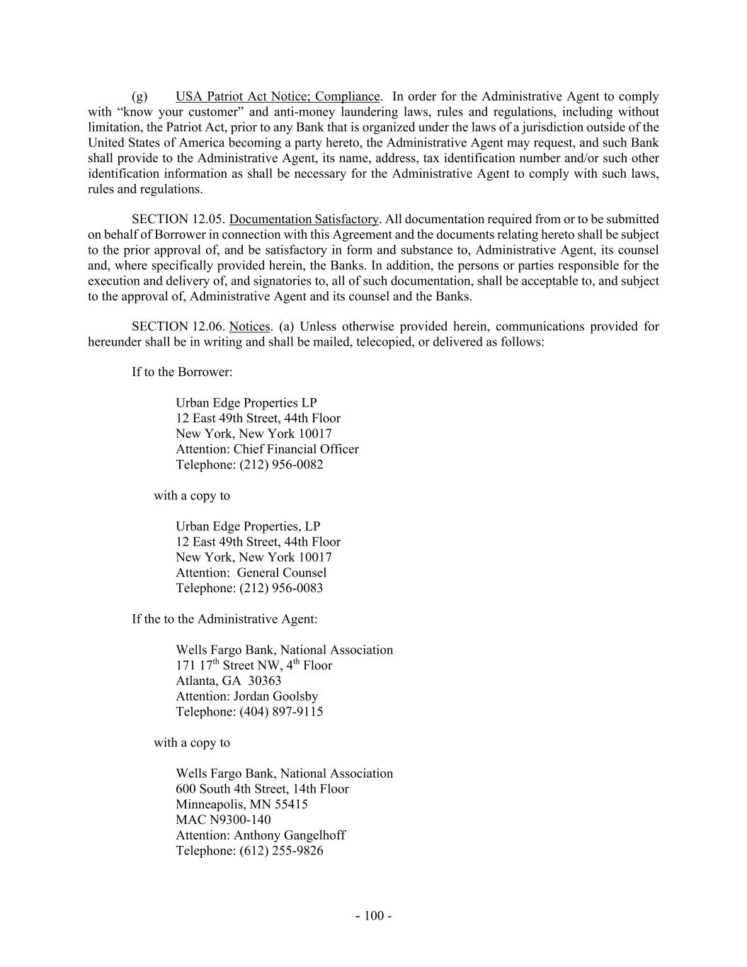 - 100 - (g) USA Patriot Act Notice; Compliance. In order for the Administrative Agent to comply with “know your customer” and anti-money laundering laws, rules and regulations, including without limitation, the Patriot Act, prior to any Bank that is organized under the laws of a jurisdiction outside of the United States of America becoming a party hereto, the Administrative Agent may request, and such Bank shall provide to the Administrative Agent, its name, address, tax identification number and/or such other identification information as shall be necessary for the Administrative Agent to comply with such laws, rules and regulations. SECTION 12.05. Documentation Satisfactory. All documentation required from or to be submitted on behalf of Borrower in connection with this Agreement and the documents relating hereto shall be subject to the prior approval of, and be satisfactory in form and substance to, Administrative Agent, its counsel and, where specifically provided herein, the Banks. In addition, the persons or parties responsible for the execution and delivery of, and signatories to, all of such documentation, shall be acceptable to, and subject to the approval of, Administrative Agent and its counsel and the Banks. SECTION 12.06. Notices. (a) Unless otherwise provided herein, communications provided for hereunder shall be in writing and shall be mailed, telecopied, or delivered as follows: If to the Borrower: Urban Edge Properties LP 12 East 49th Street, 44th Floor New York, New York 10017 Attention: Chief Financial Officer Telephone: (212) 956-0082 with a copy to Urban Edge Properties, LP 12 East 49th Street, 44th Floor New York, New York 10017 Attention: General Counsel Telephone: (212) 956-0083 If the to the Administrative Agent: Wells Fargo Bank, National Association 171 17th Street NW, 4th Floor Atlanta, GA 30363 Attention: Jordan Goolsby Telephone: (404) 897-9115 with a copy to Wells Fargo Bank, National Association 600 South 4th Street, 14th Floor Minneapolis, MN 55415 MAC N9300-140 Attention: Anthony Gangelhoff Telephone: (612) 255-9826