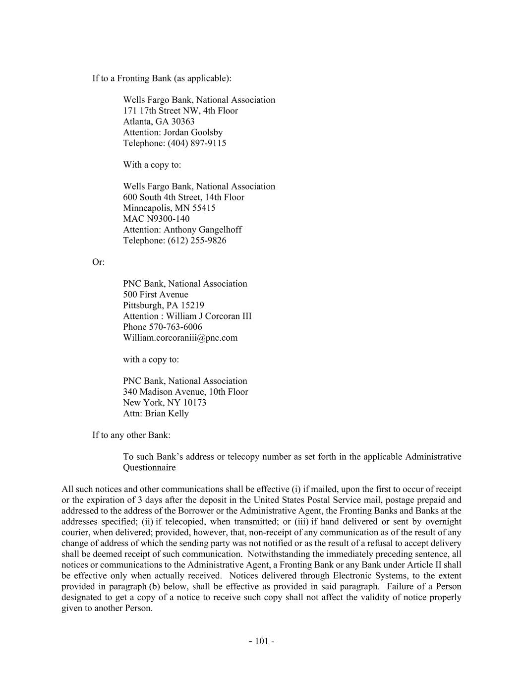 - 101 - If to a Fronting Bank (as applicable): Wells Fargo Bank, National Association 171 17th Street NW, 4th Floor Atlanta, GA 30363 Attention: Jordan Goolsby Telephone: (404) 897-9115 With a copy to: Wells Fargo Bank, National Association 600 South 4th Street, 14th Floor Minneapolis, MN 55415 MAC N9300-140 Attention: Anthony Gangelhoff Telephone: (612) 255-9826 Or: PNC Bank, National Association 500 First Avenue Pittsburgh, PA 15219 Attention : William J Corcoran III Phone 570-763-6006 William.corcoraniii@pnc.com with a copy to: PNC Bank, National Association 340 Madison Avenue, 10th Floor New York, NY 10173 Attn: Brian Kelly If to any other Bank: To such Bank’s address or telecopy number as set forth in the applicable Administrative Questionnaire All such notices and other communications shall be effective (i) if mailed, upon the first to occur of receipt or the expiration of 3 days after the deposit in the United States Postal Service mail, postage prepaid and addressed to the address of the Borrower or the Administrative Agent, the Fronting Banks and Banks at the addresses specified; (ii) if telecopied, when transmitted; or (iii) if hand delivered or sent by overnight courier, when delivered; provided, however, that, non-receipt of any communication as of the result of any change of address of which the sending party was not notified or as the result of a refusal to accept delivery shall be deemed receipt of such communication. Notwithstanding the immediately preceding sentence, all notices or communications to the Administrative Agent, a Fronting Bank or any Bank under Article II shall be effective only when actually received. Notices delivered through Electronic Systems, to the extent provided in paragraph (b) below, shall be effective as provided in said paragraph. Failure of a Person designated to get a copy of a notice to receive such copy shall not affect the validity of notice properly given to another Person.