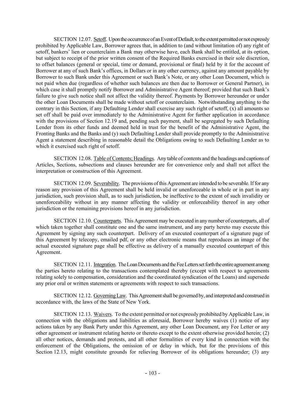 - 103 - SECTION 12.07. Setoff. Upon the occurrence of an Event of Default, to the extent permitted or not expressly prohibited by Applicable Law, Borrower agrees that, in addition to (and without limitation of) any right of setoff, bankers’ lien or counterclaim a Bank may otherwise have, each Bank shall be entitled, at its option, but subject to receipt of the prior written consent of the Required Banks exercised in their sole discretion, to offset balances (general or special, time or demand, provisional or final) held by it for the account of Borrower at any of such Bank’s offices, in Dollars or in any other currency, against any amount payable by Borrower to such Bank under this Agreement or such Bank’s Note, or any other Loan Document, which is not paid when due (regardless of whether such balances are then due to Borrower or General Partner), in which case it shall promptly notify Borrower and Administrative Agent thereof; provided that such Bank’s failure to give such notice shall not affect the validity thereof. Payments by Borrower hereunder or under the other Loan Documents shall be made without setoff or counterclaim. Notwithstanding anything to the contrary in this Section, if any Defaulting Lender shall exercise any such right of setoff, (x) all amounts so set off shall be paid over immediately to the Administrative Agent for further application in accordance with the provisions of Section 12.19 and, pending such payment, shall be segregated by such Defaulting Lender from its other funds and deemed held in trust for the benefit of the Administrative Agent, the Fronting Banks and the Banks and (y) such Defaulting Lender shall provide promptly to the Administrative Agent a statement describing in reasonable detail the Obligations owing to such Defaulting Lender as to which it exercised such right of setoff. SECTION 12.08. Table of Contents; Headings. Any table of contents and the headings and captions of Articles, Sections, subsections and clauses hereunder are for convenience only and shall not affect the interpretation or construction of this Agreement. SECTION 12.09. Severability. The provisions of this Agreement are intended to be severable. If for any reason any provision of this Agreement shall be held invalid or unenforceable in whole or in part in any jurisdiction, such provision shall, as to such jurisdiction, be ineffective to the extent of such invalidity or unenforceability without in any manner affecting the validity or enforceability thereof in any other jurisdiction or the remaining provisions hereof in any jurisdiction. SECTION 12.10. Counterparts. This Agreement may be executed in any number of counterparts, all of which taken together shall constitute one and the same instrument, and any party hereto may execute this Agreement by signing any such counterpart. Delivery of an executed counterpart of a signature page of this Agreement by telecopy, emailed pdf, or any other electronic means that reproduces an image of the actual executed signature page shall be effective as delivery of a manually executed counterpart of this Agreement. SECTION 12.11. Integration. The Loan Documents and the Fee Letters set forth the entire agreement among the parties hereto relating to the transactions contemplated thereby (except with respect to agreements relating solely to compensation, consideration and the coordinated syndication of the Loans) and supersede any prior oral or written statements or agreements with respect to such transactions. SECTION 12.12. Governing Law. This Agreement shall be governed by, and interpreted and construed in accordance with, the laws of the State of New York. SECTION 12.13. Waivers. To the extent permitted or not expressly prohibited by Applicable Law, in connection with the obligations and liabilities as aforesaid, Borrower hereby waives (1) notice of any actions taken by any Bank Party under this Agreement, any other Loan Document, any Fee Letter or any other agreement or instrument relating hereto or thereto except to the extent otherwise provided herein; (2) all other notices, demands and protests, and all other formalities of every kind in connection with the enforcement of the Obligations, the omission of or delay in which, but for the provisions of this Section 12.13, might constitute grounds for relieving Borrower of its obligations hereunder; (3) any