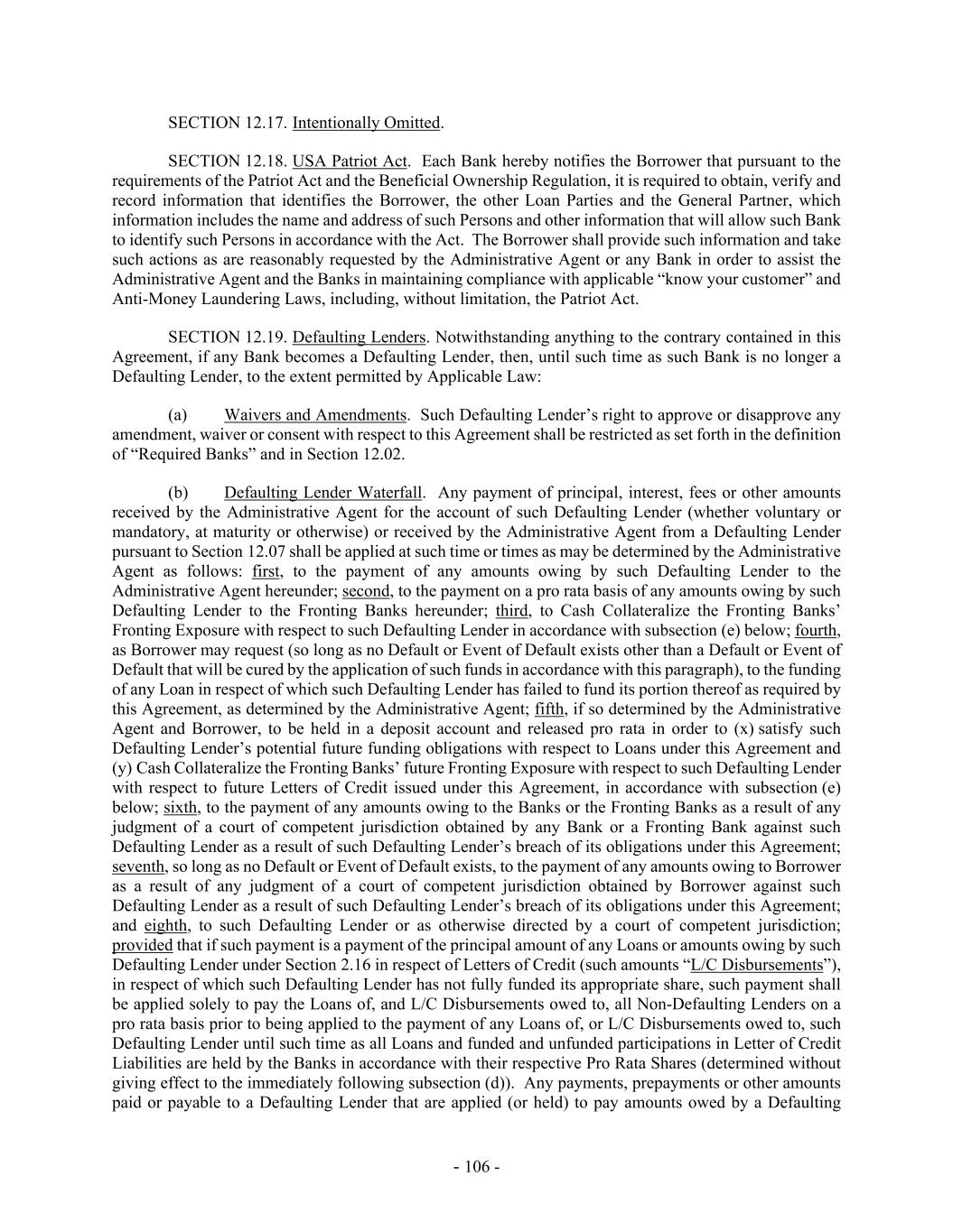 - 106 - SECTION 12.17. Intentionally Omitted. SECTION 12.18. USA Patriot Act. Each Bank hereby notifies the Borrower that pursuant to the requirements of the Patriot Act and the Beneficial Ownership Regulation, it is required to obtain, verify and record information that identifies the Borrower, the other Loan Parties and the General Partner, which information includes the name and address of such Persons and other information that will allow such Bank to identify such Persons in accordance with the Act. The Borrower shall provide such information and take such actions as are reasonably requested by the Administrative Agent or any Bank in order to assist the Administrative Agent and the Banks in maintaining compliance with applicable “know your customer” and Anti-Money Laundering Laws, including, without limitation, the Patriot Act. SECTION 12.19. Defaulting Lenders. Notwithstanding anything to the contrary contained in this Agreement, if any Bank becomes a Defaulting Lender, then, until such time as such Bank is no longer a Defaulting Lender, to the extent permitted by Applicable Law: (a) Waivers and Amendments. Such Defaulting Lender’s right to approve or disapprove any amendment, waiver or consent with respect to this Agreement shall be restricted as set forth in the definition of “Required Banks” and in Section 12.02. (b) Defaulting Lender Waterfall. Any payment of principal, interest, fees or other amounts received by the Administrative Agent for the account of such Defaulting Lender (whether voluntary or mandatory, at maturity or otherwise) or received by the Administrative Agent from a Defaulting Lender pursuant to Section 12.07 shall be applied at such time or times as may be determined by the Administrative Agent as follows: first, to the payment of any amounts owing by such Defaulting Lender to the Administrative Agent hereunder; second, to the payment on a pro rata basis of any amounts owing by such Defaulting Lender to the Fronting Banks hereunder; third, to Cash Collateralize the Fronting Banks’ Fronting Exposure with respect to such Defaulting Lender in accordance with subsection (e) below; fourth, as Borrower may request (so long as no Default or Event of Default exists other than a Default or Event of Default that will be cured by the application of such funds in accordance with this paragraph), to the funding of any Loan in respect of which such Defaulting Lender has failed to fund its portion thereof as required by this Agreement, as determined by the Administrative Agent; fifth, if so determined by the Administrative Agent and Borrower, to be held in a deposit account and released pro rata in order to (x) satisfy such Defaulting Lender’s potential future funding obligations with respect to Loans under this Agreement and (y) Cash Collateralize the Fronting Banks’ future Fronting Exposure with respect to such Defaulting Lender with respect to future Letters of Credit issued under this Agreement, in accordance with subsection (e) below; sixth, to the payment of any amounts owing to the Banks or the Fronting Banks as a result of any judgment of a court of competent jurisdiction obtained by any Bank or a Fronting Bank against such Defaulting Lender as a result of such Defaulting Lender’s breach of its obligations under this Agreement; seventh, so long as no Default or Event of Default exists, to the payment of any amounts owing to Borrower as a result of any judgment of a court of competent jurisdiction obtained by Borrower against such Defaulting Lender as a result of such Defaulting Lender’s breach of its obligations under this Agreement; and eighth, to such Defaulting Lender or as otherwise directed by a court of competent jurisdiction; provided that if such payment is a payment of the principal amount of any Loans or amounts owing by such Defaulting Lender under Section 2.16 in respect of Letters of Credit (such amounts “L/C Disbursements”), in respect of which such Defaulting Lender has not fully funded its appropriate share, such payment shall be applied solely to pay the Loans of, and L/C Disbursements owed to, all Non-Defaulting Lenders on a pro rata basis prior to being applied to the payment of any Loans of, or L/C Disbursements owed to, such Defaulting Lender until such time as all Loans and funded and unfunded participations in Letter of Credit Liabilities are held by the Banks in accordance with their respective Pro Rata Shares (determined without giving effect to the immediately following subsection (d)). Any payments, prepayments or other amounts paid or payable to a Defaulting Lender that are applied (or held) to pay amounts owed by a Defaulting