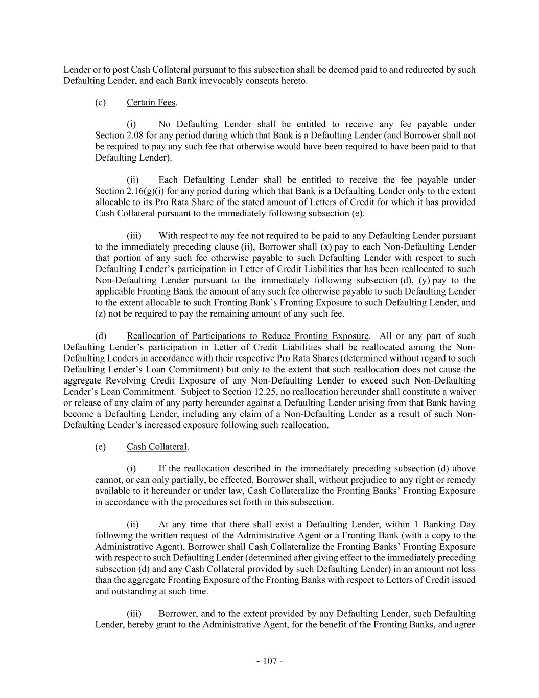 - 107 - Lender or to post Cash Collateral pursuant to this subsection shall be deemed paid to and redirected by such Defaulting Lender, and each Bank irrevocably consents hereto. (c) Certain Fees. (i) No Defaulting Lender shall be entitled to receive any fee payable under Section 2.08 for any period during which that Bank is a Defaulting Lender (and Borrower shall not be required to pay any such fee that otherwise would have been required to have been paid to that Defaulting Lender). (ii) Each Defaulting Lender shall be entitled to receive the fee payable under Section 2.16(g)(i) for any period during which that Bank is a Defaulting Lender only to the extent allocable to its Pro Rata Share of the stated amount of Letters of Credit for which it has provided Cash Collateral pursuant to the immediately following subsection (e). (iii) With respect to any fee not required to be paid to any Defaulting Lender pursuant to the immediately preceding clause (ii), Borrower shall (x) pay to each Non-Defaulting Lender that portion of any such fee otherwise payable to such Defaulting Lender with respect to such Defaulting Lender’s participation in Letter of Credit Liabilities that has been reallocated to such Non-Defaulting Lender pursuant to the immediately following subsection (d), (y) pay to the applicable Fronting Bank the amount of any such fee otherwise payable to such Defaulting Lender to the extent allocable to such Fronting Bank’s Fronting Exposure to such Defaulting Lender, and (z) not be required to pay the remaining amount of any such fee. (d) Reallocation of Participations to Reduce Fronting Exposure. All or any part of such Defaulting Lender’s participation in Letter of Credit Liabilities shall be reallocated among the Non- Defaulting Lenders in accordance with their respective Pro Rata Shares (determined without regard to such Defaulting Lender’s Loan Commitment) but only to the extent that such reallocation does not cause the aggregate Revolving Credit Exposure of any Non-Defaulting Lender to exceed such Non-Defaulting Lender’s Loan Commitment. Subject to Section 12.25, no reallocation hereunder shall constitute a waiver or release of any claim of any party hereunder against a Defaulting Lender arising from that Bank having become a Defaulting Lender, including any claim of a Non-Defaulting Lender as a result of such Non- Defaulting Lender’s increased exposure following such reallocation. (e) Cash Collateral. (i) If the reallocation described in the immediately preceding subsection (d) above cannot, or can only partially, be effected, Borrower shall, without prejudice to any right or remedy available to it hereunder or under law, Cash Collateralize the Fronting Banks’ Fronting Exposure in accordance with the procedures set forth in this subsection. (ii) At any time that there shall exist a Defaulting Lender, within 1 Banking Day following the written request of the Administrative Agent or a Fronting Bank (with a copy to the Administrative Agent), Borrower shall Cash Collateralize the Fronting Banks’ Fronting Exposure with respect to such Defaulting Lender (determined after giving effect to the immediately preceding subsection (d) and any Cash Collateral provided by such Defaulting Lender) in an amount not less than the aggregate Fronting Exposure of the Fronting Banks with respect to Letters of Credit issued and outstanding at such time. (iii) Borrower, and to the extent provided by any Defaulting Lender, such Defaulting Lender, hereby grant to the Administrative Agent, for the benefit of the Fronting Banks, and agree