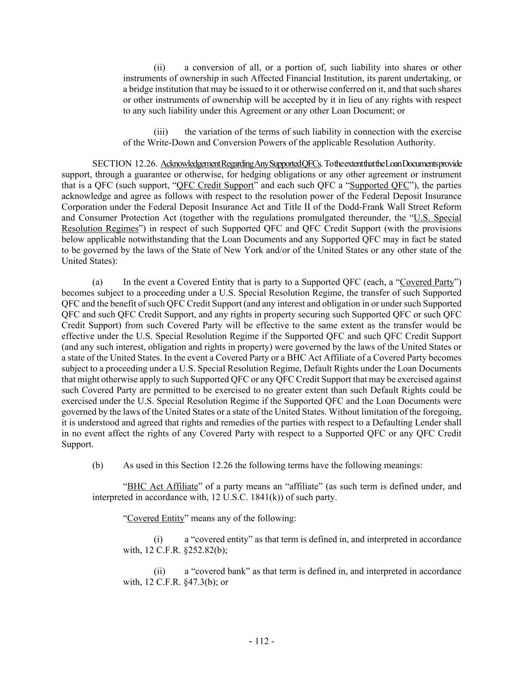 - 112 - (ii) a conversion of all, or a portion of, such liability into shares or other instruments of ownership in such Affected Financial Institution, its parent undertaking, or a bridge institution that may be issued to it or otherwise conferred on it, and that such shares or other instruments of ownership will be accepted by it in lieu of any rights with respect to any such liability under this Agreement or any other Loan Document; or (iii) the variation of the terms of such liability in connection with the exercise of the Write-Down and Conversion Powers of the applicable Resolution Authority. SECTION 12.26. Acknowledgement Regarding Any Supported QFCs. To the extent that the Loan Documents provide support, through a guarantee or otherwise, for hedging obligations or any other agreement or instrument that is a QFC (such support, “QFC Credit Support” and each such QFC a “Supported QFC”), the parties acknowledge and agree as follows with respect to the resolution power of the Federal Deposit Insurance Corporation under the Federal Deposit Insurance Act and Title II of the Dodd-Frank Wall Street Reform and Consumer Protection Act (together with the regulations promulgated thereunder, the “U.S. Special Resolution Regimes”) in respect of such Supported QFC and QFC Credit Support (with the provisions below applicable notwithstanding that the Loan Documents and any Supported QFC may in fact be stated to be governed by the laws of the State of New York and/or of the United States or any other state of the United States): (a) In the event a Covered Entity that is party to a Supported QFC (each, a “Covered Party”) becomes subject to a proceeding under a U.S. Special Resolution Regime, the transfer of such Supported QFC and the benefit of such QFC Credit Support (and any interest and obligation in or under such Supported QFC and such QFC Credit Support, and any rights in property securing such Supported QFC or such QFC Credit Support) from such Covered Party will be effective to the same extent as the transfer would be effective under the U.S. Special Resolution Regime if the Supported QFC and such QFC Credit Support (and any such interest, obligation and rights in property) were governed by the laws of the United States or a state of the United States. In the event a Covered Party or a BHC Act Affiliate of a Covered Party becomes subject to a proceeding under a U.S. Special Resolution Regime, Default Rights under the Loan Documents that might otherwise apply to such Supported QFC or any QFC Credit Support that may be exercised against such Covered Party are permitted to be exercised to no greater extent than such Default Rights could be exercised under the U.S. Special Resolution Regime if the Supported QFC and the Loan Documents were governed by the laws of the United States or a state of the United States. Without limitation of the foregoing, it is understood and agreed that rights and remedies of the parties with respect to a Defaulting Lender shall in no event affect the rights of any Covered Party with respect to a Supported QFC or any QFC Credit Support. (b) As used in this Section 12.26 the following terms have the following meanings: “BHC Act Affiliate” of a party means an “affiliate” (as such term is defined under, and interpreted in accordance with, 12 U.S.C. 1841(k)) of such party. “Covered Entity” means any of the following: (i) a “covered entity” as that term is defined in, and interpreted in accordance with, 12 C.F.R. §252.82(b); (ii) a “covered bank” as that term is defined in, and interpreted in accordance with, 12 C.F.R. §47.3(b); or