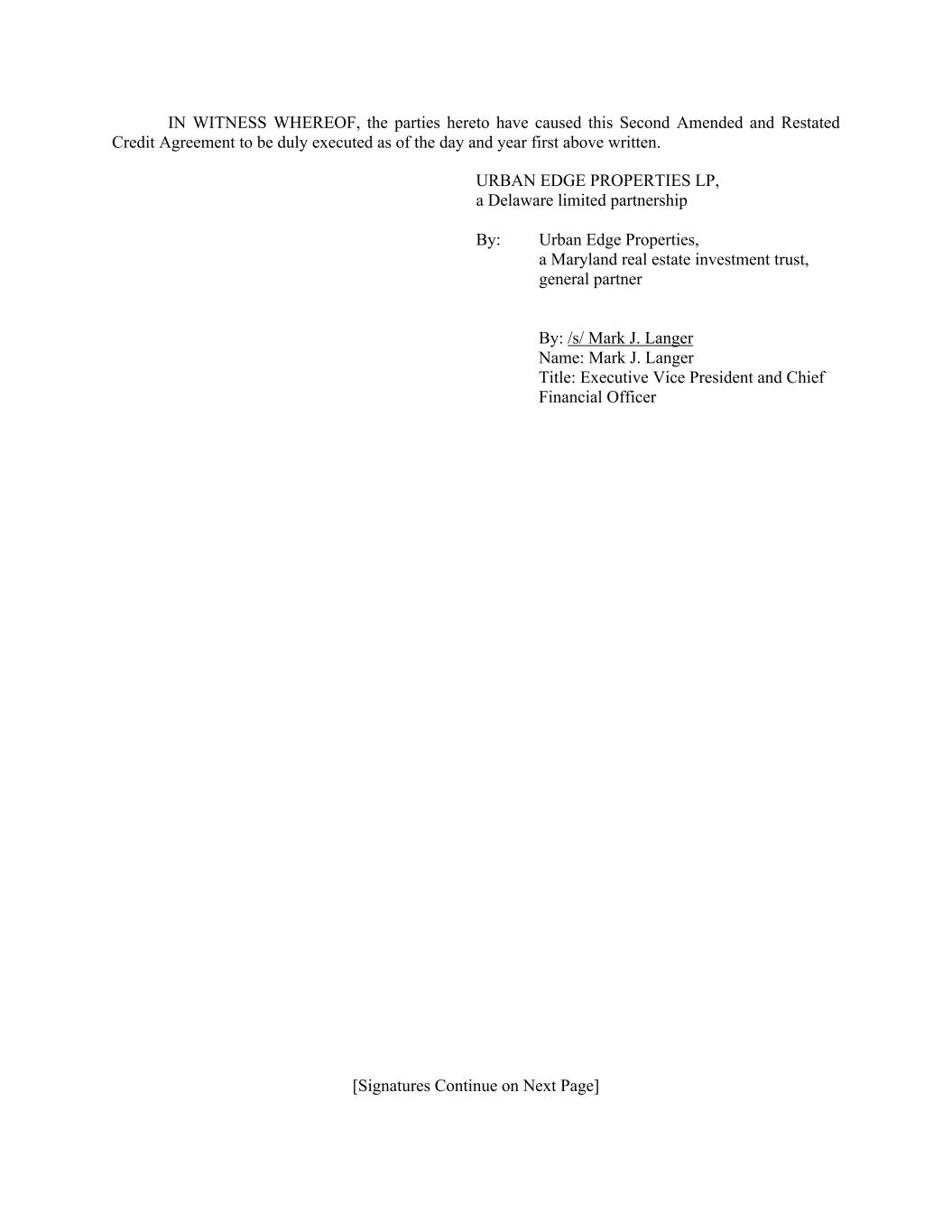 IN WITNESS WHEREOF, the parties hereto have caused this Second Amended and Restated Credit Agreement to be duly executed as of the day and year first above written. URBAN EDGE PROPERTIES LP, a Delaware limited partnership By: Urban Edge Properties, a Maryland real estate investment trust, general partner By: /s/ Mark J. Langer Name: Mark J. Langer Title: Executive Vice President and Chief Financial Officer [Signatures Continue on Next Page]