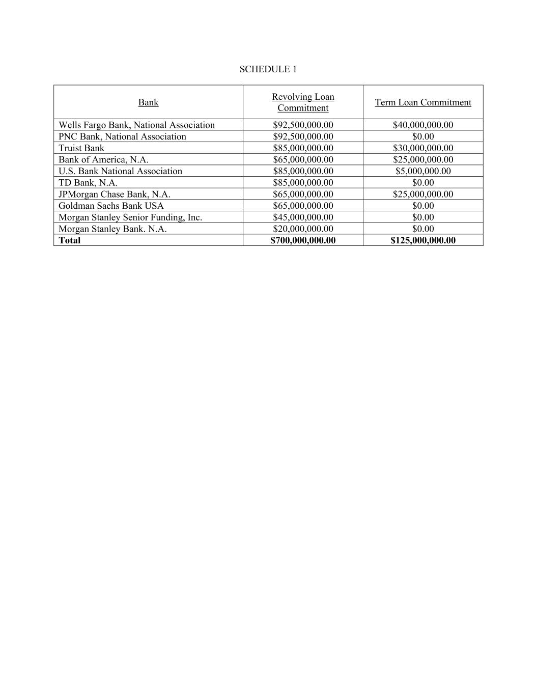 SCHEDULE 1 Bank Revolving Loan Commitment Term Loan Commitment Wells Fargo Bank, National Association $92,500,000.00 $40,000,000.00 PNC Bank, National Association $92,500,000.00 $0.00 Truist Bank $85,000,000.00 $30,000,000.00 Bank of America, N.A. $65,000,000.00 $25,000,000.00 U.S. Bank National Association $85,000,000.00 $5,000,000.00 TD Bank, N.A. $85,000,000.00 $0.00 JPMorgan Chase Bank, N.A. $65,000,000.00 $25,000,000.00 Goldman Sachs Bank USA $65,000,000.00 $0.00 Morgan Stanley Senior Funding, Inc. $45,000,000.00 $0.00 Morgan Stanley Bank. N.A. $20,000,000.00 $0.00 Total $700,000,000.00 $125,000,000.00