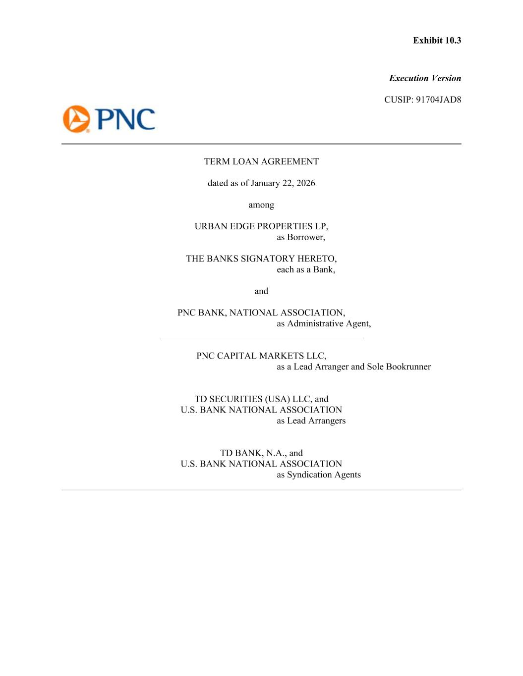 Exhibit 10.3 Execution Version CUSIP: 91704JAD8 TERM LOAN AGREEMENT dated as of January 22, 2026 among URBAN EDGE PROPERTIES LP, as Borrower, THE BANKS SIGNATORY HERETO, each as a Bank, and PNC BANK, NATIONAL ASSOCIATION, as Administrative Agent, ___________________________________________ PNC CAPITAL MARKETS LLC, as a Lead Arranger and Sole Bookrunner TD SECURITIES (USA) LLC, and U.S. BANK NATIONAL ASSOCIATION as Lead Arrangers TD BANK, N.A., and U.S. BANK NATIONAL ASSOCIATION as Syndication Agents