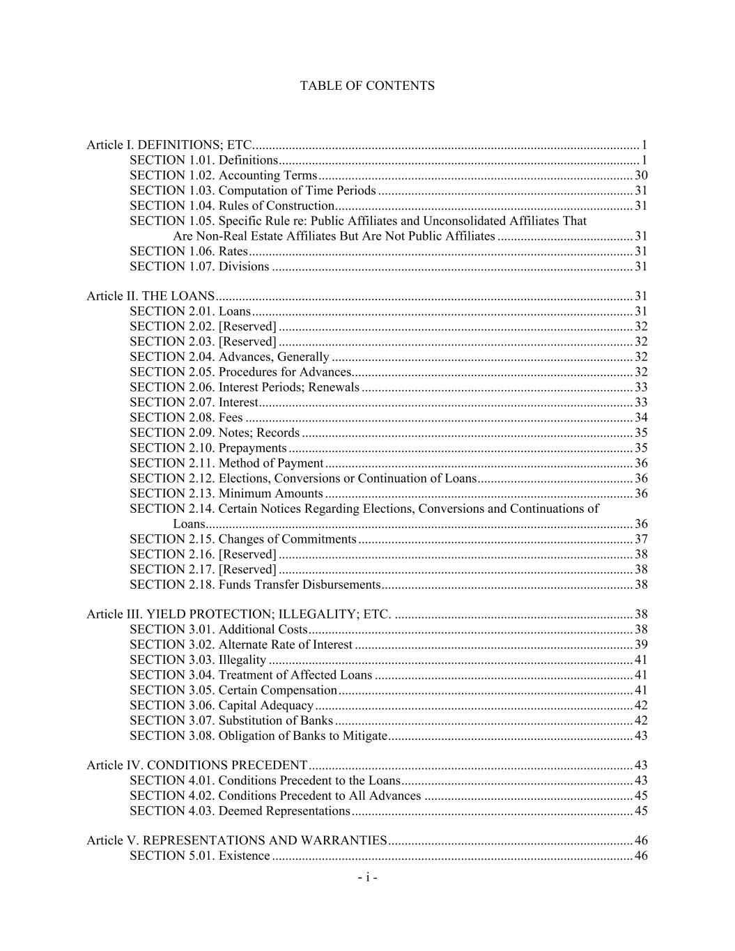 TABLE OF CONTENTS - i - Article I. DEFINITIONS; ETC. .................................................................................................................... 1 SECTION 1.01. Definitions ............................................................................................................. 1 SECTION 1.02. Accounting Terms ............................................................................................... 30 SECTION 1.03. Computation of Time Periods ............................................................................. 31 SECTION 1.04. Rules of Construction .......................................................................................... 31 SECTION 1.05. Specific Rule re: Public Affiliates and Unconsolidated Affiliates That Are Non-Real Estate Affiliates But Are Not Public Affiliates ......................................... 31 SECTION 1.06. Rates .................................................................................................................... 31 SECTION 1.07. Divisions ............................................................................................................. 31 Article II. THE LOANS .............................................................................................................................. 31 SECTION 2.01. Loans ................................................................................................................... 31 SECTION 2.02. [Reserved] ........................................................................................................... 32 SECTION 2.03. [Reserved] ........................................................................................................... 32 SECTION 2.04. Advances, Generally ........................................................................................... 32 SECTION 2.05. Procedures for Advances ..................................................................................... 32 SECTION 2.06. Interest Periods; Renewals .................................................................................. 33 SECTION 2.07. Interest ................................................................................................................. 33 SECTION 2.08. Fees ..................................................................................................................... 34 SECTION 2.09. Notes; Records .................................................................................................... 35 SECTION 2.10. Prepayments ........................................................................................................ 35 SECTION 2.11. Method of Payment ............................................................................................. 36 SECTION 2.12. Elections, Conversions or Continuation of Loans ............................................... 36 SECTION 2.13. Minimum Amounts ............................................................................................. 36 SECTION 2.14. Certain Notices Regarding Elections, Conversions and Continuations of Loans ................................................................................................................................. 36 SECTION 2.15. Changes of Commitments ................................................................................... 37 SECTION 2.16. [Reserved] ........................................................................................................... 38 SECTION 2.17. [Reserved] ........................................................................................................... 38 SECTION 2.18. Funds Transfer Disbursements ............................................................................ 38 Article III. YIELD PROTECTION; ILLEGALITY; ETC. ........................................................................ 38 SECTION 3.01. Additional Costs .................................................................................................. 38 SECTION 3.02. Alternate Rate of Interest .................................................................................... 39 SECTION 3.03. Illegality .............................................................................................................. 41 SECTION 3.04. Treatment of Affected Loans .............................................................................. 41 SECTION 3.05. Certain Compensation ......................................................................................... 41 SECTION 3.06. Capital Adequacy ................................................................................................ 42 SECTION 3.07. Substitution of Banks .......................................................................................... 42 SECTION 3.08. Obligation of Banks to Mitigate .......................................................................... 43 Article IV. CONDITIONS PRECEDENT .................................................................................................. 43 SECTION 4.01. Conditions Precedent to the Loans ...................................................................... 43 SECTION 4.02. Conditions Precedent to All Advances ............................................................... 45 SECTION 4.03. Deemed Representations ..................................................................................... 45 Article V. REPRESENTATIONS AND WARRANTIES .......................................................................... 46 SECTION 5.01. Existence ............................................................................................................. 46