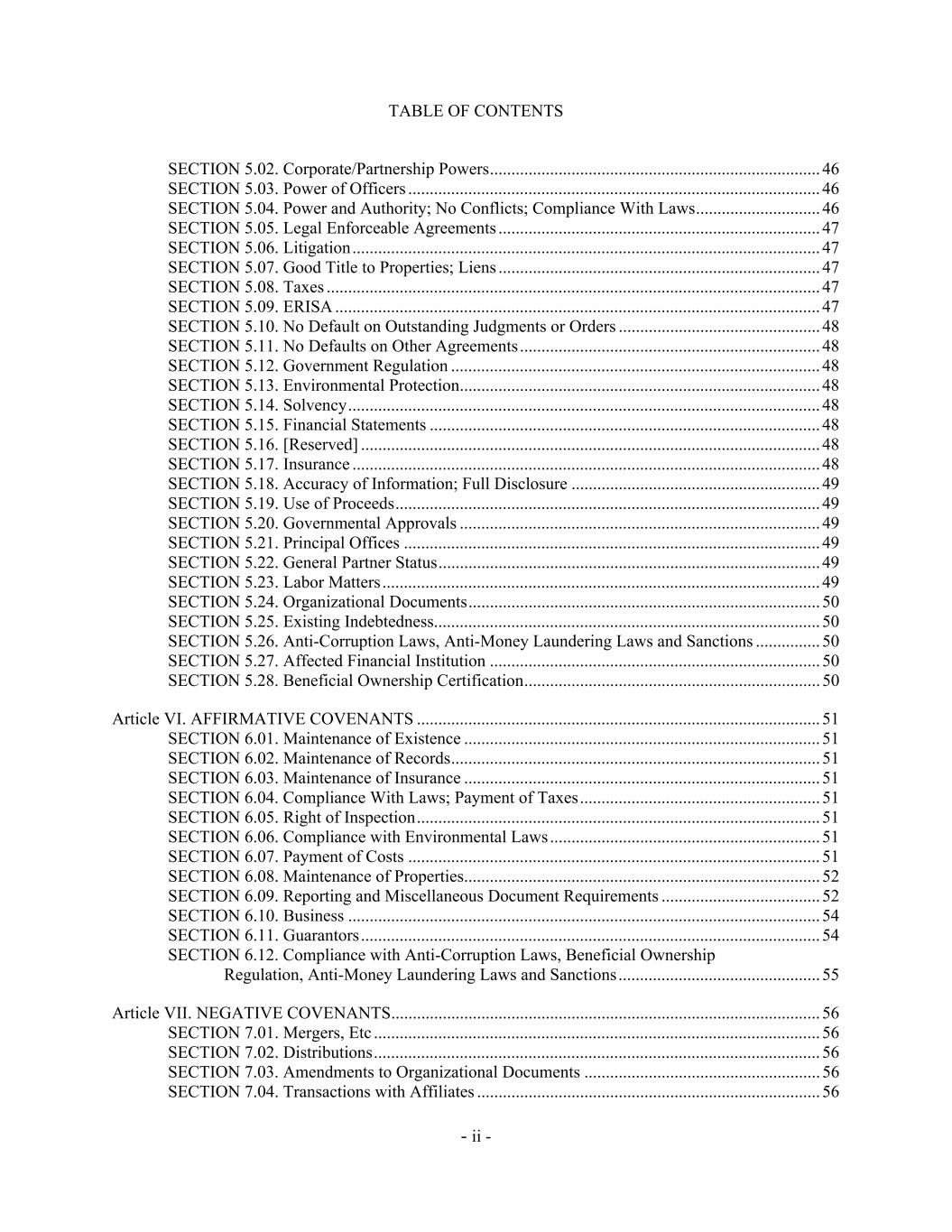 TABLE OF CONTENTS - ii - SECTION 5.02. Corporate/Partnership Powers ............................................................................. 46 SECTION 5.03. Power of Officers ................................................................................................ 46 SECTION 5.04. Power and Authority; No Conflicts; Compliance With Laws ............................. 46 SECTION 5.05. Legal Enforceable Agreements ........................................................................... 47 SECTION 5.06. Litigation ............................................................................................................. 47 SECTION 5.07. Good Title to Properties; Liens ........................................................................... 47 SECTION 5.08. Taxes ................................................................................................................... 47 SECTION 5.09. ERISA ................................................................................................................. 47 SECTION 5.10. No Default on Outstanding Judgments or Orders ............................................... 48 SECTION 5.11. No Defaults on Other Agreements ...................................................................... 48 SECTION 5.12. Government Regulation ...................................................................................... 48 SECTION 5.13. Environmental Protection .................................................................................... 48 SECTION 5.14. Solvency .............................................................................................................. 48 SECTION 5.15. Financial Statements ........................................................................................... 48 SECTION 5.16. [Reserved] ........................................................................................................... 48 SECTION 5.17. Insurance ............................................................................................................. 48 SECTION 5.18. Accuracy of Information; Full Disclosure .......................................................... 49 SECTION 5.19. Use of Proceeds ................................................................................................... 49 SECTION 5.20. Governmental Approvals .................................................................................... 49 SECTION 5.21. Principal Offices ................................................................................................. 49 SECTION 5.22. General Partner Status ......................................................................................... 49 SECTION 5.23. Labor Matters ...................................................................................................... 49 SECTION 5.24. Organizational Documents .................................................................................. 50 SECTION 5.25. Existing Indebtedness.......................................................................................... 50 SECTION 5.26. Anti-Corruption Laws, Anti-Money Laundering Laws and Sanctions ............... 50 SECTION 5.27. Affected Financial Institution ............................................................................. 50 SECTION 5.28. Beneficial Ownership Certification ..................................................................... 50 Article VI. AFFIRMATIVE COVENANTS .............................................................................................. 51 SECTION 6.01. Maintenance of Existence ................................................................................... 51 SECTION 6.02. Maintenance of Records ...................................................................................... 51 SECTION 6.03. Maintenance of Insurance ................................................................................... 51 SECTION 6.04. Compliance With Laws; Payment of Taxes ........................................................ 51 SECTION 6.05. Right of Inspection .............................................................................................. 51 SECTION 6.06. Compliance with Environmental Laws ............................................................... 51 SECTION 6.07. Payment of Costs ................................................................................................ 51 SECTION 6.08. Maintenance of Properties ................................................................................... 52 SECTION 6.09. Reporting and Miscellaneous Document Requirements ..................................... 52 SECTION 6.10. Business .............................................................................................................. 54 SECTION 6.11. Guarantors ........................................................................................................... 54 SECTION 6.12. Compliance with Anti-Corruption Laws, Beneficial Ownership Regulation, Anti-Money Laundering Laws and Sanctions ............................................... 55 Article VII. NEGATIVE COVENANTS .................................................................................................... 56 SECTION 7.01. Mergers, Etc ........................................................................................................ 56 SECTION 7.02. Distributions ........................................................................................................ 56 SECTION 7.03. Amendments to Organizational Documents ....................................................... 56 SECTION 7.04. Transactions with Affiliates ................................................................................ 56