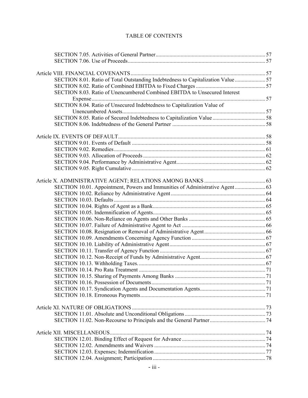 TABLE OF CONTENTS - iii - SECTION 7.05. Activities of General Partner ............................................................................... 57 SECTION 7.06. Use of Proceeds ................................................................................................... 57 Article VIII. FINANCIAL COVENANTS ................................................................................................. 57 SECTION 8.01. Ratio of Total Outstanding Indebtedness to Capitalization Value ...................... 57 SECTION 8.02. Ratio of Combined EBITDA to Fixed Charges .................................................. 57 SECTION 8.03. Ratio of Unencumbered Combined EBITDA to Unsecured Interest Expense ............................................................................................................................. 57 SECTION 8.04. Ratio of Unsecured Indebtedness to Capitalization Value of Unencumbered Assets ....................................................................................................... 57 SECTION 8.05. Ratio of Secured Indebtedness to Capitalization Value ...................................... 58 SECTION 8.06. Indebtedness of the General Partner ................................................................... 58 Article IX. EVENTS OF DEFAULT .......................................................................................................... 58 SECTION 9.01. Events of Default ................................................................................................ 58 SECTION 9.02. Remedies ............................................................................................................. 61 SECTION 9.03. Allocation of Proceeds ........................................................................................ 62 SECTION 9.04. Performance by Administrative Agent ................................................................ 62 SECTION 9.05. Right Cumulative ................................................................................................ 62 Article X. ADMINISTRATIVE AGENT; RELATIONS AMONG BANKS ............................................ 63 SECTION 10.01. Appointment, Powers and Immunities of Administrative Agent ...................... 63 SECTION 10.02. Reliance by Administrative Agent .................................................................... 64 SECTION 10.03. Defaults ............................................................................................................. 64 SECTION 10.04. Rights of Agent as a Bank ................................................................................. 65 SECTION 10.05. Indemnification of Agents ................................................................................. 65 SECTION 10.06. Non-Reliance on Agents and Other Banks ....................................................... 65 SECTION 10.07. Failure of Administrative Agent to Act ............................................................ 66 SECTION 10.08. Resignation or Removal of Administrative Agent ............................................ 66 SECTION 10.09. Amendments Concerning Agency Function ..................................................... 67 SECTION 10.10. Liability of Administrative Agent ..................................................................... 67 SECTION 10.11. Transfer of Agency Function ............................................................................ 67 SECTION 10.12. Non-Receipt of Funds by Administrative Agent ............................................... 67 SECTION 10.13. Withholding Taxes. ........................................................................................... 67 SECTION 10.14. Pro Rata Treatment ........................................................................................... 71 SECTION 10.15. Sharing of Payments Among Banks ................................................................. 71 SECTION 10.16. Possession of Documents .................................................................................. 71 SECTION 10.17. Syndication Agents and Documentation Agents ............................................... 71 SECTION 10.18. Erroneous Payments .......................................................................................... 71 Article XI. NATURE OF OBLIGATIONS ................................................................................................ 73 SECTION 11.01. Absolute and Unconditional Obligations .......................................................... 73 SECTION 11.02. Non-Recourse to Principals and the General Partner ........................................ 74 Article XII. MISCELLANEOUS ................................................................................................................ 74 SECTION 12.01. Binding Effect of Request for Advance ............................................................ 74 SECTION 12.02. Amendments and Waivers ................................................................................ 74 SECTION 12.03. Expenses; Indemnification ................................................................................ 77 SECTION 12.04. Assignment; Participation ................................................................................. 78