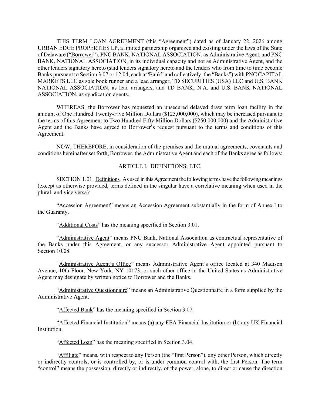 THIS TERM LOAN AGREEMENT (this “Agreement”) dated as of January 22, 2026 among URBAN EDGE PROPERTIES LP, a limited partnership organized and existing under the laws of the State of Delaware (“Borrower”), PNC BANK, NATIONAL ASSOCIATION, as Administrative Agent, and PNC BANK, NATIONAL ASSOCIATION, in its individual capacity and not as Administrative Agent, and the other lenders signatory hereto (said lenders signatory hereto and the lenders who from time to time become Banks pursuant to Section 3.07 or 12.04, each a “Bank” and collectively, the “Banks”) with PNC CAPITAL MARKETS LLC as sole book runner and a lead arranger, TD SECURITIES (USA) LLC and U.S. BANK NATIONAL ASSOCIATION, as lead arrangers, and TD BANK, N.A. and U.S. BANK NATIONAL ASSOCIATION, as syndication agents. WHEREAS, the Borrower has requested an unsecured delayed draw term loan facility in the amount of One Hundred Twenty-Five Million Dollars ($125,000,000), which may be increased pursuant to the terms of this Agreement to Two Hundred Fifty Million Dollars ($250,000,000) and the Administrative Agent and the Banks have agreed to Borrower’s request pursuant to the terms and conditions of this Agreement. NOW, THEREFORE, in consideration of the premises and the mutual agreements, covenants and conditions hereinafter set forth, Borrower, the Administrative Agent and each of the Banks agree as follows: ARTICLE I. DEFINITIONS; ETC. SECTION 1.01. Definitions. As used in this Agreement the following terms have the following meanings (except as otherwise provided, terms defined in the singular have a correlative meaning when used in the plural, and vice versa): “Accession Agreement” means an Accession Agreement substantially in the form of Annex I to the Guaranty. “Additional Costs” has the meaning specified in Section 3.01. “Administrative Agent” means PNC Bank, National Association as contractual representative of the Banks under this Agreement, or any successor Administrative Agent appointed pursuant to Section 10.08. “Administrative Agent’s Office” means Administrative Agent’s office located at 340 Madison Avenue, 10th Floor, New York, NY 10173, or such other office in the United States as Administrative Agent may designate by written notice to Borrower and the Banks. “Administrative Questionnaire” means an Administrative Questionnaire in a form supplied by the Administrative Agent. “Affected Bank” has the meaning specified in Section 3.07. “Affected Financial Institution” means (a) any EEA Financial Institution or (b) any UK Financial Institution. “Affected Loan” has the meaning specified in Section 3.04. “Affiliate” means, with respect to any Person (the “first Person”), any other Person, which directly or indirectly controls, or is controlled by, or is under common control with, the first Person. The term “control” means the possession, directly or indirectly, of the power, alone, to direct or cause the direction