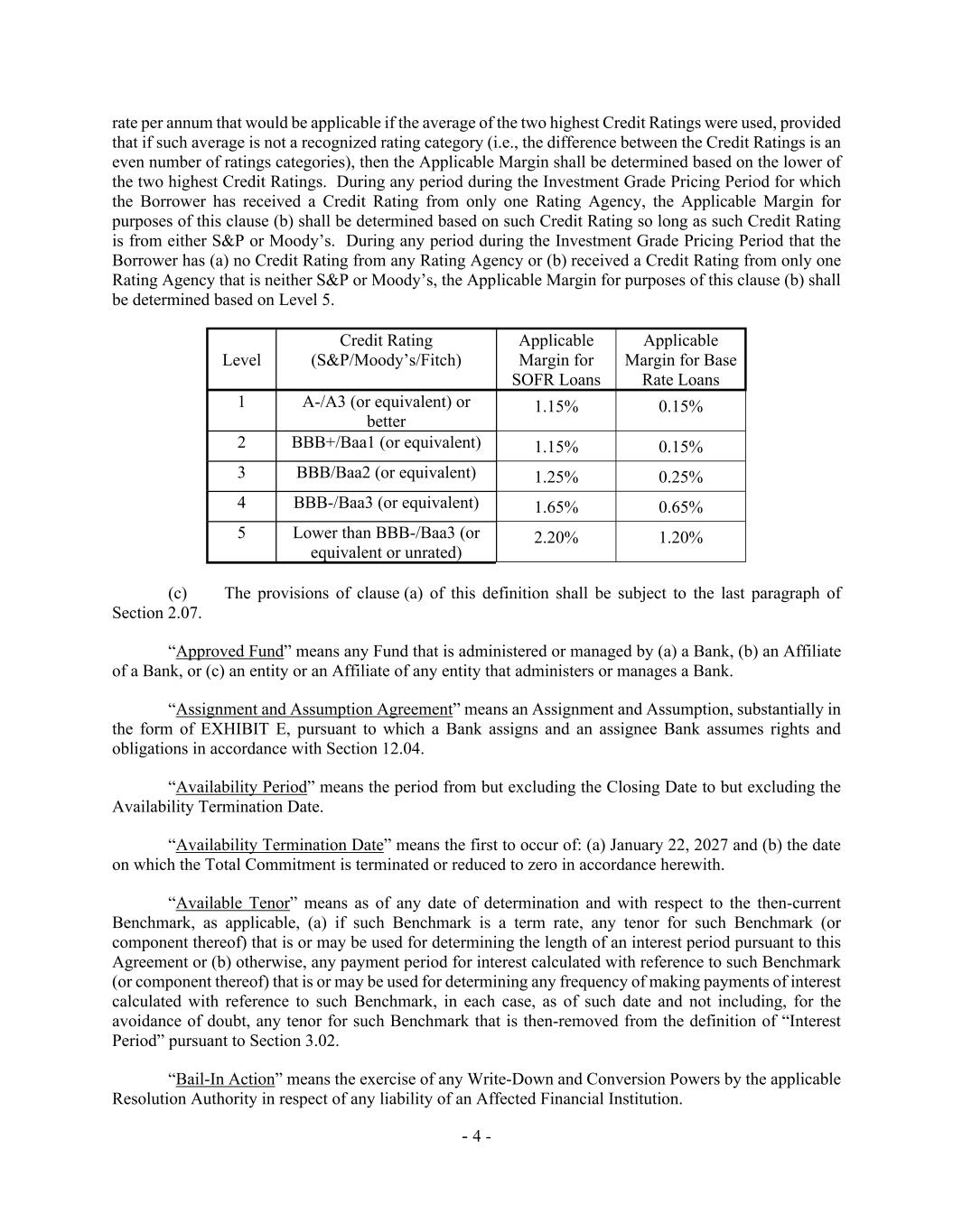 - 4 - rate per annum that would be applicable if the average of the two highest Credit Ratings were used, provided that if such average is not a recognized rating category (i.e., the difference between the Credit Ratings is an even number of ratings categories), then the Applicable Margin shall be determined based on the lower of the two highest Credit Ratings. During any period during the Investment Grade Pricing Period for which the Borrower has received a Credit Rating from only one Rating Agency, the Applicable Margin for purposes of this clause (b) shall be determined based on such Credit Rating so long as such Credit Rating is from either S&P or Moody’s. During any period during the Investment Grade Pricing Period that the Borrower has (a) no Credit Rating from any Rating Agency or (b) received a Credit Rating from only one Rating Agency that is neither S&P or Moody’s, the Applicable Margin for purposes of this clause (b) shall be determined based on Level 5. Level Credit Rating (S&P/Moody’s/Fitch) Applicable Margin for SOFR Loans Applicable Margin for Base Rate Loans 1 A-/A3 (or equivalent) or better 1.15% 0.15% 2 BBB+/Baa1 (or equivalent) 1.15% 0.15% 3 BBB/Baa2 (or equivalent) 1.25% 0.25% 4 BBB-/Baa3 (or equivalent) 1.65% 0.65% 5 Lower than BBB-/Baa3 (or equivalent or unrated) 2.20% 1.20% (c) The provisions of clause (a) of this definition shall be subject to the last paragraph of Section 2.07. “Approved Fund” means any Fund that is administered or managed by (a) a Bank, (b) an Affiliate of a Bank, or (c) an entity or an Affiliate of any entity that administers or manages a Bank. “Assignment and Assumption Agreement” means an Assignment and Assumption, substantially in the form of EXHIBIT E, pursuant to which a Bank assigns and an assignee Bank assumes rights and obligations in accordance with Section 12.04. “Availability Period” means the period from but excluding the Closing Date to but excluding the Availability Termination Date. “Availability Termination Date” means the first to occur of: (a) January 22, 2027 and (b) the date on which the Total Commitment is terminated or reduced to zero in accordance herewith. “Available Tenor” means as of any date of determination and with respect to the then-current Benchmark, as applicable, (a) if such Benchmark is a term rate, any tenor for such Benchmark (or component thereof) that is or may be used for determining the length of an interest period pursuant to this Agreement or (b) otherwise, any payment period for interest calculated with reference to such Benchmark (or component thereof) that is or may be used for determining any frequency of making payments of interest calculated with reference to such Benchmark, in each case, as of such date and not including, for the avoidance of doubt, any tenor for such Benchmark that is then-removed from the definition of “Interest Period” pursuant to Section 3.02. “Bail-In Action” means the exercise of any Write-Down and Conversion Powers by the applicable Resolution Authority in respect of any liability of an Affected Financial Institution.