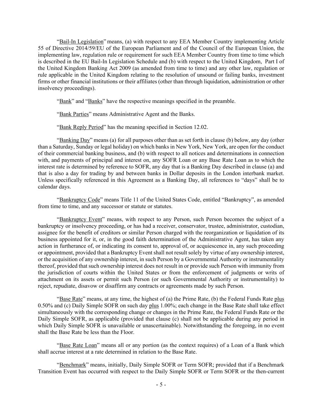 - 5 - “Bail-In Legislation” means, (a) with respect to any EEA Member Country implementing Article 55 of Directive 2014/59/EU of the European Parliament and of the Council of the European Union, the implementing law, regulation rule or requirement for such EEA Member Country from time to time which is described in the EU Bail-In Legislation Schedule and (b) with respect to the United Kingdom, Part I of the United Kingdom Banking Act 2009 (as amended from time to time) and any other law, regulation or rule applicable in the United Kingdom relating to the resolution of unsound or failing banks, investment firms or other financial institutions or their affiliates (other than through liquidation, administration or other insolvency proceedings). “Bank” and “Banks” have the respective meanings specified in the preamble. “Bank Parties” means Administrative Agent and the Banks. “Bank Reply Period” has the meaning specified in Section 12.02. “Banking Day” means (a) for all purposes other than as set forth in clause (b) below, any day (other than a Saturday, Sunday or legal holiday) on which banks in New York, New York, are open for the conduct of their commercial banking business, and (b) with respect to all notices and determinations in connection with, and payments of principal and interest on, any SOFR Loan or any Base Rate Loan as to which the interest rate is determined by reference to SOFR, any day that is a Banking Day described in clause (a) and that is also a day for trading by and between banks in Dollar deposits in the London interbank market. Unless specifically referenced in this Agreement as a Banking Day, all references to “days” shall be to calendar days. “Bankruptcy Code” means Title 11 of the United States Code, entitled “Bankruptcy”, as amended from time to time, and any successor or statute or statutes. “Bankruptcy Event” means, with respect to any Person, such Person becomes the subject of a bankruptcy or insolvency proceeding, or has had a receiver, conservator, trustee, administrator, custodian, assignee for the benefit of creditors or similar Person charged with the reorganization or liquidation of its business appointed for it, or, in the good faith determination of the Administrative Agent, has taken any action in furtherance of, or indicating its consent to, approval of, or acquiescence in, any such proceeding or appointment, provided that a Bankruptcy Event shall not result solely by virtue of any ownership interest, or the acquisition of any ownership interest, in such Person by a Governmental Authority or instrumentality thereof, provided that such ownership interest does not result in or provide such Person with immunity from the jurisdiction of courts within the United States or from the enforcement of judgments or writs of attachment on its assets or permit such Person (or such Governmental Authority or instrumentality) to reject, repudiate, disavow or disaffirm any contracts or agreements made by such Person. “Base Rate” means, at any time, the highest of (a) the Prime Rate, (b) the Federal Funds Rate plus 0.50% and (c) Daily Simple SOFR on such day plus 1.00%; each change in the Base Rate shall take effect simultaneously with the corresponding change or changes in the Prime Rate, the Federal Funds Rate or the Daily Simple SOFR, as applicable (provided that clause (c) shall not be applicable during any period in which Daily Simple SOFR is unavailable or unascertainable). Notwithstanding the foregoing, in no event shall the Base Rate be less than the Floor. “Base Rate Loan” means all or any portion (as the context requires) of a Loan of a Bank which shall accrue interest at a rate determined in relation to the Base Rate. “Benchmark” means, initially, Daily Simple SOFR or Term SOFR; provided that if a Benchmark Transition Event has occurred with respect to the Daily Simple SOFR or Term SOFR or the then-current