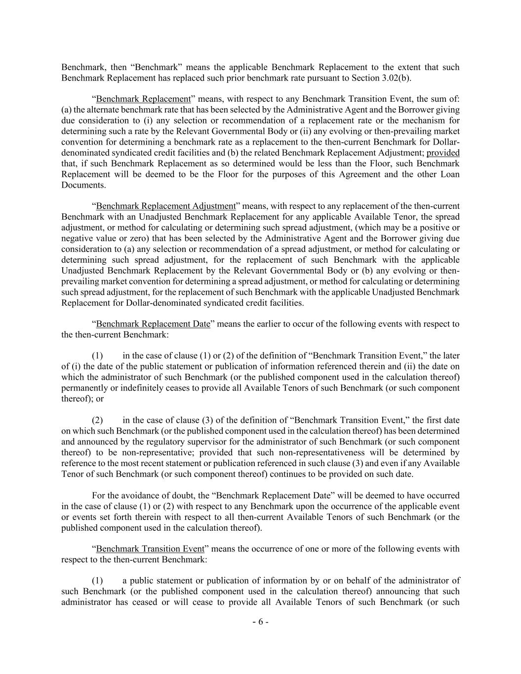 - 6 - Benchmark, then “Benchmark” means the applicable Benchmark Replacement to the extent that such Benchmark Replacement has replaced such prior benchmark rate pursuant to Section 3.02(b). “Benchmark Replacement” means, with respect to any Benchmark Transition Event, the sum of: (a) the alternate benchmark rate that has been selected by the Administrative Agent and the Borrower giving due consideration to (i) any selection or recommendation of a replacement rate or the mechanism for determining such a rate by the Relevant Governmental Body or (ii) any evolving or then-prevailing market convention for determining a benchmark rate as a replacement to the then-current Benchmark for Dollar- denominated syndicated credit facilities and (b) the related Benchmark Replacement Adjustment; provided that, if such Benchmark Replacement as so determined would be less than the Floor, such Benchmark Replacement will be deemed to be the Floor for the purposes of this Agreement and the other Loan Documents. “Benchmark Replacement Adjustment” means, with respect to any replacement of the then-current Benchmark with an Unadjusted Benchmark Replacement for any applicable Available Tenor, the spread adjustment, or method for calculating or determining such spread adjustment, (which may be a positive or negative value or zero) that has been selected by the Administrative Agent and the Borrower giving due consideration to (a) any selection or recommendation of a spread adjustment, or method for calculating or determining such spread adjustment, for the replacement of such Benchmark with the applicable Unadjusted Benchmark Replacement by the Relevant Governmental Body or (b) any evolving or then- prevailing market convention for determining a spread adjustment, or method for calculating or determining such spread adjustment, for the replacement of such Benchmark with the applicable Unadjusted Benchmark Replacement for Dollar-denominated syndicated credit facilities. “Benchmark Replacement Date” means the earlier to occur of the following events with respect to the then-current Benchmark: (1) in the case of clause (1) or (2) of the definition of “Benchmark Transition Event,” the later of (i) the date of the public statement or publication of information referenced therein and (ii) the date on which the administrator of such Benchmark (or the published component used in the calculation thereof) permanently or indefinitely ceases to provide all Available Tenors of such Benchmark (or such component thereof); or (2) in the case of clause (3) of the definition of “Benchmark Transition Event,” the first date on which such Benchmark (or the published component used in the calculation thereof) has been determined and announced by the regulatory supervisor for the administrator of such Benchmark (or such component thereof) to be non-representative; provided that such non-representativeness will be determined by reference to the most recent statement or publication referenced in such clause (3) and even if any Available Tenor of such Benchmark (or such component thereof) continues to be provided on such date. For the avoidance of doubt, the “Benchmark Replacement Date” will be deemed to have occurred in the case of clause (1) or (2) with respect to any Benchmark upon the occurrence of the applicable event or events set forth therein with respect to all then-current Available Tenors of such Benchmark (or the published component used in the calculation thereof). “Benchmark Transition Event” means the occurrence of one or more of the following events with respect to the then-current Benchmark: (1) a public statement or publication of information by or on behalf of the administrator of such Benchmark (or the published component used in the calculation thereof) announcing that such administrator has ceased or will cease to provide all Available Tenors of such Benchmark (or such