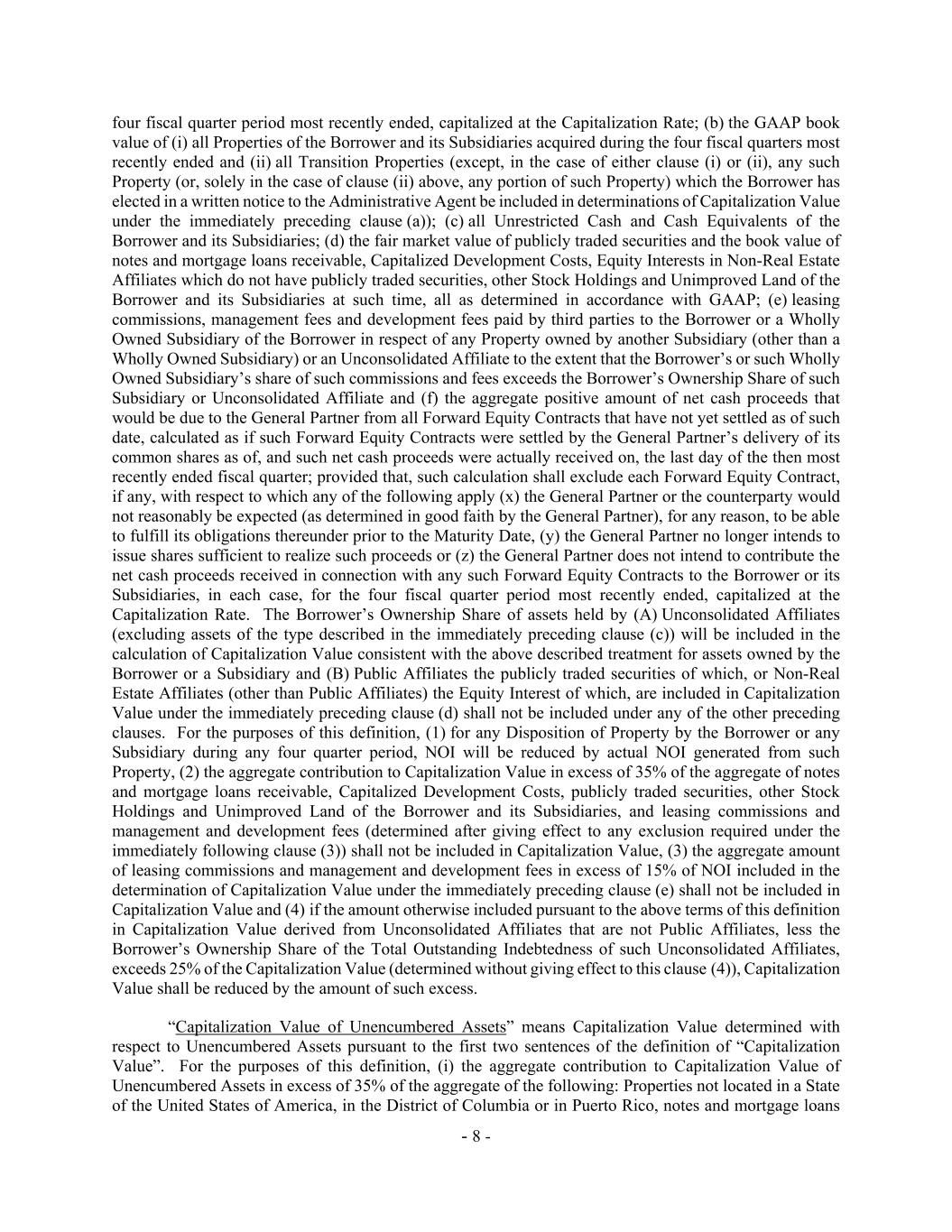 - 8 - four fiscal quarter period most recently ended, capitalized at the Capitalization Rate; (b) the GAAP book value of (i) all Properties of the Borrower and its Subsidiaries acquired during the four fiscal quarters most recently ended and (ii) all Transition Properties (except, in the case of either clause (i) or (ii), any such Property (or, solely in the case of clause (ii) above, any portion of such Property) which the Borrower has elected in a written notice to the Administrative Agent be included in determinations of Capitalization Value under the immediately preceding clause (a)); (c) all Unrestricted Cash and Cash Equivalents of the Borrower and its Subsidiaries; (d) the fair market value of publicly traded securities and the book value of notes and mortgage loans receivable, Capitalized Development Costs, Equity Interests in Non-Real Estate Affiliates which do not have publicly traded securities, other Stock Holdings and Unimproved Land of the Borrower and its Subsidiaries at such time, all as determined in accordance with GAAP; (e) leasing commissions, management fees and development fees paid by third parties to the Borrower or a Wholly Owned Subsidiary of the Borrower in respect of any Property owned by another Subsidiary (other than a Wholly Owned Subsidiary) or an Unconsolidated Affiliate to the extent that the Borrower’s or such Wholly Owned Subsidiary’s share of such commissions and fees exceeds the Borrower’s Ownership Share of such Subsidiary or Unconsolidated Affiliate and (f) the aggregate positive amount of net cash proceeds that would be due to the General Partner from all Forward Equity Contracts that have not yet settled as of such date, calculated as if such Forward Equity Contracts were settled by the General Partner’s delivery of its common shares as of, and such net cash proceeds were actually received on, the last day of the then most recently ended fiscal quarter; provided that, such calculation shall exclude each Forward Equity Contract, if any, with respect to which any of the following apply (x) the General Partner or the counterparty would not reasonably be expected (as determined in good faith by the General Partner), for any reason, to be able to fulfill its obligations thereunder prior to the Maturity Date, (y) the General Partner no longer intends to issue shares sufficient to realize such proceeds or (z) the General Partner does not intend to contribute the net cash proceeds received in connection with any such Forward Equity Contracts to the Borrower or its Subsidiaries, in each case, for the four fiscal quarter period most recently ended, capitalized at the Capitalization Rate. The Borrower’s Ownership Share of assets held by (A) Unconsolidated Affiliates (excluding assets of the type described in the immediately preceding clause (c)) will be included in the calculation of Capitalization Value consistent with the above described treatment for assets owned by the Borrower or a Subsidiary and (B) Public Affiliates the publicly traded securities of which, or Non-Real Estate Affiliates (other than Public Affiliates) the Equity Interest of which, are included in Capitalization Value under the immediately preceding clause (d) shall not be included under any of the other preceding clauses. For the purposes of this definition, (1) for any Disposition of Property by the Borrower or any Subsidiary during any four quarter period, NOI will be reduced by actual NOI generated from such Property, (2) the aggregate contribution to Capitalization Value in excess of 35% of the aggregate of notes and mortgage loans receivable, Capitalized Development Costs, publicly traded securities, other Stock Holdings and Unimproved Land of the Borrower and its Subsidiaries, and leasing commissions and management and development fees (determined after giving effect to any exclusion required under the immediately following clause (3)) shall not be included in Capitalization Value, (3) the aggregate amount of leasing commissions and management and development fees in excess of 15% of NOI included in the determination of Capitalization Value under the immediately preceding clause (e) shall not be included in Capitalization Value and (4) if the amount otherwise included pursuant to the above terms of this definition in Capitalization Value derived from Unconsolidated Affiliates that are not Public Affiliates, less the Borrower’s Ownership Share of the Total Outstanding Indebtedness of such Unconsolidated Affiliates, exceeds 25% of the Capitalization Value (determined without giving effect to this clause (4)), Capitalization Value shall be reduced by the amount of such excess. “Capitalization Value of Unencumbered Assets” means Capitalization Value determined with respect to Unencumbered Assets pursuant to the first two sentences of the definition of “Capitalization Value”. For the purposes of this definition, (i) the aggregate contribution to Capitalization Value of Unencumbered Assets in excess of 35% of the aggregate of the following: Properties not located in a State of the United States of America, in the District of Columbia or in Puerto Rico, notes and mortgage loans
