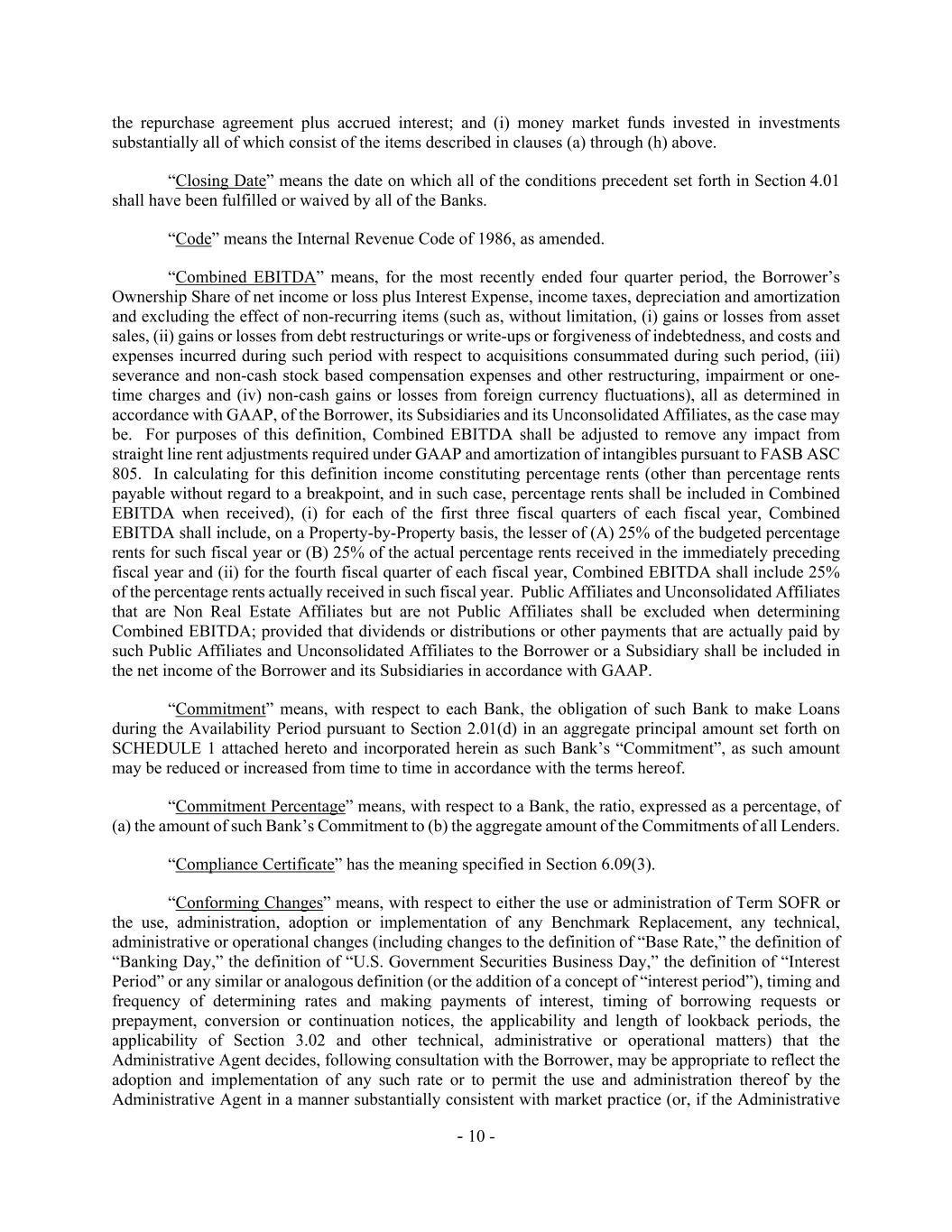 - 10 - the repurchase agreement plus accrued interest; and (i) money market funds invested in investments substantially all of which consist of the items described in clauses (a) through (h) above. “Closing Date” means the date on which all of the conditions precedent set forth in Section 4.01 shall have been fulfilled or waived by all of the Banks. “Code” means the Internal Revenue Code of 1986, as amended. “Combined EBITDA” means, for the most recently ended four quarter period, the Borrower’s Ownership Share of net income or loss plus Interest Expense, income taxes, depreciation and amortization and excluding the effect of non-recurring items (such as, without limitation, (i) gains or losses from asset sales, (ii) gains or losses from debt restructurings or write-ups or forgiveness of indebtedness, and costs and expenses incurred during such period with respect to acquisitions consummated during such period, (iii) severance and non-cash stock based compensation expenses and other restructuring, impairment or one- time charges and (iv) non-cash gains or losses from foreign currency fluctuations), all as determined in accordance with GAAP, of the Borrower, its Subsidiaries and its Unconsolidated Affiliates, as the case may be. For purposes of this definition, Combined EBITDA shall be adjusted to remove any impact from straight line rent adjustments required under GAAP and amortization of intangibles pursuant to FASB ASC 805. In calculating for this definition income constituting percentage rents (other than percentage rents payable without regard to a breakpoint, and in such case, percentage rents shall be included in Combined EBITDA when received), (i) for each of the first three fiscal quarters of each fiscal year, Combined EBITDA shall include, on a Property-by-Property basis, the lesser of (A) 25% of the budgeted percentage rents for such fiscal year or (B) 25% of the actual percentage rents received in the immediately preceding fiscal year and (ii) for the fourth fiscal quarter of each fiscal year, Combined EBITDA shall include 25% of the percentage rents actually received in such fiscal year. Public Affiliates and Unconsolidated Affiliates that are Non Real Estate Affiliates but are not Public Affiliates shall be excluded when determining Combined EBITDA; provided that dividends or distributions or other payments that are actually paid by such Public Affiliates and Unconsolidated Affiliates to the Borrower or a Subsidiary shall be included in the net income of the Borrower and its Subsidiaries in accordance with GAAP. “Commitment” means, with respect to each Bank, the obligation of such Bank to make Loans during the Availability Period pursuant to Section 2.01(d) in an aggregate principal amount set forth on SCHEDULE 1 attached hereto and incorporated herein as such Bank’s “Commitment”, as such amount may be reduced or increased from time to time in accordance with the terms hereof. “Commitment Percentage” means, with respect to a Bank, the ratio, expressed as a percentage, of (a) the amount of such Bank’s Commitment to (b) the aggregate amount of the Commitments of all Lenders. “Compliance Certificate” has the meaning specified in Section 6.09(3). “Conforming Changes” means, with respect to either the use or administration of Term SOFR or the use, administration, adoption or implementation of any Benchmark Replacement, any technical, administrative or operational changes (including changes to the definition of “Base Rate,” the definition of “Banking Day,” the definition of “U.S. Government Securities Business Day,” the definition of “Interest Period” or any similar or analogous definition (or the addition of a concept of “interest period”), timing and frequency of determining rates and making payments of interest, timing of borrowing requests or prepayment, conversion or continuation notices, the applicability and length of lookback periods, the applicability of Section 3.02 and other technical, administrative or operational matters) that the Administrative Agent decides, following consultation with the Borrower, may be appropriate to reflect the adoption and implementation of any such rate or to permit the use and administration thereof by the Administrative Agent in a manner substantially consistent with market practice (or, if the Administrative