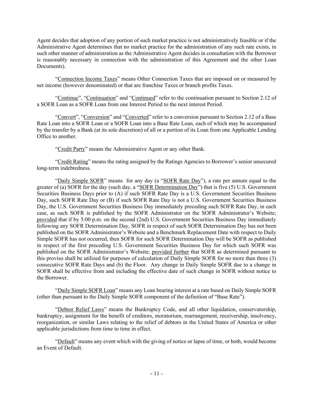 - 11 - Agent decides that adoption of any portion of such market practice is not administratively feasible or if the Administrative Agent determines that no market practice for the administration of any such rate exists, in such other manner of administration as the Administrative Agent decides in consultation with the Borrower is reasonably necessary in connection with the administration of this Agreement and the other Loan Documents). “Connection Income Taxes” means Other Connection Taxes that are imposed on or measured by net income (however denominated) or that are franchise Taxes or branch profits Taxes. “Continue”, “Continuation” and “Continued” refer to the continuation pursuant to Section 2.12 of a SOFR Loan as a SOFR Loan from one Interest Period to the next interest Period. “Convert”, “Conversion” and “Converted” refer to a conversion pursuant to Section 2.12 of a Base Rate Loan into a SOFR Loan or a SOFR Loan into a Base Rate Loan, each of which may be accompanied by the transfer by a Bank (at its sole discretion) of all or a portion of its Loan from one Applicable Lending Office to another. “Credit Party” means the Administrative Agent or any other Bank. “Credit Rating” means the rating assigned by the Ratings Agencies to Borrower’s senior unsecured long-term indebtedness. “Daily Simple SOFR” means for any day (a “SOFR Rate Day”), a rate per annum equal to the greater of (a) SOFR for the day (such day, a “SOFR Determination Day”) that is five (5) U.S. Government Securities Business Days prior to (A) if such SOFR Rate Day is a U.S. Government Securities Business Day, such SOFR Rate Day or (B) if such SOFR Rate Day is not a U.S. Government Securities Business Day, the U.S. Government Securities Business Day immediately preceding such SOFR Rate Day, in each case, as such SOFR is published by the SOFR Administrator on the SOFR Administrator’s Website; provided that if by 5:00 p.m. on the second (2nd) U.S. Government Securities Business Day immediately following any SOFR Determination Day, SOFR in respect of such SOFR Determination Day has not been published on the SOFR Administrator’s Website and a Benchmark Replacement Date with respect to Daily Simple SOFR has not occurred, then SOFR for such SOFR Determination Day will be SOFR as published in respect of the first preceding U.S. Government Securities Business Day for which such SOFR was published on the SOFR Administrator’s Website; provided further that SOFR as determined pursuant to this proviso shall be utilized for purposes of calculation of Daily Simple SOFR for no more than three (3) consecutive SOFR Rate Days and (b) the Floor. Any change in Daily Simple SOFR due to a change in SOFR shall be effective from and including the effective date of such change in SOFR without notice to the Borrower. “Daily Simple SOFR Loan” means any Loan bearing interest at a rate based on Daily Simple SOFR (other than pursuant to the Daily Simple SOFR component of the definition of “Base Rate”). “Debtor Relief Laws” means the Bankruptcy Code, and all other liquidation, conservatorship, bankruptcy, assignment for the benefit of creditors, moratorium, rearrangement, receivership, insolvency, reorganization, or similar Laws relating to the relief of debtors in the United States of America or other applicable jurisdictions from time to time in effect. “Default” means any event which with the giving of notice or lapse of time, or both, would become an Event of Default.