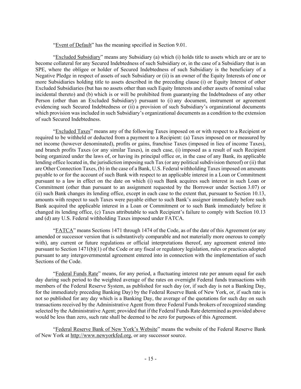 - 15 - “Event of Default” has the meaning specified in Section 9.01. “Excluded Subsidiary” means any Subsidiary (a) which (i) holds title to assets which are or are to become collateral for any Secured Indebtedness of such Subsidiary or, in the case of a Subsidiary that is an SPE, where the obligee or holder of Secured Indebtedness of such Subsidiary is the beneficiary of a Negative Pledge in respect of assets of such Subsidiary or (ii) is an owner of the Equity Interests of one or more Subsidiaries holding title to assets described in the preceding clause (i) or Equity Interest of other Excluded Subsidiaries (but has no assets other than such Equity Interests and other assets of nominal value incidental thereto) and (b) which is or will be prohibited from guarantying the Indebtedness of any other Person (other than an Excluded Subsidiary) pursuant to (i) any document, instrument or agreement evidencing such Secured Indebtedness or (ii) a provision of such Subsidiary’s organizational documents which provision was included in such Subsidiary’s organizational documents as a condition to the extension of such Secured Indebtedness. “Excluded Taxes” means any of the following Taxes imposed on or with respect to a Recipient or required to be withheld or deducted from a payment to a Recipient: (a) Taxes imposed on or measured by net income (however denominated), profits or gains, franchise Taxes (imposed in lieu of income Taxes), and branch profits Taxes (or any similar Taxes), in each case, (i) imposed as a result of such Recipient being organized under the laws of, or having its principal office or, in the case of any Bank, its applicable lending office located in, the jurisdiction imposing such Tax (or any political subdivision thereof) or (ii) that are Other Connection Taxes, (b) in the case of a Bank, U.S. Federal withholding Taxes imposed on amounts payable to or for the account of such Bank with respect to an applicable interest in a Loan or Commitment pursuant to a law in effect on the date on which (i) such Bank acquires such interest in such Loan or Commitment (other than pursuant to an assignment requested by the Borrower under Section 3.07) or (ii) such Bank changes its lending office, except in each case to the extent that, pursuant to Section 10.13, amounts with respect to such Taxes were payable either to such Bank’s assignor immediately before such Bank acquired the applicable interest in a Loan or Commitment or to such Bank immediately before it changed its lending office, (c) Taxes attributable to such Recipient’s failure to comply with Section 10.13 and (d) any U.S. Federal withholding Taxes imposed under FATCA. “FATCA” means Sections 1471 through 1474 of the Code, as of the date of this Agreement (or any amended or successor version that is substantively comparable and not materially more onerous to comply with), any current or future regulations or official interpretations thereof, any agreement entered into pursuant to Section 1471(b)(1) of the Code or any fiscal or regulatory legislation, rules or practices adopted pursuant to any intergovernmental agreement entered into in connection with the implementation of such Sections of the Code. “Federal Funds Rate” means, for any period, a fluctuating interest rate per annum equal for each day during such period to the weighted average of the rates on overnight Federal funds transactions with members of the Federal Reserve System, as published for such day (or, if such day is not a Banking Day, for the immediately preceding Banking Day) by the Federal Reserve Bank of New York, or, if such rate is not so published for any day which is a Banking Day, the average of the quotations for such day on such transactions received by the Administrative Agent from three Federal Funds brokers of recognized standing selected by the Administrative Agent; provided that if the Federal Funds Rate determined as provided above would be less than zero, such rate shall be deemed to be zero for purposes of this Agreement. “Federal Reserve Bank of New York’s Website” means the website of the Federal Reserve Bank of New York at http://www.newyorkfed.org, or any successor source.
