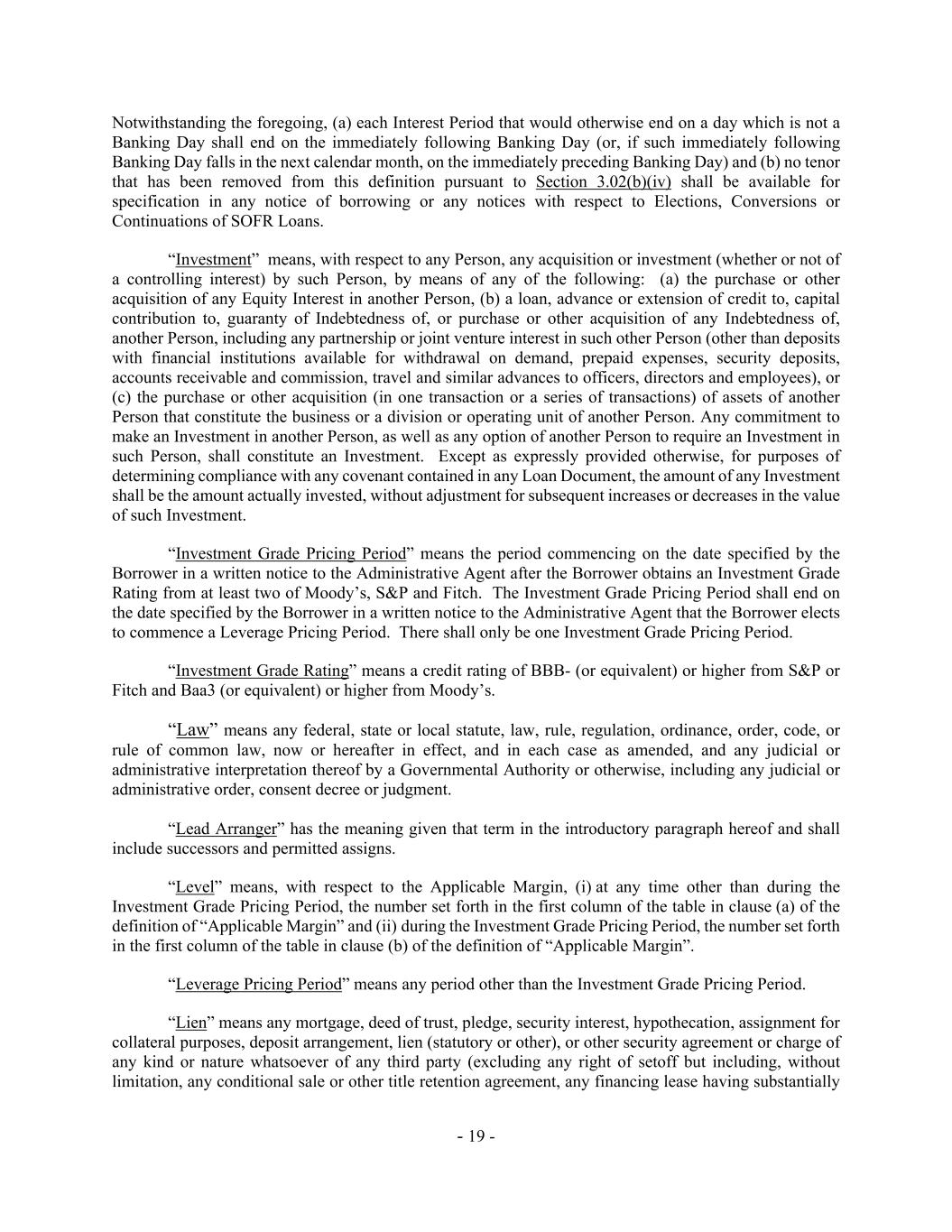 - 19 - Notwithstanding the foregoing, (a) each Interest Period that would otherwise end on a day which is not a Banking Day shall end on the immediately following Banking Day (or, if such immediately following Banking Day falls in the next calendar month, on the immediately preceding Banking Day) and (b) no tenor that has been removed from this definition pursuant to Section 3.02(b)(iv) shall be available for specification in any notice of borrowing or any notices with respect to Elections, Conversions or Continuations of SOFR Loans. “Investment” means, with respect to any Person, any acquisition or investment (whether or not of a controlling interest) by such Person, by means of any of the following: (a) the purchase or other acquisition of any Equity Interest in another Person, (b) a loan, advance or extension of credit to, capital contribution to, guaranty of Indebtedness of, or purchase or other acquisition of any Indebtedness of, another Person, including any partnership or joint venture interest in such other Person (other than deposits with financial institutions available for withdrawal on demand, prepaid expenses, security deposits, accounts receivable and commission, travel and similar advances to officers, directors and employees), or (c) the purchase or other acquisition (in one transaction or a series of transactions) of assets of another Person that constitute the business or a division or operating unit of another Person. Any commitment to make an Investment in another Person, as well as any option of another Person to require an Investment in such Person, shall constitute an Investment. Except as expressly provided otherwise, for purposes of determining compliance with any covenant contained in any Loan Document, the amount of any Investment shall be the amount actually invested, without adjustment for subsequent increases or decreases in the value of such Investment. “Investment Grade Pricing Period” means the period commencing on the date specified by the Borrower in a written notice to the Administrative Agent after the Borrower obtains an Investment Grade Rating from at least two of Moody’s, S&P and Fitch. The Investment Grade Pricing Period shall end on the date specified by the Borrower in a written notice to the Administrative Agent that the Borrower elects to commence a Leverage Pricing Period. There shall only be one Investment Grade Pricing Period. “Investment Grade Rating” means a credit rating of BBB- (or equivalent) or higher from S&P or Fitch and Baa3 (or equivalent) or higher from Moody’s. “Law” means any federal, state or local statute, law, rule, regulation, ordinance, order, code, or rule of common law, now or hereafter in effect, and in each case as amended, and any judicial or administrative interpretation thereof by a Governmental Authority or otherwise, including any judicial or administrative order, consent decree or judgment. “Lead Arranger” has the meaning given that term in the introductory paragraph hereof and shall include successors and permitted assigns. “Level” means, with respect to the Applicable Margin, (i) at any time other than during the Investment Grade Pricing Period, the number set forth in the first column of the table in clause (a) of the definition of “Applicable Margin” and (ii) during the Investment Grade Pricing Period, the number set forth in the first column of the table in clause (b) of the definition of “Applicable Margin”. “Leverage Pricing Period” means any period other than the Investment Grade Pricing Period. “Lien” means any mortgage, deed of trust, pledge, security interest, hypothecation, assignment for collateral purposes, deposit arrangement, lien (statutory or other), or other security agreement or charge of any kind or nature whatsoever of any third party (excluding any right of setoff but including, without limitation, any conditional sale or other title retention agreement, any financing lease having substantially