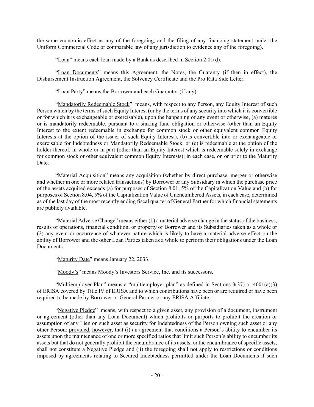 - 20 - the same economic effect as any of the foregoing, and the filing of any financing statement under the Uniform Commercial Code or comparable law of any jurisdiction to evidence any of the foregoing). “Loan” means each loan made by a Bank as described in Section 2.01(d). “Loan Documents” means this Agreement, the Notes, the Guaranty (if then in effect), the Disbursement Instruction Agreement, the Solvency Certificate and the Pro Rata Side Letter. “Loan Party” means the Borrower and each Guarantor (if any). “Mandatorily Redeemable Stock” means, with respect to any Person, any Equity Interest of such Person which by the terms of such Equity Interest (or by the terms of any security into which it is convertible or for which it is exchangeable or exercisable), upon the happening of any event or otherwise, (a) matures or is mandatorily redeemable, pursuant to a sinking fund obligation or otherwise (other than an Equity Interest to the extent redeemable in exchange for common stock or other equivalent common Equity Interests at the option of the issuer of such Equity Interest), (b) is convertible into or exchangeable or exercisable for Indebtedness or Mandatorily Redeemable Stock, or (c) is redeemable at the option of the holder thereof, in whole or in part (other than an Equity Interest which is redeemable solely in exchange for common stock or other equivalent common Equity Interests); in each case, on or prior to the Maturity Date. “Material Acquisition” means any acquisition (whether by direct purchase, merger or otherwise and whether in one or more related transactions) by Borrower or any Subsidiary in which the purchase price of the assets acquired exceeds (a) for purposes of Section 8.01, 5% of the Capitalization Value and (b) for purposes of Section 8.04, 5% of the Capitalization Value of Unencumbered Assets, in each case, determined as of the last day of the most recently ending fiscal quarter of General Partner for which financial statements are publicly available. “Material Adverse Change” means either (1) a material adverse change in the status of the business, results of operations, financial condition, or property of Borrower and its Subsidiaries taken as a whole or (2) any event or occurrence of whatever nature which is likely to have a material adverse effect on the ability of Borrower and the other Loan Parties taken as a whole to perform their obligations under the Loan Documents. “Maturity Date” means January 22, 2033. “Moody’s” means Moody’s Investors Service, Inc. and its successors. “Multiemployer Plan” means a “multiemployer plan” as defined in Sections 3(37) or 4001(a)(3) of ERISA covered by Title IV of ERISA and to which contributions have been or are required or have been required to be made by Borrower or General Partner or any ERISA Affiliate. “Negative Pledge” means, with respect to a given asset, any provision of a document, instrument or agreement (other than any Loan Document) which prohibits or purports to prohibit the creation or assumption of any Lien on such asset as security for Indebtedness of the Person owning such asset or any other Person; provided, however, that (i) an agreement that conditions a Person’s ability to encumber its assets upon the maintenance of one or more specified ratios that limit such Person’s ability to encumber its assets but that do not generally prohibit the encumbrance of its assets, or the encumbrance of specific assets, shall not constitute a Negative Pledge and (ii) the foregoing shall not apply to restrictions or conditions imposed by agreements relating to Secured Indebtedness permitted under the Loan Documents if such