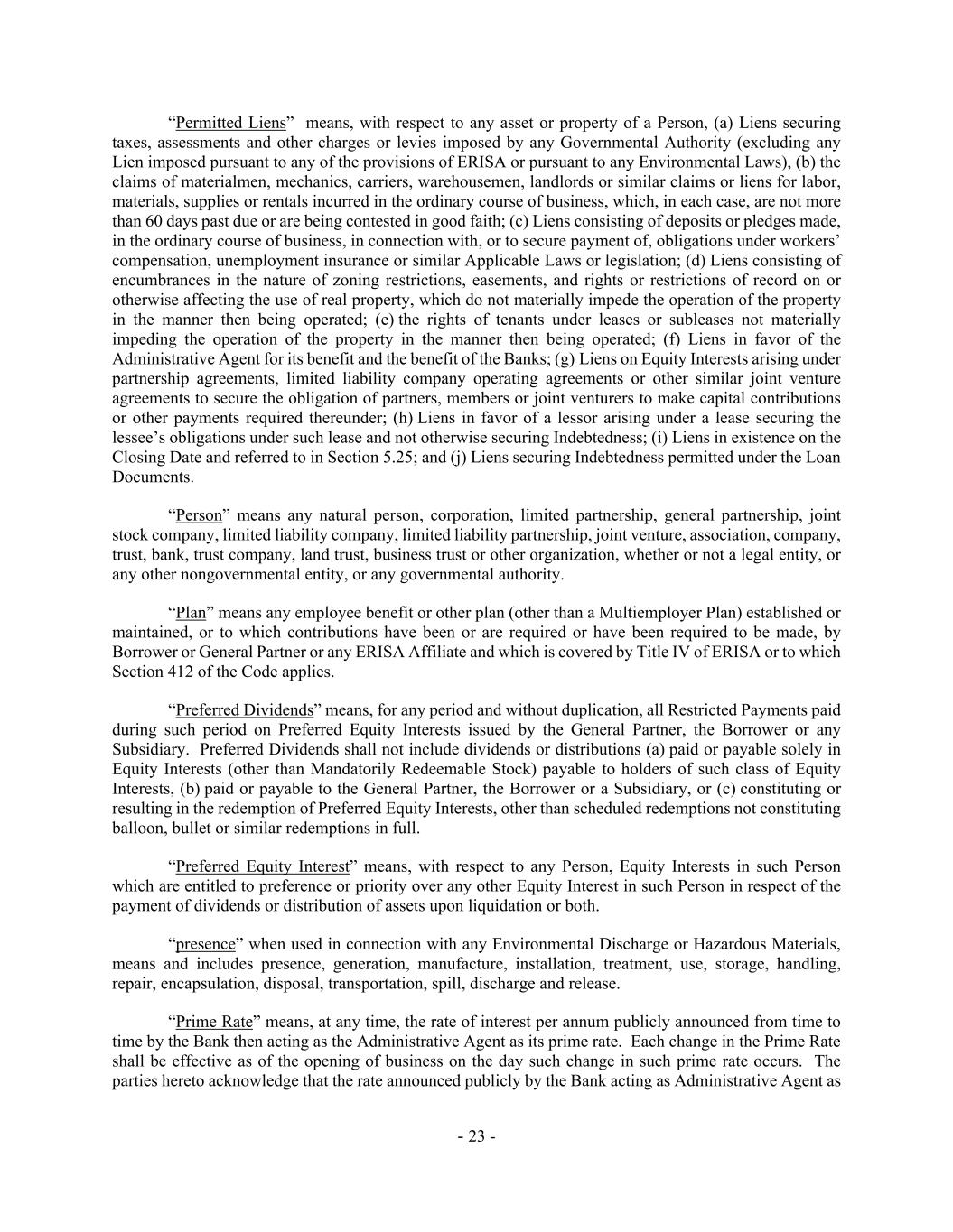 - 23 - “Permitted Liens” means, with respect to any asset or property of a Person, (a) Liens securing taxes, assessments and other charges or levies imposed by any Governmental Authority (excluding any Lien imposed pursuant to any of the provisions of ERISA or pursuant to any Environmental Laws), (b) the claims of materialmen, mechanics, carriers, warehousemen, landlords or similar claims or liens for labor, materials, supplies or rentals incurred in the ordinary course of business, which, in each case, are not more than 60 days past due or are being contested in good faith; (c) Liens consisting of deposits or pledges made, in the ordinary course of business, in connection with, or to secure payment of, obligations under workers’ compensation, unemployment insurance or similar Applicable Laws or legislation; (d) Liens consisting of encumbrances in the nature of zoning restrictions, easements, and rights or restrictions of record on or otherwise affecting the use of real property, which do not materially impede the operation of the property in the manner then being operated; (e) the rights of tenants under leases or subleases not materially impeding the operation of the property in the manner then being operated; (f) Liens in favor of the Administrative Agent for its benefit and the benefit of the Banks; (g) Liens on Equity Interests arising under partnership agreements, limited liability company operating agreements or other similar joint venture agreements to secure the obligation of partners, members or joint venturers to make capital contributions or other payments required thereunder; (h) Liens in favor of a lessor arising under a lease securing the lessee’s obligations under such lease and not otherwise securing Indebtedness; (i) Liens in existence on the Closing Date and referred to in Section 5.25; and (j) Liens securing Indebtedness permitted under the Loan Documents. “Person” means any natural person, corporation, limited partnership, general partnership, joint stock company, limited liability company, limited liability partnership, joint venture, association, company, trust, bank, trust company, land trust, business trust or other organization, whether or not a legal entity, or any other nongovernmental entity, or any governmental authority. “Plan” means any employee benefit or other plan (other than a Multiemployer Plan) established or maintained, or to which contributions have been or are required or have been required to be made, by Borrower or General Partner or any ERISA Affiliate and which is covered by Title IV of ERISA or to which Section 412 of the Code applies. “Preferred Dividends” means, for any period and without duplication, all Restricted Payments paid during such period on Preferred Equity Interests issued by the General Partner, the Borrower or any Subsidiary. Preferred Dividends shall not include dividends or distributions (a) paid or payable solely in Equity Interests (other than Mandatorily Redeemable Stock) payable to holders of such class of Equity Interests, (b) paid or payable to the General Partner, the Borrower or a Subsidiary, or (c) constituting or resulting in the redemption of Preferred Equity Interests, other than scheduled redemptions not constituting balloon, bullet or similar redemptions in full. “Preferred Equity Interest” means, with respect to any Person, Equity Interests in such Person which are entitled to preference or priority over any other Equity Interest in such Person in respect of the payment of dividends or distribution of assets upon liquidation or both. “presence” when used in connection with any Environmental Discharge or Hazardous Materials, means and includes presence, generation, manufacture, installation, treatment, use, storage, handling, repair, encapsulation, disposal, transportation, spill, discharge and release. “Prime Rate” means, at any time, the rate of interest per annum publicly announced from time to time by the Bank then acting as the Administrative Agent as its prime rate. Each change in the Prime Rate shall be effective as of the opening of business on the day such change in such prime rate occurs. The parties hereto acknowledge that the rate announced publicly by the Bank acting as Administrative Agent as