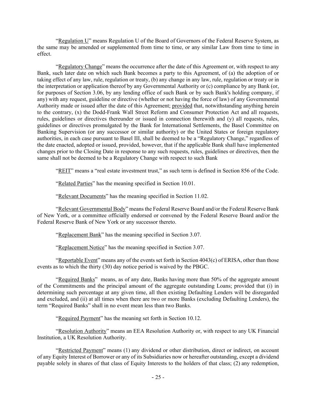 - 25 - “Regulation U” means Regulation U of the Board of Governors of the Federal Reserve System, as the same may be amended or supplemented from time to time, or any similar Law from time to time in effect. “Regulatory Change” means the occurrence after the date of this Agreement or, with respect to any Bank, such later date on which such Bank becomes a party to this Agreement, of (a) the adoption of or taking effect of any law, rule, regulation or treaty, (b) any change in any law, rule, regulation or treaty or in the interpretation or application thereof by any Governmental Authority or (c) compliance by any Bank (or, for purposes of Section 3.06, by any lending office of such Bank or by such Bank's holding company, if any) with any request, guideline or directive (whether or not having the force of law) of any Governmental Authority made or issued after the date of this Agreement; provided that, notwithstanding anything herein to the contrary, (x) the Dodd-Frank Wall Street Reform and Consumer Protection Act and all requests, rules, guidelines or directives thereunder or issued in connection therewith and (y) all requests, rules, guidelines or directives promulgated by the Bank for International Settlements, the Basel Committee on Banking Supervision (or any successor or similar authority) or the United States or foreign regulatory authorities, in each case pursuant to Basel III, shall be deemed to be a “Regulatory Change,” regardless of the date enacted, adopted or issued, provided, however, that if the applicable Bank shall have implemented changes prior to the Closing Date in response to any such requests, rules, guidelines or directives, then the same shall not be deemed to be a Regulatory Change with respect to such Bank “REIT” means a “real estate investment trust,” as such term is defined in Section 856 of the Code. “Related Parties” has the meaning specified in Section 10.01. “Relevant Documents” has the meaning specified in Section 11.02. “Relevant Governmental Body” means the Federal Reserve Board and/or the Federal Reserve Bank of New York, or a committee officially endorsed or convened by the Federal Reserve Board and/or the Federal Reserve Bank of New York or any successor thereto. “Replacement Bank” has the meaning specified in Section 3.07. “Replacement Notice” has the meaning specified in Section 3.07. “Reportable Event” means any of the events set forth in Section 4043(c) of ERISA, other than those events as to which the thirty (30) day notice period is waived by the PBGC. “Required Banks” means, as of any date, Banks having more than 50% of the aggregate amount of the Commitments and the principal amount of the aggregate outstanding Loans; provided that (i) in determining such percentage at any given time, all then existing Defaulting Lenders will be disregarded and excluded, and (ii) at all times when there are two or more Banks (excluding Defaulting Lenders), the term “Required Banks” shall in no event mean less than two Banks. “Required Payment” has the meaning set forth in Section 10.12. “Resolution Authority” means an EEA Resolution Authority or, with respect to any UK Financial Institution, a UK Resolution Authority. “Restricted Payment” means (1) any dividend or other distribution, direct or indirect, on account of any Equity Interest of Borrower or any of its Subsidiaries now or hereafter outstanding, except a dividend payable solely in shares of that class of Equity Interests to the holders of that class; (2) any redemption,