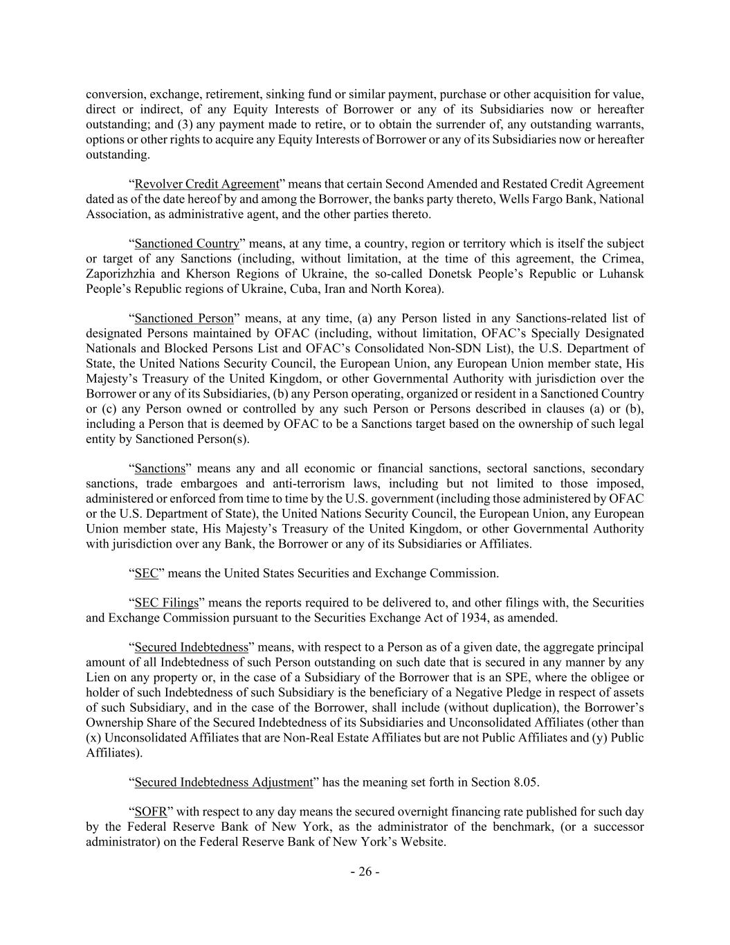- 26 - conversion, exchange, retirement, sinking fund or similar payment, purchase or other acquisition for value, direct or indirect, of any Equity Interests of Borrower or any of its Subsidiaries now or hereafter outstanding; and (3) any payment made to retire, or to obtain the surrender of, any outstanding warrants, options or other rights to acquire any Equity Interests of Borrower or any of its Subsidiaries now or hereafter outstanding. “Revolver Credit Agreement” means that certain Second Amended and Restated Credit Agreement dated as of the date hereof by and among the Borrower, the banks party thereto, Wells Fargo Bank, National Association, as administrative agent, and the other parties thereto. “Sanctioned Country” means, at any time, a country, region or territory which is itself the subject or target of any Sanctions (including, without limitation, at the time of this agreement, the Crimea, Zaporizhzhia and Kherson Regions of Ukraine, the so-called Donetsk People’s Republic or Luhansk People’s Republic regions of Ukraine, Cuba, Iran and North Korea). “Sanctioned Person” means, at any time, (a) any Person listed in any Sanctions-related list of designated Persons maintained by OFAC (including, without limitation, OFAC’s Specially Designated Nationals and Blocked Persons List and OFAC’s Consolidated Non-SDN List), the U.S. Department of State, the United Nations Security Council, the European Union, any European Union member state, His Majesty’s Treasury of the United Kingdom, or other Governmental Authority with jurisdiction over the Borrower or any of its Subsidiaries, (b) any Person operating, organized or resident in a Sanctioned Country or (c) any Person owned or controlled by any such Person or Persons described in clauses (a) or (b), including a Person that is deemed by OFAC to be a Sanctions target based on the ownership of such legal entity by Sanctioned Person(s). “Sanctions” means any and all economic or financial sanctions, sectoral sanctions, secondary sanctions, trade embargoes and anti-terrorism laws, including but not limited to those imposed, administered or enforced from time to time by the U.S. government (including those administered by OFAC or the U.S. Department of State), the United Nations Security Council, the European Union, any European Union member state, His Majesty’s Treasury of the United Kingdom, or other Governmental Authority with jurisdiction over any Bank, the Borrower or any of its Subsidiaries or Affiliates. “SEC” means the United States Securities and Exchange Commission. “SEC Filings” means the reports required to be delivered to, and other filings with, the Securities and Exchange Commission pursuant to the Securities Exchange Act of 1934, as amended. “Secured Indebtedness” means, with respect to a Person as of a given date, the aggregate principal amount of all Indebtedness of such Person outstanding on such date that is secured in any manner by any Lien on any property or, in the case of a Subsidiary of the Borrower that is an SPE, where the obligee or holder of such Indebtedness of such Subsidiary is the beneficiary of a Negative Pledge in respect of assets of such Subsidiary, and in the case of the Borrower, shall include (without duplication), the Borrower’s Ownership Share of the Secured Indebtedness of its Subsidiaries and Unconsolidated Affiliates (other than (x) Unconsolidated Affiliates that are Non-Real Estate Affiliates but are not Public Affiliates and (y) Public Affiliates). “Secured Indebtedness Adjustment” has the meaning set forth in Section 8.05. “SOFR” with respect to any day means the secured overnight financing rate published for such day by the Federal Reserve Bank of New York, as the administrator of the benchmark, (or a successor administrator) on the Federal Reserve Bank of New York’s Website.