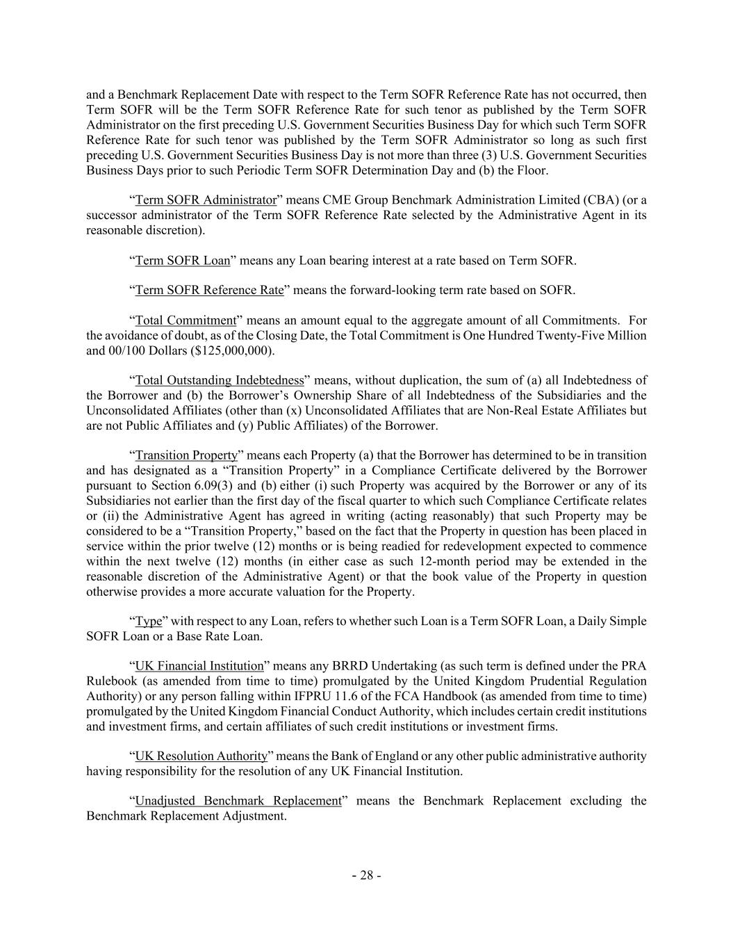 - 28 - and a Benchmark Replacement Date with respect to the Term SOFR Reference Rate has not occurred, then Term SOFR will be the Term SOFR Reference Rate for such tenor as published by the Term SOFR Administrator on the first preceding U.S. Government Securities Business Day for which such Term SOFR Reference Rate for such tenor was published by the Term SOFR Administrator so long as such first preceding U.S. Government Securities Business Day is not more than three (3) U.S. Government Securities Business Days prior to such Periodic Term SOFR Determination Day and (b) the Floor. “Term SOFR Administrator” means CME Group Benchmark Administration Limited (CBA) (or a successor administrator of the Term SOFR Reference Rate selected by the Administrative Agent in its reasonable discretion). “Term SOFR Loan” means any Loan bearing interest at a rate based on Term SOFR. “Term SOFR Reference Rate” means the forward-looking term rate based on SOFR. “Total Commitment” means an amount equal to the aggregate amount of all Commitments. For the avoidance of doubt, as of the Closing Date, the Total Commitment is One Hundred Twenty-Five Million and 00/100 Dollars ($125,000,000). “Total Outstanding Indebtedness” means, without duplication, the sum of (a) all Indebtedness of the Borrower and (b) the Borrower’s Ownership Share of all Indebtedness of the Subsidiaries and the Unconsolidated Affiliates (other than (x) Unconsolidated Affiliates that are Non-Real Estate Affiliates but are not Public Affiliates and (y) Public Affiliates) of the Borrower. “Transition Property” means each Property (a) that the Borrower has determined to be in transition and has designated as a “Transition Property” in a Compliance Certificate delivered by the Borrower pursuant to Section 6.09(3) and (b) either (i) such Property was acquired by the Borrower or any of its Subsidiaries not earlier than the first day of the fiscal quarter to which such Compliance Certificate relates or (ii) the Administrative Agent has agreed in writing (acting reasonably) that such Property may be considered to be a “Transition Property,” based on the fact that the Property in question has been placed in service within the prior twelve (12) months or is being readied for redevelopment expected to commence within the next twelve (12) months (in either case as such 12-month period may be extended in the reasonable discretion of the Administrative Agent) or that the book value of the Property in question otherwise provides a more accurate valuation for the Property. “Type” with respect to any Loan, refers to whether such Loan is a Term SOFR Loan, a Daily Simple SOFR Loan or a Base Rate Loan. “UK Financial Institution” means any BRRD Undertaking (as such term is defined under the PRA Rulebook (as amended from time to time) promulgated by the United Kingdom Prudential Regulation Authority) or any person falling within IFPRU 11.6 of the FCA Handbook (as amended from time to time) promulgated by the United Kingdom Financial Conduct Authority, which includes certain credit institutions and investment firms, and certain affiliates of such credit institutions or investment firms. “UK Resolution Authority” means the Bank of England or any other public administrative authority having responsibility for the resolution of any UK Financial Institution. “Unadjusted Benchmark Replacement” means the Benchmark Replacement excluding the Benchmark Replacement Adjustment.