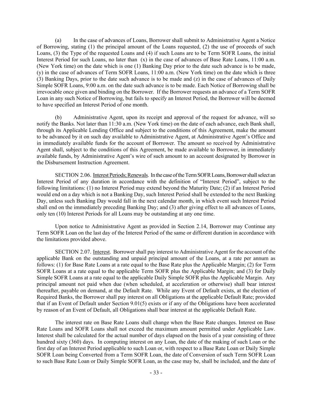 - 33 - (a) In the case of advances of Loans, Borrower shall submit to Administrative Agent a Notice of Borrowing, stating (1) the principal amount of the Loans requested, (2) the use of proceeds of such Loans, (3) the Type of the requested Loans and (4) if such Loans are to be Term SOFR Loans, the initial Interest Period for such Loans, no later than (x) in the case of advances of Base Rate Loans, 11:00 a.m. (New York time) on the date which is one (1) Banking Day prior to the date such advance is to be made, (y) in the case of advances of Term SOFR Loans, 11:00 a.m. (New York time) on the date which is three (3) Banking Days, prior to the date such advance is to be made and (z) in the case of advances of Daily Simple SOFR Loans, 9:00 a.m. on the date such advance is to be made. Each Notice of Borrowing shall be irrevocable once given and binding on the Borrower. If the Borrower requests an advance of a Term SOFR Loan in any such Notice of Borrowing, but fails to specify an Interest Period, the Borrower will be deemed to have specified an Interest Period of one month. (b) Administrative Agent, upon its receipt and approval of the request for advance, will so notify the Banks. Not later than 11:30 a.m. (New York time) on the date of each advance, each Bank shall, through its Applicable Lending Office and subject to the conditions of this Agreement, make the amount to be advanced by it on such day available to Administrative Agent, at Administrative Agent’s Office and in immediately available funds for the account of Borrower. The amount so received by Administrative Agent shall, subject to the conditions of this Agreement, be made available to Borrower, in immediately available funds, by Administrative Agent’s wire of such amount to an account designated by Borrower in the Disbursement Instruction Agreement. SECTION 2.06. Interest Periods; Renewals. In the case of the Term SOFR Loans, Borrower shall select an Interest Period of any duration in accordance with the definition of “Interest Period”, subject to the following limitations: (1) no Interest Period may extend beyond the Maturity Date; (2) if an Interest Period would end on a day which is not a Banking Day, such Interest Period shall be extended to the next Banking Day, unless such Banking Day would fall in the next calendar month, in which event such Interest Period shall end on the immediately preceding Banking Day; and (3) after giving effect to all advances of Loans, only ten (10) Interest Periods for all Loans may be outstanding at any one time. Upon notice to Administrative Agent as provided in Section 2.14, Borrower may Continue any Term SOFR Loan on the last day of the Interest Period of the same or different duration in accordance with the limitations provided above. SECTION 2.07. Interest. Borrower shall pay interest to Administrative Agent for the account of the applicable Bank on the outstanding and unpaid principal amount of the Loans, at a rate per annum as follows: (1) for Base Rate Loans at a rate equal to the Base Rate plus the Applicable Margin; (2) for Term SOFR Loans at a rate equal to the applicable Term SOFR plus the Applicable Margin; and (3) for Daily Simple SOFR Loans at a rate equal to the applicable Daily Simple SOFR plus the Applicable Margin. Any principal amount not paid when due (when scheduled, at acceleration or otherwise) shall bear interest thereafter, payable on demand, at the Default Rate. While any Event of Default exists, at the election of Required Banks, the Borrower shall pay interest on all Obligations at the applicable Default Rate; provided that if an Event of Default under Section 9.01(5) exists or if any of the Obligations have been accelerated by reason of an Event of Default, all Obligations shall bear interest at the applicable Default Rate. The interest rate on Base Rate Loans shall change when the Base Rate changes. Interest on Base Rate Loans and SOFR Loans shall not exceed the maximum amount permitted under Applicable Law. Interest shall be calculated for the actual number of days elapsed on the basis of a year consisting of three hundred sixty (360) days. In computing interest on any Loan, the date of the making of such Loan or the first day of an Interest Period applicable to such Loan or, with respect to a Base Rate Loan or Daily Simple SOFR Loan being Converted from a Term SOFR Loan, the date of Conversion of such Term SOFR Loan to such Base Rate Loan or Daily Simple SOFR Loan, as the case may be, shall be included, and the date of