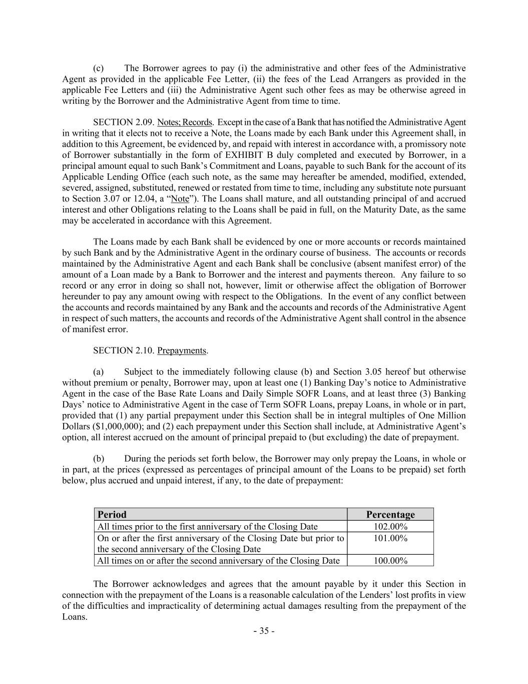 - 35 - (c) The Borrower agrees to pay (i) the administrative and other fees of the Administrative Agent as provided in the applicable Fee Letter, (ii) the fees of the Lead Arrangers as provided in the applicable Fee Letters and (iii) the Administrative Agent such other fees as may be otherwise agreed in writing by the Borrower and the Administrative Agent from time to time. SECTION 2.09. Notes; Records. Except in the case of a Bank that has notified the Administrative Agent in writing that it elects not to receive a Note, the Loans made by each Bank under this Agreement shall, in addition to this Agreement, be evidenced by, and repaid with interest in accordance with, a promissory note of Borrower substantially in the form of EXHIBIT B duly completed and executed by Borrower, in a principal amount equal to such Bank’s Commitment and Loans, payable to such Bank for the account of its Applicable Lending Office (each such note, as the same may hereafter be amended, modified, extended, severed, assigned, substituted, renewed or restated from time to time, including any substitute note pursuant to Section 3.07 or 12.04, a “Note”). The Loans shall mature, and all outstanding principal of and accrued interest and other Obligations relating to the Loans shall be paid in full, on the Maturity Date, as the same may be accelerated in accordance with this Agreement. The Loans made by each Bank shall be evidenced by one or more accounts or records maintained by such Bank and by the Administrative Agent in the ordinary course of business. The accounts or records maintained by the Administrative Agent and each Bank shall be conclusive (absent manifest error) of the amount of a Loan made by a Bank to Borrower and the interest and payments thereon. Any failure to so record or any error in doing so shall not, however, limit or otherwise affect the obligation of Borrower hereunder to pay any amount owing with respect to the Obligations. In the event of any conflict between the accounts and records maintained by any Bank and the accounts and records of the Administrative Agent in respect of such matters, the accounts and records of the Administrative Agent shall control in the absence of manifest error. SECTION 2.10. Prepayments. (a) Subject to the immediately following clause (b) and Section 3.05 hereof but otherwise without premium or penalty, Borrower may, upon at least one (1) Banking Day’s notice to Administrative Agent in the case of the Base Rate Loans and Daily Simple SOFR Loans, and at least three (3) Banking Days’ notice to Administrative Agent in the case of Term SOFR Loans, prepay Loans, in whole or in part, provided that (1) any partial prepayment under this Section shall be in integral multiples of One Million Dollars ($1,000,000); and (2) each prepayment under this Section shall include, at Administrative Agent’s option, all interest accrued on the amount of principal prepaid to (but excluding) the date of prepayment. (b) During the periods set forth below, the Borrower may only prepay the Loans, in whole or in part, at the prices (expressed as percentages of principal amount of the Loans to be prepaid) set forth below, plus accrued and unpaid interest, if any, to the date of prepayment: Period Percentage All times prior to the first anniversary of the Closing Date 102.00% On or after the first anniversary of the Closing Date but prior to the second anniversary of the Closing Date 101.00% All times on or after the second anniversary of the Closing Date 100.00% The Borrower acknowledges and agrees that the amount payable by it under this Section in connection with the prepayment of the Loans is a reasonable calculation of the Lenders’ lost profits in view of the difficulties and impracticality of determining actual damages resulting from the prepayment of the Loans.