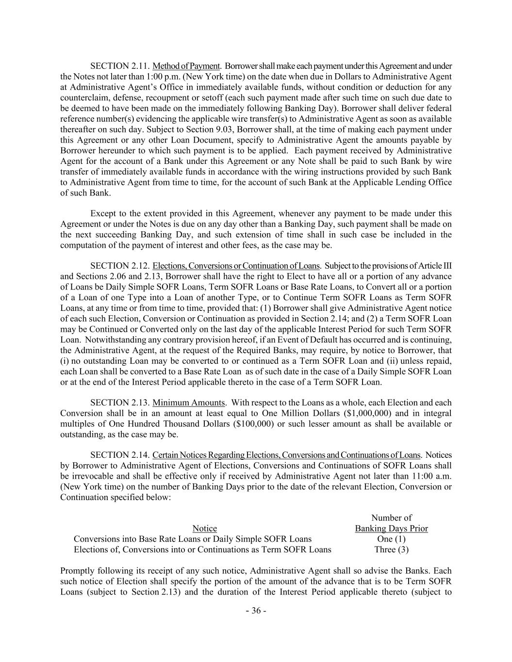- 36 - SECTION 2.11. Method of Payment. Borrower shall make each payment under this Agreement and under the Notes not later than 1:00 p.m. (New York time) on the date when due in Dollars to Administrative Agent at Administrative Agent’s Office in immediately available funds, without condition or deduction for any counterclaim, defense, recoupment or setoff (each such payment made after such time on such due date to be deemed to have been made on the immediately following Banking Day). Borrower shall deliver federal reference number(s) evidencing the applicable wire transfer(s) to Administrative Agent as soon as available thereafter on such day. Subject to Section 9.03, Borrower shall, at the time of making each payment under this Agreement or any other Loan Document, specify to Administrative Agent the amounts payable by Borrower hereunder to which such payment is to be applied. Each payment received by Administrative Agent for the account of a Bank under this Agreement or any Note shall be paid to such Bank by wire transfer of immediately available funds in accordance with the wiring instructions provided by such Bank to Administrative Agent from time to time, for the account of such Bank at the Applicable Lending Office of such Bank. Except to the extent provided in this Agreement, whenever any payment to be made under this Agreement or under the Notes is due on any day other than a Banking Day, such payment shall be made on the next succeeding Banking Day, and such extension of time shall in such case be included in the computation of the payment of interest and other fees, as the case may be. SECTION 2.12. Elections, Conversions or Continuation of Loans. Subject to the provisions of Article III and Sections 2.06 and 2.13, Borrower shall have the right to Elect to have all or a portion of any advance of Loans be Daily Simple SOFR Loans, Term SOFR Loans or Base Rate Loans, to Convert all or a portion of a Loan of one Type into a Loan of another Type, or to Continue Term SOFR Loans as Term SOFR Loans, at any time or from time to time, provided that: (1) Borrower shall give Administrative Agent notice of each such Election, Conversion or Continuation as provided in Section 2.14; and (2) a Term SOFR Loan may be Continued or Converted only on the last day of the applicable Interest Period for such Term SOFR Loan. Notwithstanding any contrary provision hereof, if an Event of Default has occurred and is continuing, the Administrative Agent, at the request of the Required Banks, may require, by notice to Borrower, that (i) no outstanding Loan may be converted to or continued as a Term SOFR Loan and (ii) unless repaid, each Loan shall be converted to a Base Rate Loan as of such date in the case of a Daily Simple SOFR Loan or at the end of the Interest Period applicable thereto in the case of a Term SOFR Loan. SECTION 2.13. Minimum Amounts. With respect to the Loans as a whole, each Election and each Conversion shall be in an amount at least equal to One Million Dollars ($1,000,000) and in integral multiples of One Hundred Thousand Dollars ($100,000) or such lesser amount as shall be available or outstanding, as the case may be. SECTION 2.14. Certain Notices Regarding Elections, Conversions and Continuations of Loans. Notices by Borrower to Administrative Agent of Elections, Conversions and Continuations of SOFR Loans shall be irrevocable and shall be effective only if received by Administrative Agent not later than 11:00 a.m. (New York time) on the number of Banking Days prior to the date of the relevant Election, Conversion or Continuation specified below: Notice Number of Banking Days Prior Conversions into Base Rate Loans or Daily Simple SOFR Loans One (1) Elections of, Conversions into or Continuations as Term SOFR Loans Three (3) Promptly following its receipt of any such notice, Administrative Agent shall so advise the Banks. Each such notice of Election shall specify the portion of the amount of the advance that is to be Term SOFR Loans (subject to Section 2.13) and the duration of the Interest Period applicable thereto (subject to