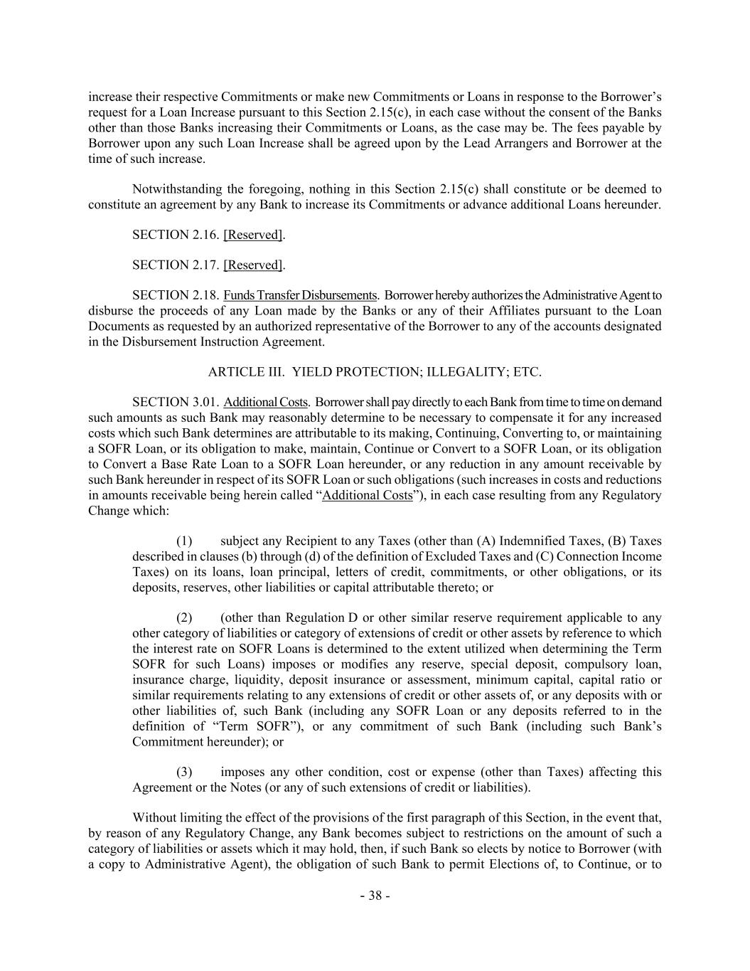 - 38 - increase their respective Commitments or make new Commitments or Loans in response to the Borrower’s request for a Loan Increase pursuant to this Section 2.15(c), in each case without the consent of the Banks other than those Banks increasing their Commitments or Loans, as the case may be. The fees payable by Borrower upon any such Loan Increase shall be agreed upon by the Lead Arrangers and Borrower at the time of such increase. Notwithstanding the foregoing, nothing in this Section 2.15(c) shall constitute or be deemed to constitute an agreement by any Bank to increase its Commitments or advance additional Loans hereunder. SECTION 2.16. [Reserved]. SECTION 2.17. [Reserved]. SECTION 2.18. Funds Transfer Disbursements. Borrower hereby authorizes the Administrative Agent to disburse the proceeds of any Loan made by the Banks or any of their Affiliates pursuant to the Loan Documents as requested by an authorized representative of the Borrower to any of the accounts designated in the Disbursement Instruction Agreement. ARTICLE III. YIELD PROTECTION; ILLEGALITY; ETC. SECTION 3.01. Additional Costs. Borrower shall pay directly to each Bank from time to time on demand such amounts as such Bank may reasonably determine to be necessary to compensate it for any increased costs which such Bank determines are attributable to its making, Continuing, Converting to, or maintaining a SOFR Loan, or its obligation to make, maintain, Continue or Convert to a SOFR Loan, or its obligation to Convert a Base Rate Loan to a SOFR Loan hereunder, or any reduction in any amount receivable by such Bank hereunder in respect of its SOFR Loan or such obligations (such increases in costs and reductions in amounts receivable being herein called “Additional Costs”), in each case resulting from any Regulatory Change which: (1) subject any Recipient to any Taxes (other than (A) Indemnified Taxes, (B) Taxes described in clauses (b) through (d) of the definition of Excluded Taxes and (C) Connection Income Taxes) on its loans, loan principal, letters of credit, commitments, or other obligations, or its deposits, reserves, other liabilities or capital attributable thereto; or (2) (other than Regulation D or other similar reserve requirement applicable to any other category of liabilities or category of extensions of credit or other assets by reference to which the interest rate on SOFR Loans is determined to the extent utilized when determining the Term SOFR for such Loans) imposes or modifies any reserve, special deposit, compulsory loan, insurance charge, liquidity, deposit insurance or assessment, minimum capital, capital ratio or similar requirements relating to any extensions of credit or other assets of, or any deposits with or other liabilities of, such Bank (including any SOFR Loan or any deposits referred to in the definition of “Term SOFR”), or any commitment of such Bank (including such Bank’s Commitment hereunder); or (3) imposes any other condition, cost or expense (other than Taxes) affecting this Agreement or the Notes (or any of such extensions of credit or liabilities). Without limiting the effect of the provisions of the first paragraph of this Section, in the event that, by reason of any Regulatory Change, any Bank becomes subject to restrictions on the amount of such a category of liabilities or assets which it may hold, then, if such Bank so elects by notice to Borrower (with a copy to Administrative Agent), the obligation of such Bank to permit Elections of, to Continue, or to