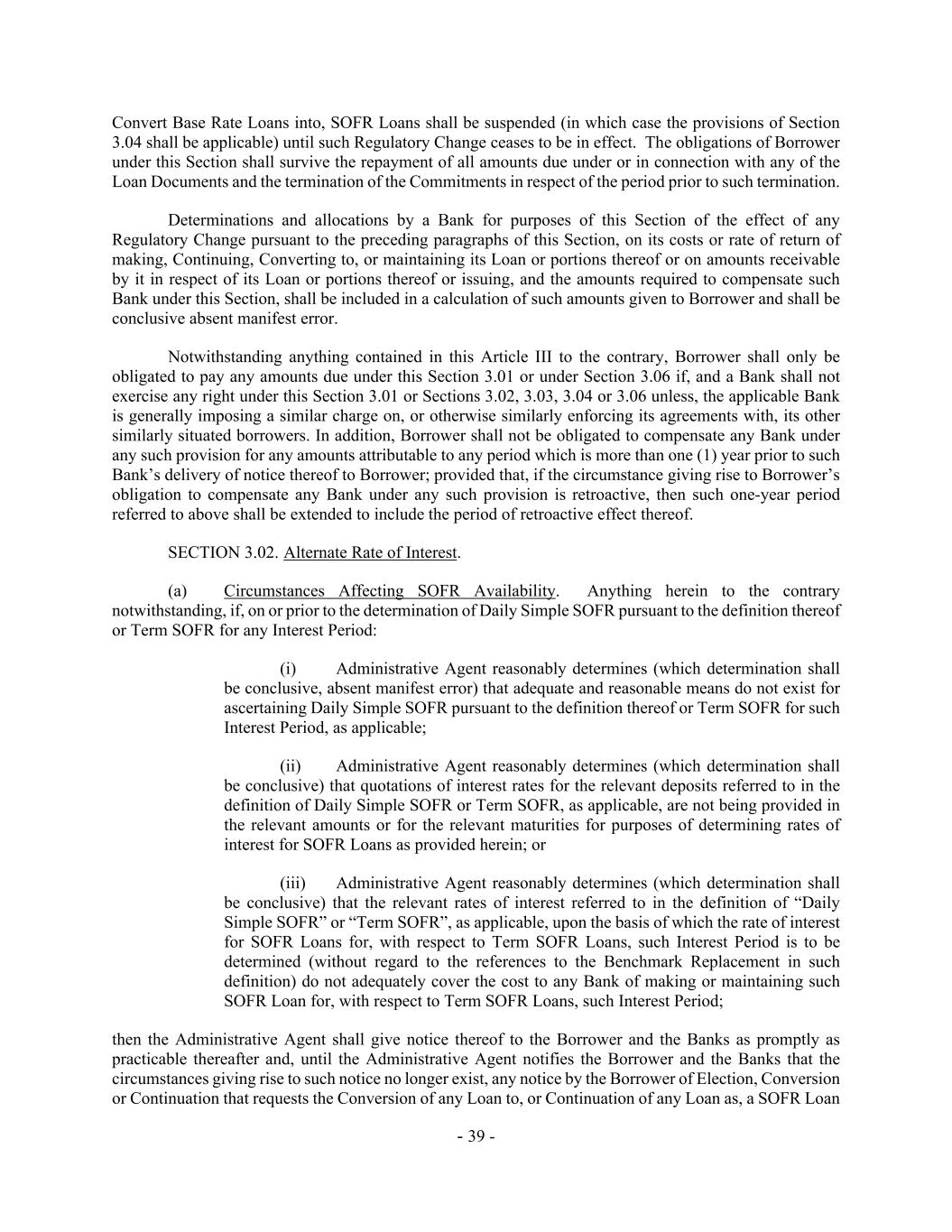 - 39 - Convert Base Rate Loans into, SOFR Loans shall be suspended (in which case the provisions of Section 3.04 shall be applicable) until such Regulatory Change ceases to be in effect. The obligations of Borrower under this Section shall survive the repayment of all amounts due under or in connection with any of the Loan Documents and the termination of the Commitments in respect of the period prior to such termination. Determinations and allocations by a Bank for purposes of this Section of the effect of any Regulatory Change pursuant to the preceding paragraphs of this Section, on its costs or rate of return of making, Continuing, Converting to, or maintaining its Loan or portions thereof or on amounts receivable by it in respect of its Loan or portions thereof or issuing, and the amounts required to compensate such Bank under this Section, shall be included in a calculation of such amounts given to Borrower and shall be conclusive absent manifest error. Notwithstanding anything contained in this Article III to the contrary, Borrower shall only be obligated to pay any amounts due under this Section 3.01 or under Section 3.06 if, and a Bank shall not exercise any right under this Section 3.01 or Sections 3.02, 3.03, 3.04 or 3.06 unless, the applicable Bank is generally imposing a similar charge on, or otherwise similarly enforcing its agreements with, its other similarly situated borrowers. In addition, Borrower shall not be obligated to compensate any Bank under any such provision for any amounts attributable to any period which is more than one (1) year prior to such Bank’s delivery of notice thereof to Borrower; provided that, if the circumstance giving rise to Borrower’s obligation to compensate any Bank under any such provision is retroactive, then such one-year period referred to above shall be extended to include the period of retroactive effect thereof. SECTION 3.02. Alternate Rate of Interest. (a) Circumstances Affecting SOFR Availability. Anything herein to the contrary notwithstanding, if, on or prior to the determination of Daily Simple SOFR pursuant to the definition thereof or Term SOFR for any Interest Period: (i) Administrative Agent reasonably determines (which determination shall be conclusive, absent manifest error) that adequate and reasonable means do not exist for ascertaining Daily Simple SOFR pursuant to the definition thereof or Term SOFR for such Interest Period, as applicable; (ii) Administrative Agent reasonably determines (which determination shall be conclusive) that quotations of interest rates for the relevant deposits referred to in the definition of Daily Simple SOFR or Term SOFR, as applicable, are not being provided in the relevant amounts or for the relevant maturities for purposes of determining rates of interest for SOFR Loans as provided herein; or (iii) Administrative Agent reasonably determines (which determination shall be conclusive) that the relevant rates of interest referred to in the definition of “Daily Simple SOFR” or “Term SOFR”, as applicable, upon the basis of which the rate of interest for SOFR Loans for, with respect to Term SOFR Loans, such Interest Period is to be determined (without regard to the references to the Benchmark Replacement in such definition) do not adequately cover the cost to any Bank of making or maintaining such SOFR Loan for, with respect to Term SOFR Loans, such Interest Period; then the Administrative Agent shall give notice thereof to the Borrower and the Banks as promptly as practicable thereafter and, until the Administrative Agent notifies the Borrower and the Banks that the circumstances giving rise to such notice no longer exist, any notice by the Borrower of Election, Conversion or Continuation that requests the Conversion of any Loan to, or Continuation of any Loan as, a SOFR Loan