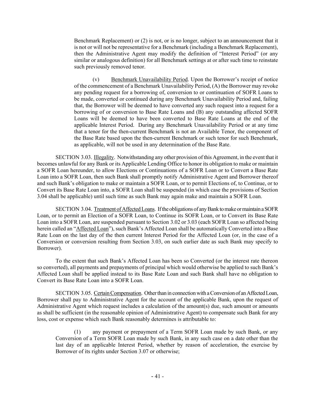 - 41 - Benchmark Replacement) or (2) is not, or is no longer, subject to an announcement that it is not or will not be representative for a Benchmark (including a Benchmark Replacement), then the Administrative Agent may modify the definition of “Interest Period” (or any similar or analogous definition) for all Benchmark settings at or after such time to reinstate such previously removed tenor. (v) Benchmark Unavailability Period. Upon the Borrower’s receipt of notice of the commencement of a Benchmark Unavailability Period, (A) the Borrower may revoke any pending request for a borrowing of, conversion to or continuation of SOFR Loans to be made, converted or continued during any Benchmark Unavailability Period and, failing that, the Borrower will be deemed to have converted any such request into a request for a borrowing of or conversion to Base Rate Loans and (B) any outstanding affected SOFR Loans will be deemed to have been converted to Base Rate Loans at the end of the applicable Interest Period. During any Benchmark Unavailability Period or at any time that a tenor for the then-current Benchmark is not an Available Tenor, the component of the Base Rate based upon the then-current Benchmark or such tenor for such Benchmark, as applicable, will not be used in any determination of the Base Rate. SECTION 3.03. Illegality. Notwithstanding any other provision of this Agreement, in the event that it becomes unlawful for any Bank or its Applicable Lending Office to honor its obligation to make or maintain a SOFR Loan hereunder, to allow Elections or Continuations of a SOFR Loan or to Convert a Base Rate Loan into a SOFR Loan, then such Bank shall promptly notify Administrative Agent and Borrower thereof and such Bank’s obligation to make or maintain a SOFR Loan, or to permit Elections of, to Continue, or to Convert its Base Rate Loan into, a SOFR Loan shall be suspended (in which case the provisions of Section 3.04 shall be applicable) until such time as such Bank may again make and maintain a SOFR Loan. SECTION 3.04. Treatment of Affected Loans. If the obligations of any Bank to make or maintain a SOFR Loan, or to permit an Election of a SOFR Loan, to Continue its SOFR Loan, or to Convert its Base Rate Loan into a SOFR Loan, are suspended pursuant to Section 3.02 or 3.03 (each SOFR Loan so affected being herein called an “Affected Loan”), such Bank’s Affected Loan shall be automatically Converted into a Base Rate Loan on the last day of the then current Interest Period for the Affected Loan (or, in the case of a Conversion or conversion resulting from Section 3.03, on such earlier date as such Bank may specify to Borrower). To the extent that such Bank’s Affected Loan has been so Converted (or the interest rate thereon so converted), all payments and prepayments of principal which would otherwise be applied to such Bank’s Affected Loan shall be applied instead to its Base Rate Loan and such Bank shall have no obligation to Convert its Base Rate Loan into a SOFR Loan. SECTION 3.05. Certain Compensation. Other than in connection with a Conversion of an Affected Loan, Borrower shall pay to Administrative Agent for the account of the applicable Bank, upon the request of Administrative Agent which request includes a calculation of the amount(s) due, such amount or amounts as shall be sufficient (in the reasonable opinion of Administrative Agent) to compensate such Bank for any loss, cost or expense which such Bank reasonably determines is attributable to: (1) any payment or prepayment of a Term SOFR Loan made by such Bank, or any Conversion of a Term SOFR Loan made by such Bank, in any such case on a date other than the last day of an applicable Interest Period, whether by reason of acceleration, the exercise by Borrower of its rights under Section 3.07 or otherwise;