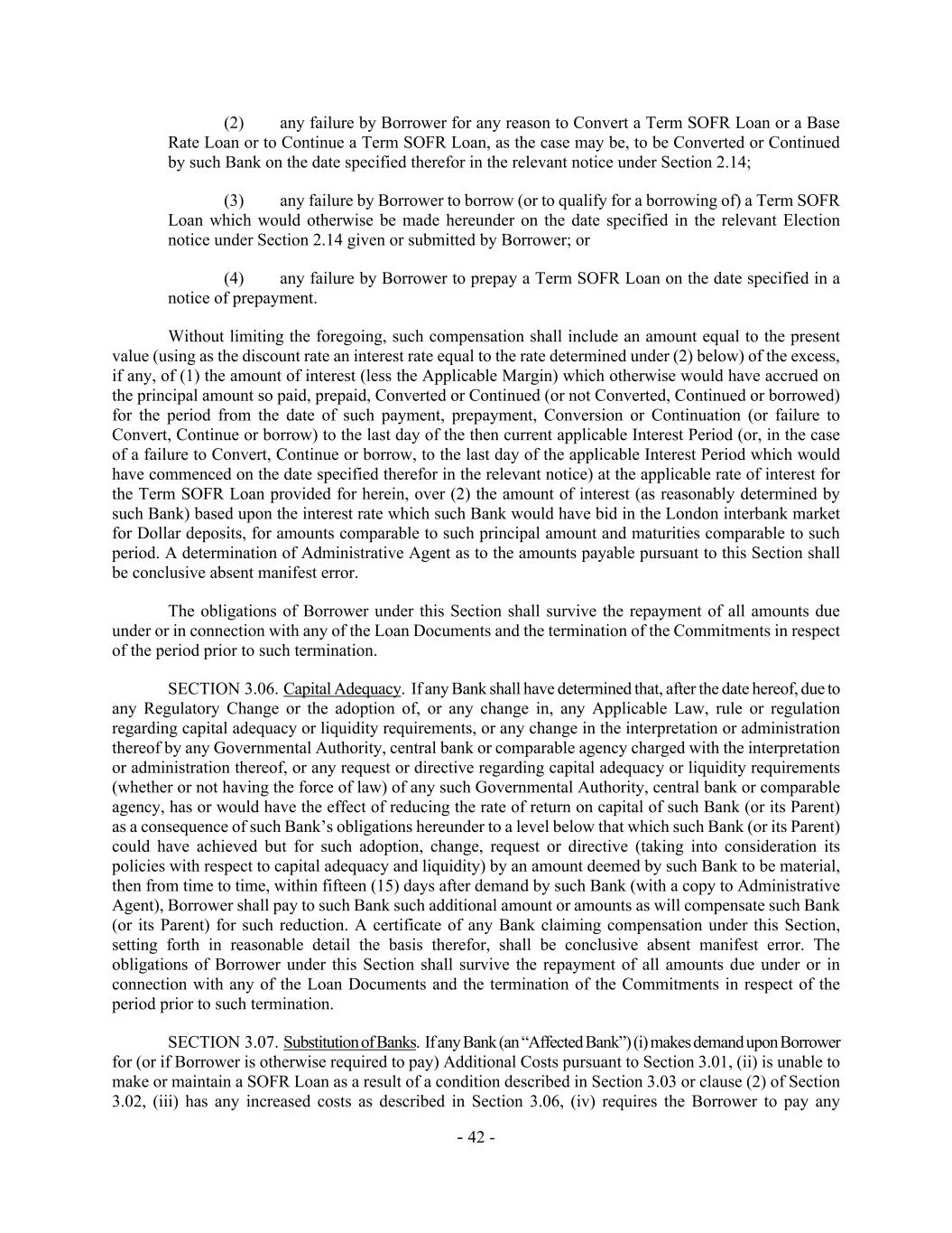 - 42 - (2) any failure by Borrower for any reason to Convert a Term SOFR Loan or a Base Rate Loan or to Continue a Term SOFR Loan, as the case may be, to be Converted or Continued by such Bank on the date specified therefor in the relevant notice under Section 2.14; (3) any failure by Borrower to borrow (or to qualify for a borrowing of) a Term SOFR Loan which would otherwise be made hereunder on the date specified in the relevant Election notice under Section 2.14 given or submitted by Borrower; or (4) any failure by Borrower to prepay a Term SOFR Loan on the date specified in a notice of prepayment. Without limiting the foregoing, such compensation shall include an amount equal to the present value (using as the discount rate an interest rate equal to the rate determined under (2) below) of the excess, if any, of (1) the amount of interest (less the Applicable Margin) which otherwise would have accrued on the principal amount so paid, prepaid, Converted or Continued (or not Converted, Continued or borrowed) for the period from the date of such payment, prepayment, Conversion or Continuation (or failure to Convert, Continue or borrow) to the last day of the then current applicable Interest Period (or, in the case of a failure to Convert, Continue or borrow, to the last day of the applicable Interest Period which would have commenced on the date specified therefor in the relevant notice) at the applicable rate of interest for the Term SOFR Loan provided for herein, over (2) the amount of interest (as reasonably determined by such Bank) based upon the interest rate which such Bank would have bid in the London interbank market for Dollar deposits, for amounts comparable to such principal amount and maturities comparable to such period. A determination of Administrative Agent as to the amounts payable pursuant to this Section shall be conclusive absent manifest error. The obligations of Borrower under this Section shall survive the repayment of all amounts due under or in connection with any of the Loan Documents and the termination of the Commitments in respect of the period prior to such termination. SECTION 3.06. Capital Adequacy. If any Bank shall have determined that, after the date hereof, due to any Regulatory Change or the adoption of, or any change in, any Applicable Law, rule or regulation regarding capital adequacy or liquidity requirements, or any change in the interpretation or administration thereof by any Governmental Authority, central bank or comparable agency charged with the interpretation or administration thereof, or any request or directive regarding capital adequacy or liquidity requirements (whether or not having the force of law) of any such Governmental Authority, central bank or comparable agency, has or would have the effect of reducing the rate of return on capital of such Bank (or its Parent) as a consequence of such Bank’s obligations hereunder to a level below that which such Bank (or its Parent) could have achieved but for such adoption, change, request or directive (taking into consideration its policies with respect to capital adequacy and liquidity) by an amount deemed by such Bank to be material, then from time to time, within fifteen (15) days after demand by such Bank (with a copy to Administrative Agent), Borrower shall pay to such Bank such additional amount or amounts as will compensate such Bank (or its Parent) for such reduction. A certificate of any Bank claiming compensation under this Section, setting forth in reasonable detail the basis therefor, shall be conclusive absent manifest error. The obligations of Borrower under this Section shall survive the repayment of all amounts due under or in connection with any of the Loan Documents and the termination of the Commitments in respect of the period prior to such termination. SECTION 3.07. Substitution of Banks. If any Bank (an “Affected Bank”) (i) makes demand upon Borrower for (or if Borrower is otherwise required to pay) Additional Costs pursuant to Section 3.01, (ii) is unable to make or maintain a SOFR Loan as a result of a condition described in Section 3.03 or clause (2) of Section 3.02, (iii) has any increased costs as described in Section 3.06, (iv) requires the Borrower to pay any