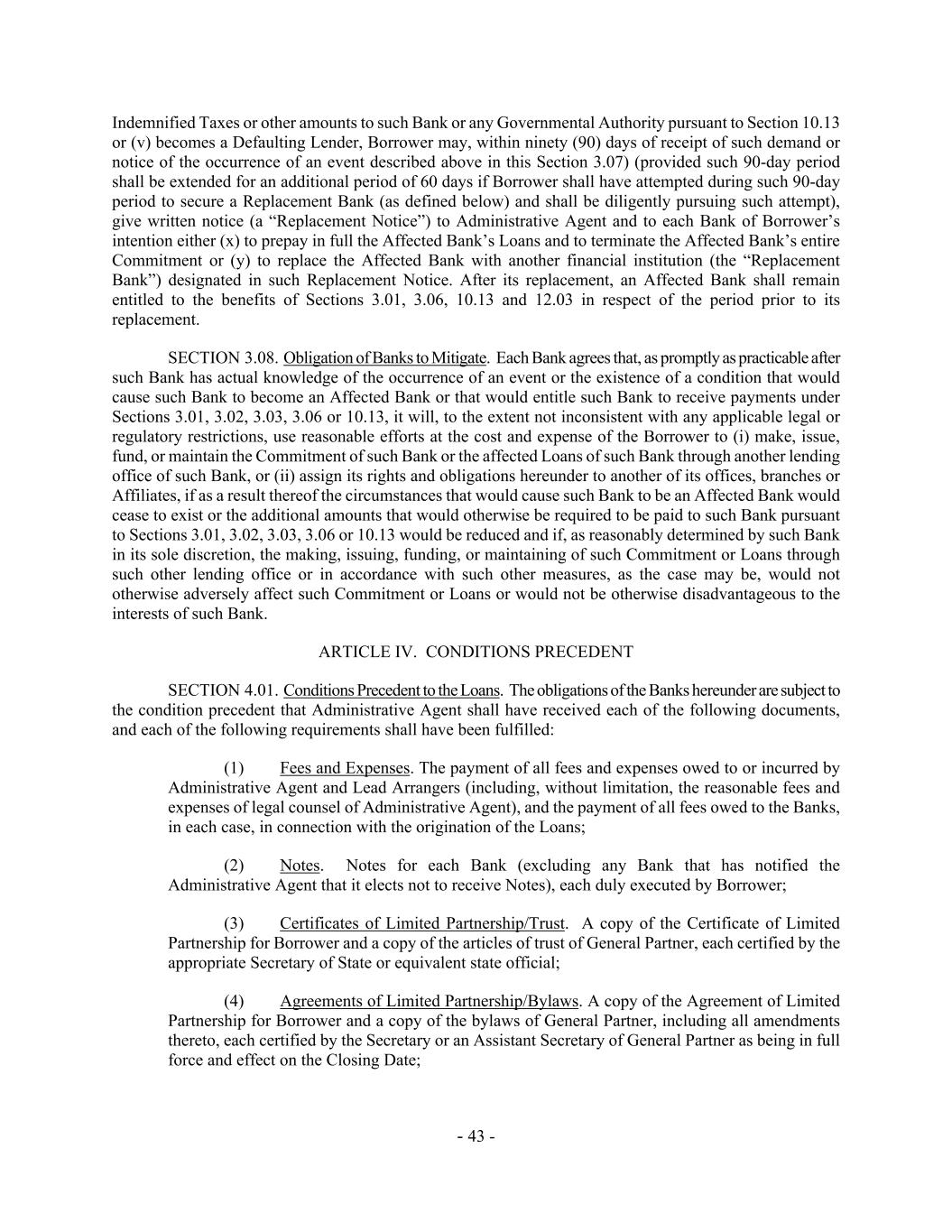 - 43 - Indemnified Taxes or other amounts to such Bank or any Governmental Authority pursuant to Section 10.13 or (v) becomes a Defaulting Lender, Borrower may, within ninety (90) days of receipt of such demand or notice of the occurrence of an event described above in this Section 3.07) (provided such 90-day period shall be extended for an additional period of 60 days if Borrower shall have attempted during such 90-day period to secure a Replacement Bank (as defined below) and shall be diligently pursuing such attempt), give written notice (a “Replacement Notice”) to Administrative Agent and to each Bank of Borrower’s intention either (x) to prepay in full the Affected Bank’s Loans and to terminate the Affected Bank’s entire Commitment or (y) to replace the Affected Bank with another financial institution (the “Replacement Bank”) designated in such Replacement Notice. After its replacement, an Affected Bank shall remain entitled to the benefits of Sections 3.01, 3.06, 10.13 and 12.03 in respect of the period prior to its replacement. SECTION 3.08. Obligation of Banks to Mitigate. Each Bank agrees that, as promptly as practicable after such Bank has actual knowledge of the occurrence of an event or the existence of a condition that would cause such Bank to become an Affected Bank or that would entitle such Bank to receive payments under Sections 3.01, 3.02, 3.03, 3.06 or 10.13, it will, to the extent not inconsistent with any applicable legal or regulatory restrictions, use reasonable efforts at the cost and expense of the Borrower to (i) make, issue, fund, or maintain the Commitment of such Bank or the affected Loans of such Bank through another lending office of such Bank, or (ii) assign its rights and obligations hereunder to another of its offices, branches or Affiliates, if as a result thereof the circumstances that would cause such Bank to be an Affected Bank would cease to exist or the additional amounts that would otherwise be required to be paid to such Bank pursuant to Sections 3.01, 3.02, 3.03, 3.06 or 10.13 would be reduced and if, as reasonably determined by such Bank in its sole discretion, the making, issuing, funding, or maintaining of such Commitment or Loans through such other lending office or in accordance with such other measures, as the case may be, would not otherwise adversely affect such Commitment or Loans or would not be otherwise disadvantageous to the interests of such Bank. ARTICLE IV. CONDITIONS PRECEDENT SECTION 4.01. Conditions Precedent to the Loans. The obligations of the Banks hereunder are subject to the condition precedent that Administrative Agent shall have received each of the following documents, and each of the following requirements shall have been fulfilled: (1) Fees and Expenses. The payment of all fees and expenses owed to or incurred by Administrative Agent and Lead Arrangers (including, without limitation, the reasonable fees and expenses of legal counsel of Administrative Agent), and the payment of all fees owed to the Banks, in each case, in connection with the origination of the Loans; (2) Notes. Notes for each Bank (excluding any Bank that has notified the Administrative Agent that it elects not to receive Notes), each duly executed by Borrower; (3) Certificates of Limited Partnership/Trust. A copy of the Certificate of Limited Partnership for Borrower and a copy of the articles of trust of General Partner, each certified by the appropriate Secretary of State or equivalent state official; (4) Agreements of Limited Partnership/Bylaws. A copy of the Agreement of Limited Partnership for Borrower and a copy of the bylaws of General Partner, including all amendments thereto, each certified by the Secretary or an Assistant Secretary of General Partner as being in full force and effect on the Closing Date;